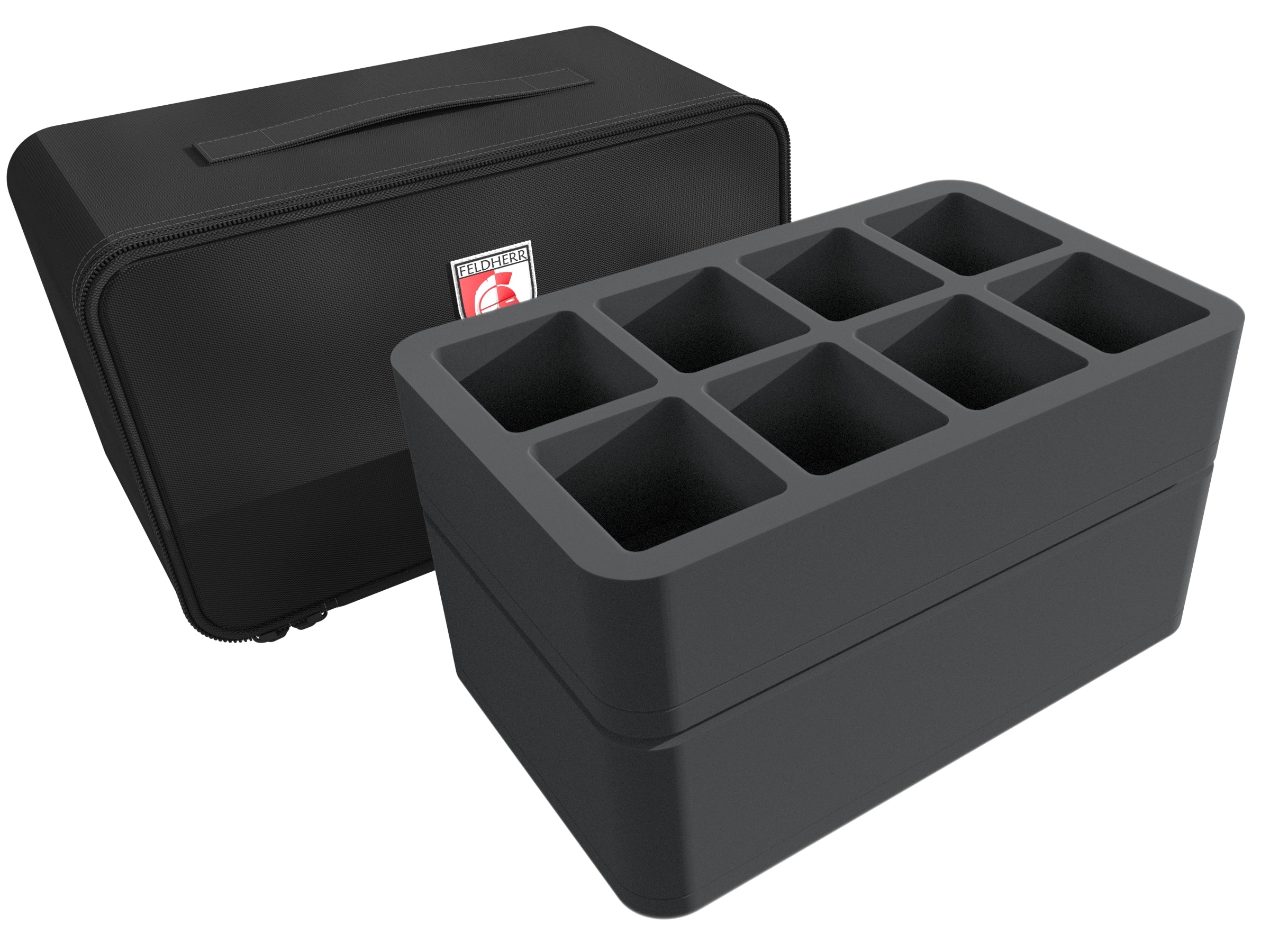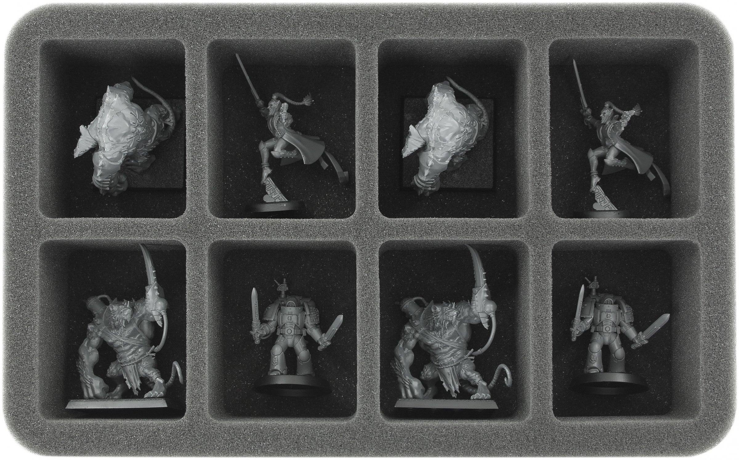 - 1 Half-Size foam tray with eight compartments for standard infantry like Cthonic Bêserks or hero models like a Kâhl, Ûthar the Destined, as well as for models with similar dimensions (HS060A063)