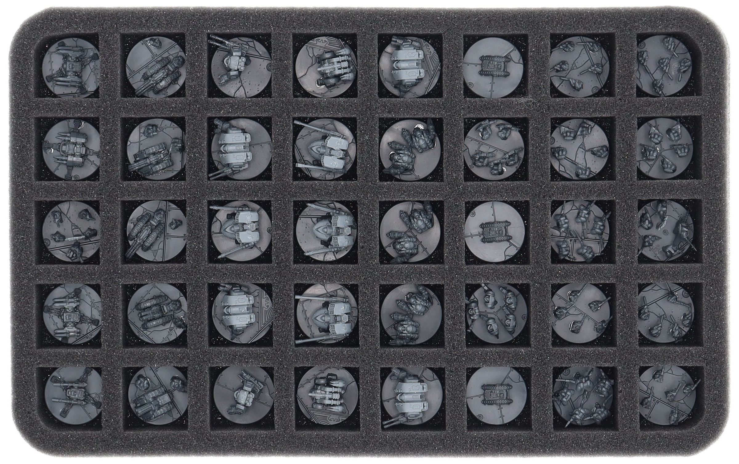 - 1 Half-Size foam trays with 40 compartments for infantry models like Space Marines, Leviathan Dreadnoughts, Legion Rapier, Legion Tarantula, Auxilia Rapier, Auxilia Tarantula, Solar Auxilia Cyclops and models with similar dimensions (HS035A071)