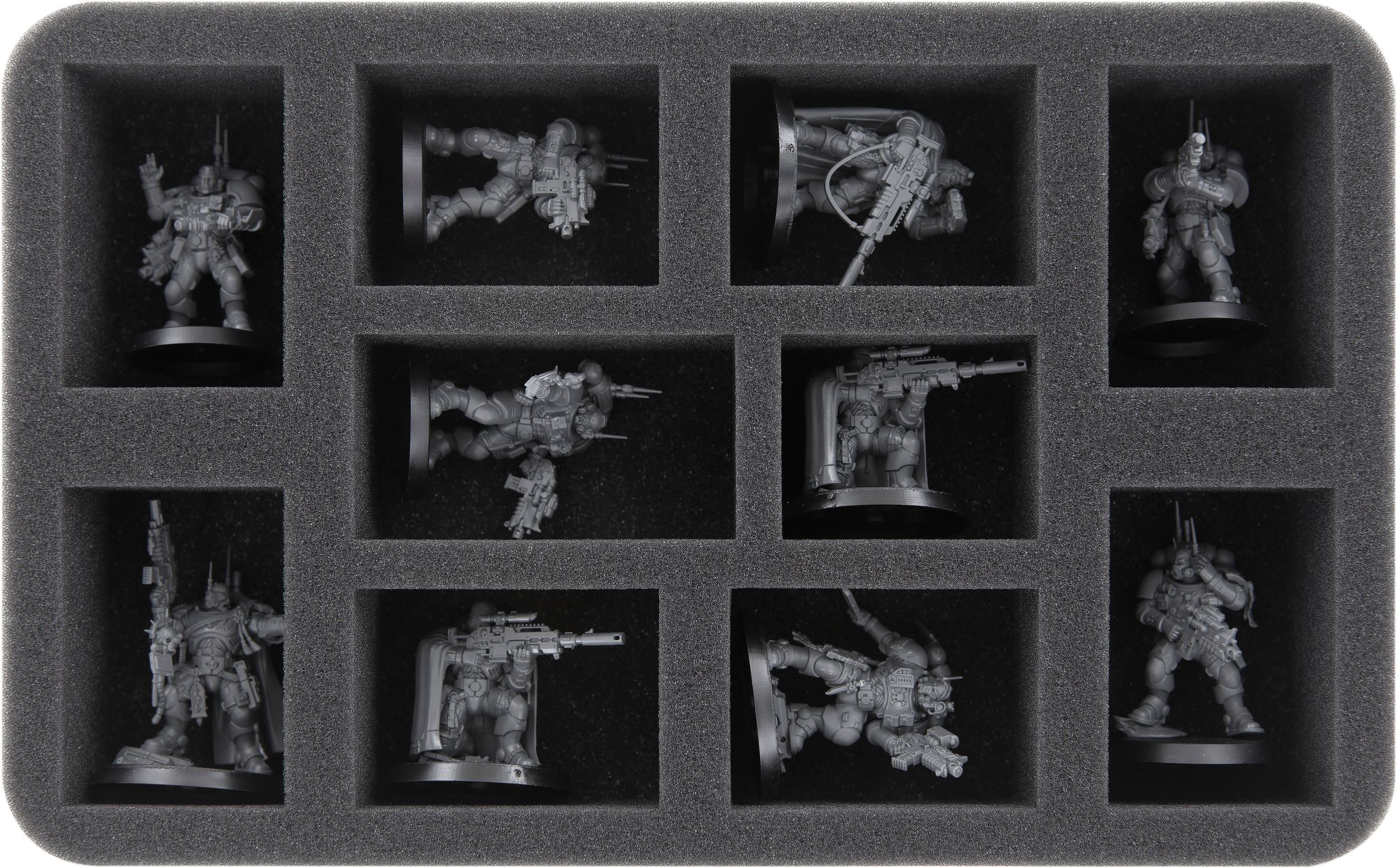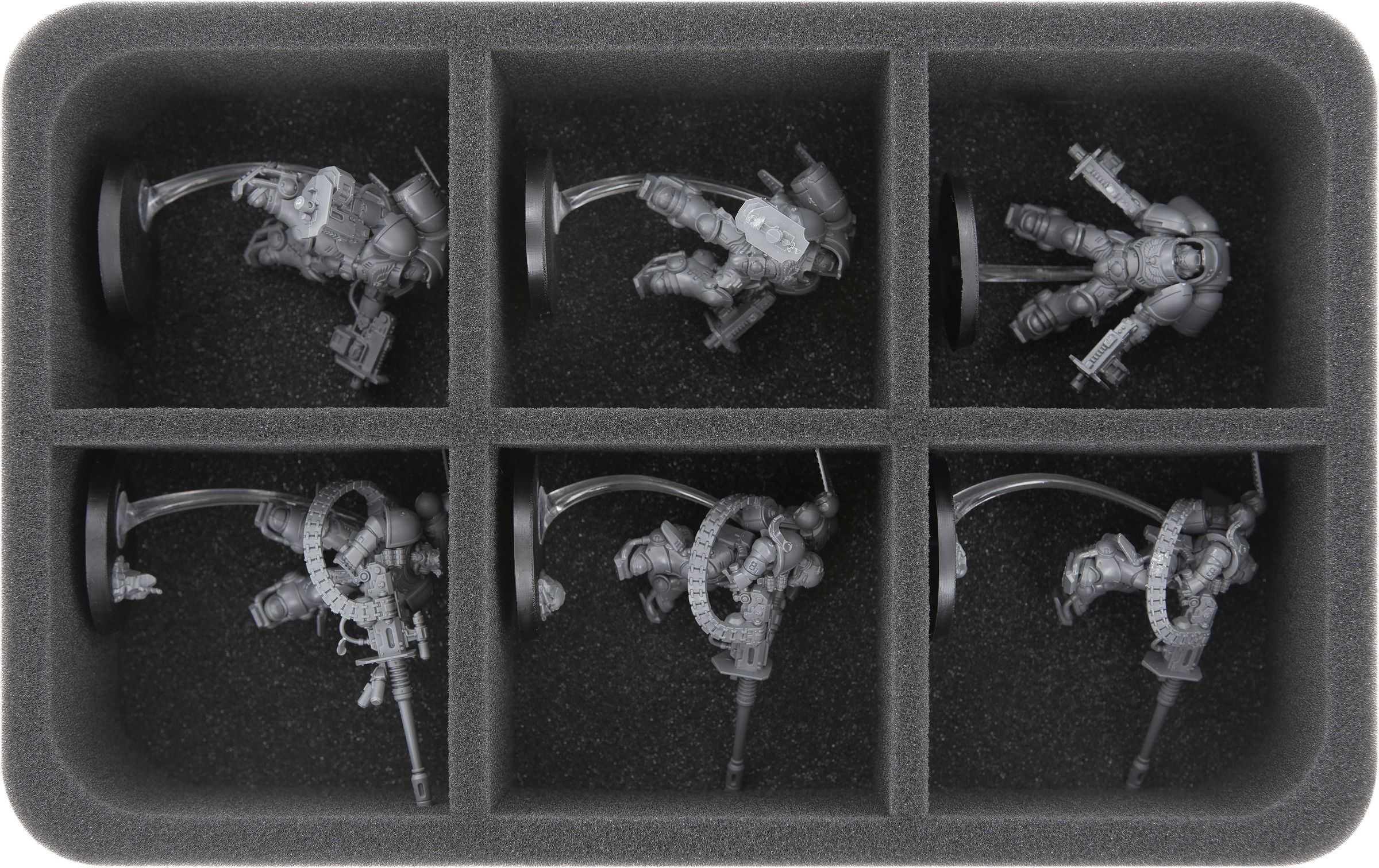 The insert with 6 large compartments offers space for the three Suppressors. The soft foam protects the sensitive parts of the fine miniatures from damage. This keeps the powerful accelerator autocannons ready for action and the fragile flying bases intact.