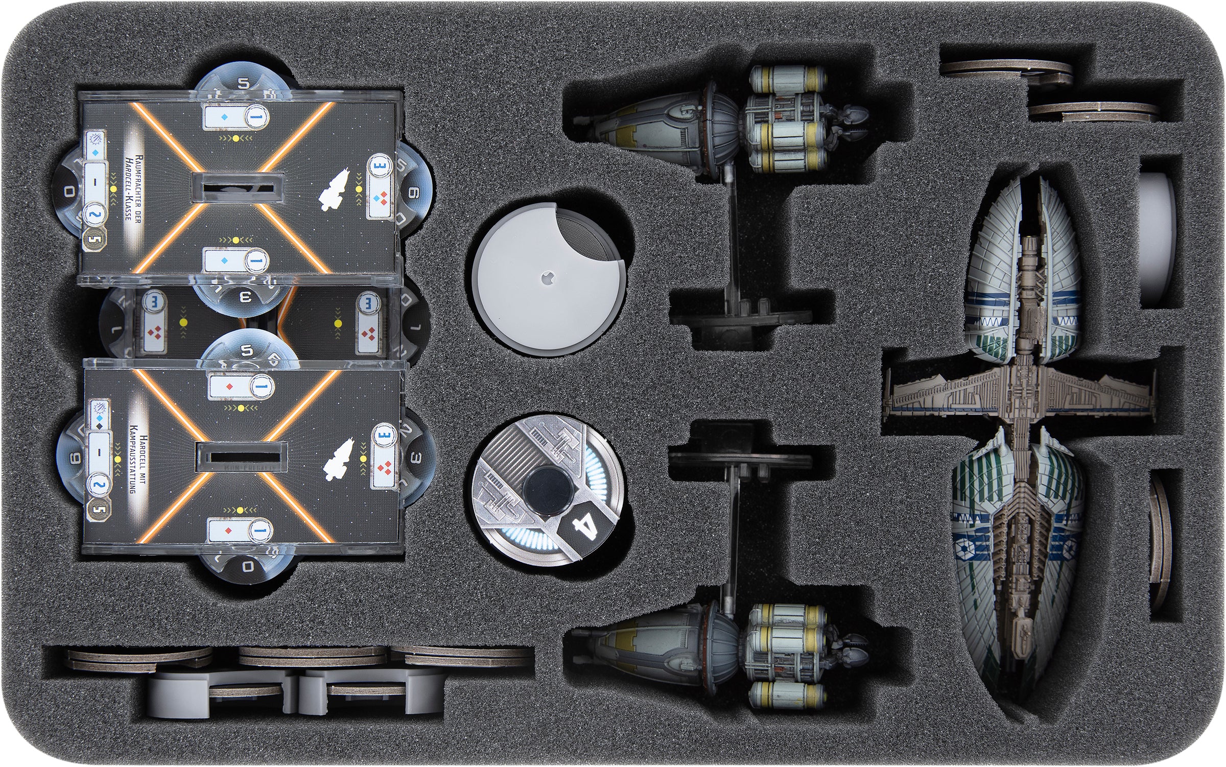 • 1 Half-Size foam tray for 2 Hardcell-class Transports + 1 Munificent-class Frigate incl. accessories (HSMFAU050BO)