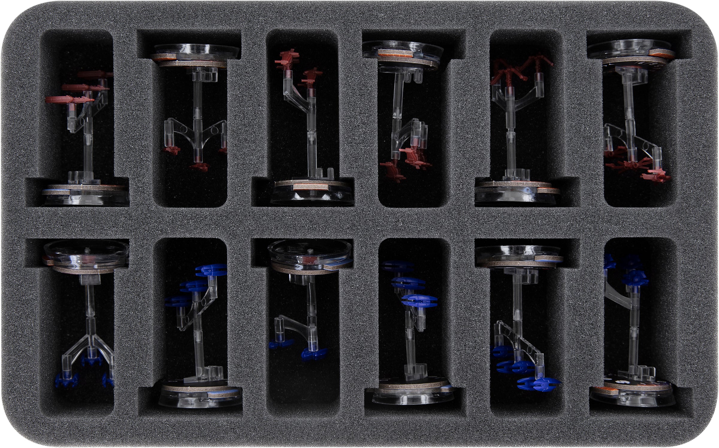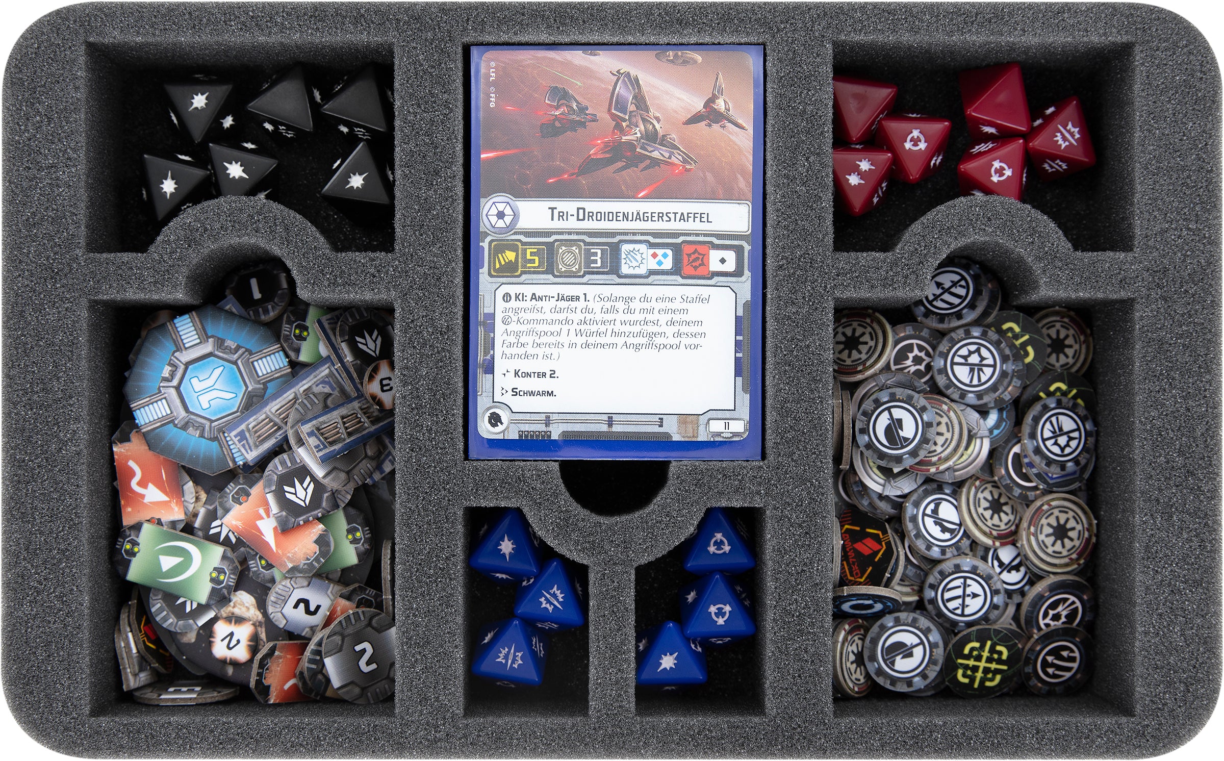 For stowing the Droid Fighter squadrons from the Fleet Starter and the 8 miniatures from the Armada Expansion Pack "Separatist Fighter Squadrons Expansion Pack" you will find the matching compartments on the second foam insert. Each of the 12 squadron miniatures including bases gets its own compartment here.