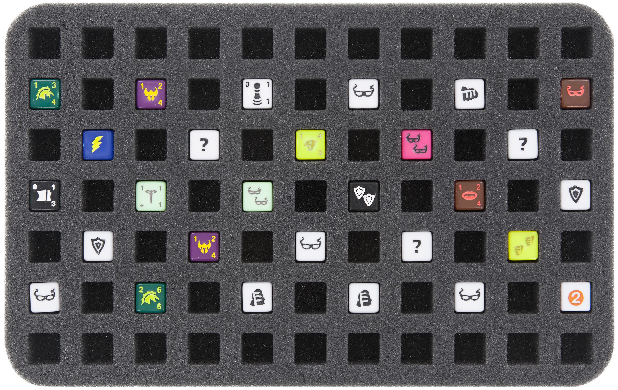 The 3 foam trays provide space for up to 231 dice with 14 mm edge length. The foam topper ensures that even the dice of the upper tray are packed all around. So you have everything compactly, clearly and securely stowed in the handy bag.