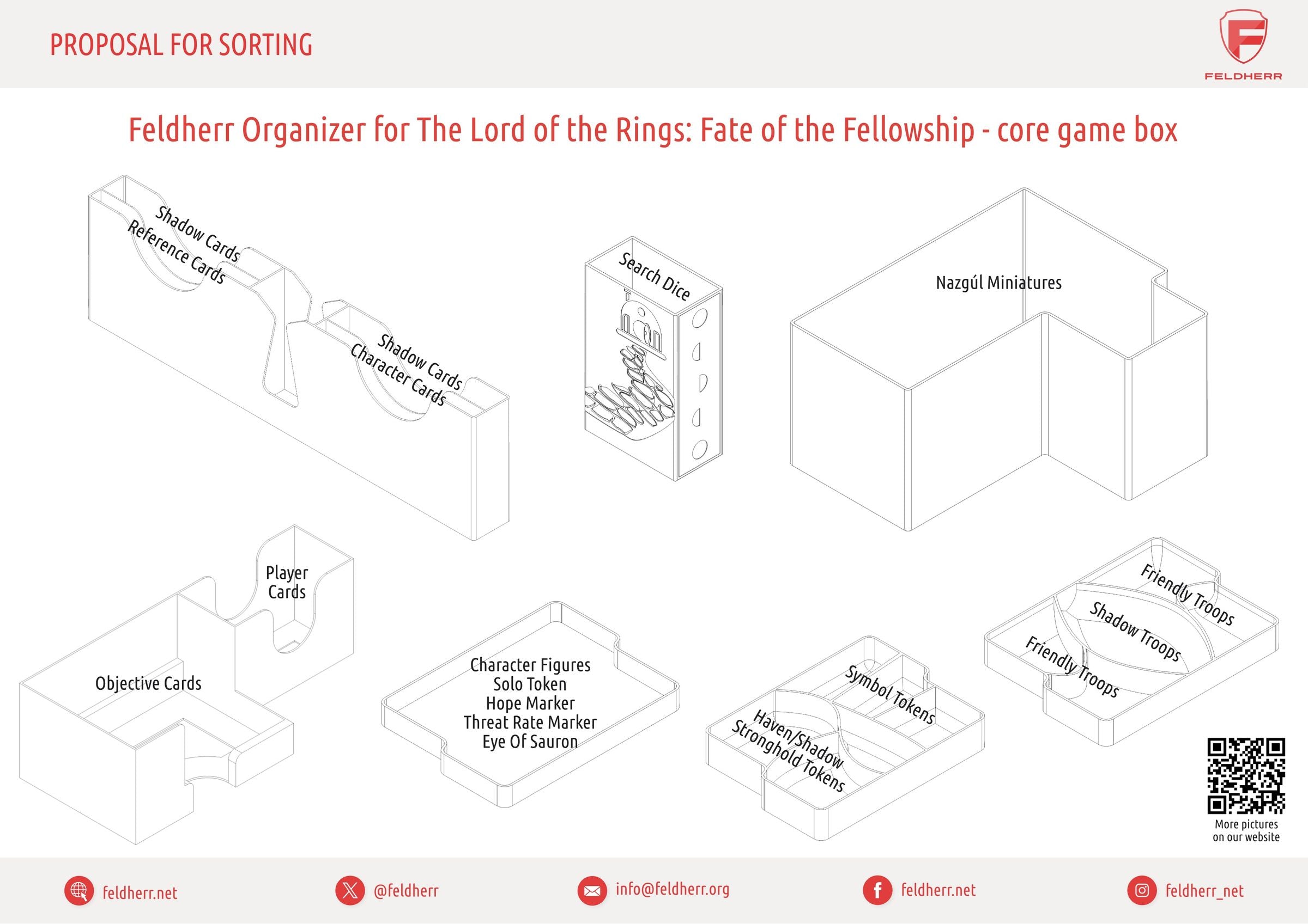On their journey through Middle-earth, Frodo and his companions face countless dangers. To help you see clearly even without the Eye of Sauron and not get lost in the game materials, this Feldherr Organizer for “The Lord of the Rings: Fate of the Fellowship” brings order to the box and structure to the gaming table - for faster setup, a clear overview, and more fun in every game.