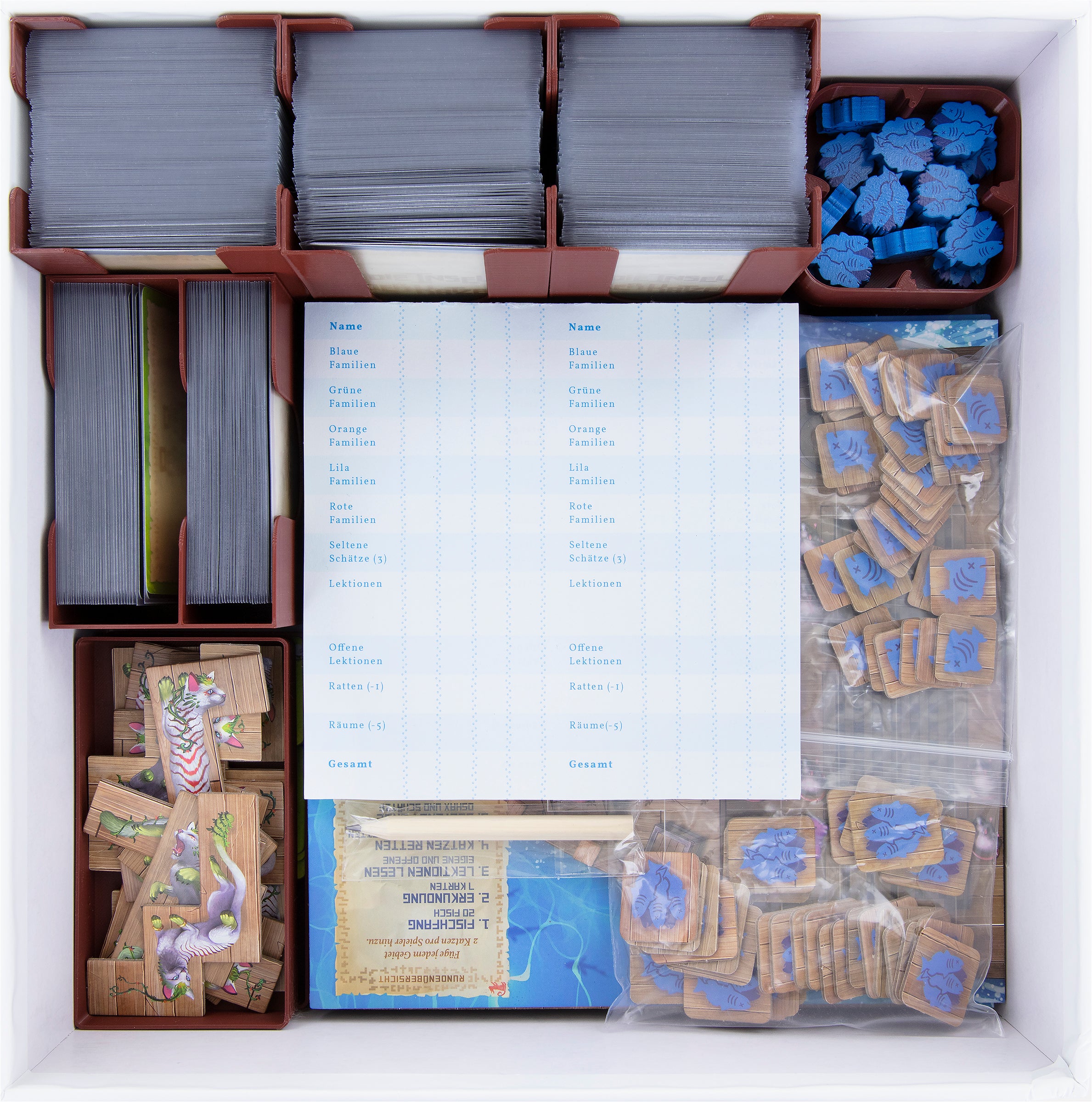 The inserts are stored around the edge of the box. Large-format game components - like player boats, scorepad, pencil, and island board - are stored in the free space inside the box. The discovery bag with the cat tiles and the rare treasures, plus the original cardboard fish tokens go on top. If you use the Organizer without the Kickstarter Pack, then sort the fish tokens into the matching token holders.