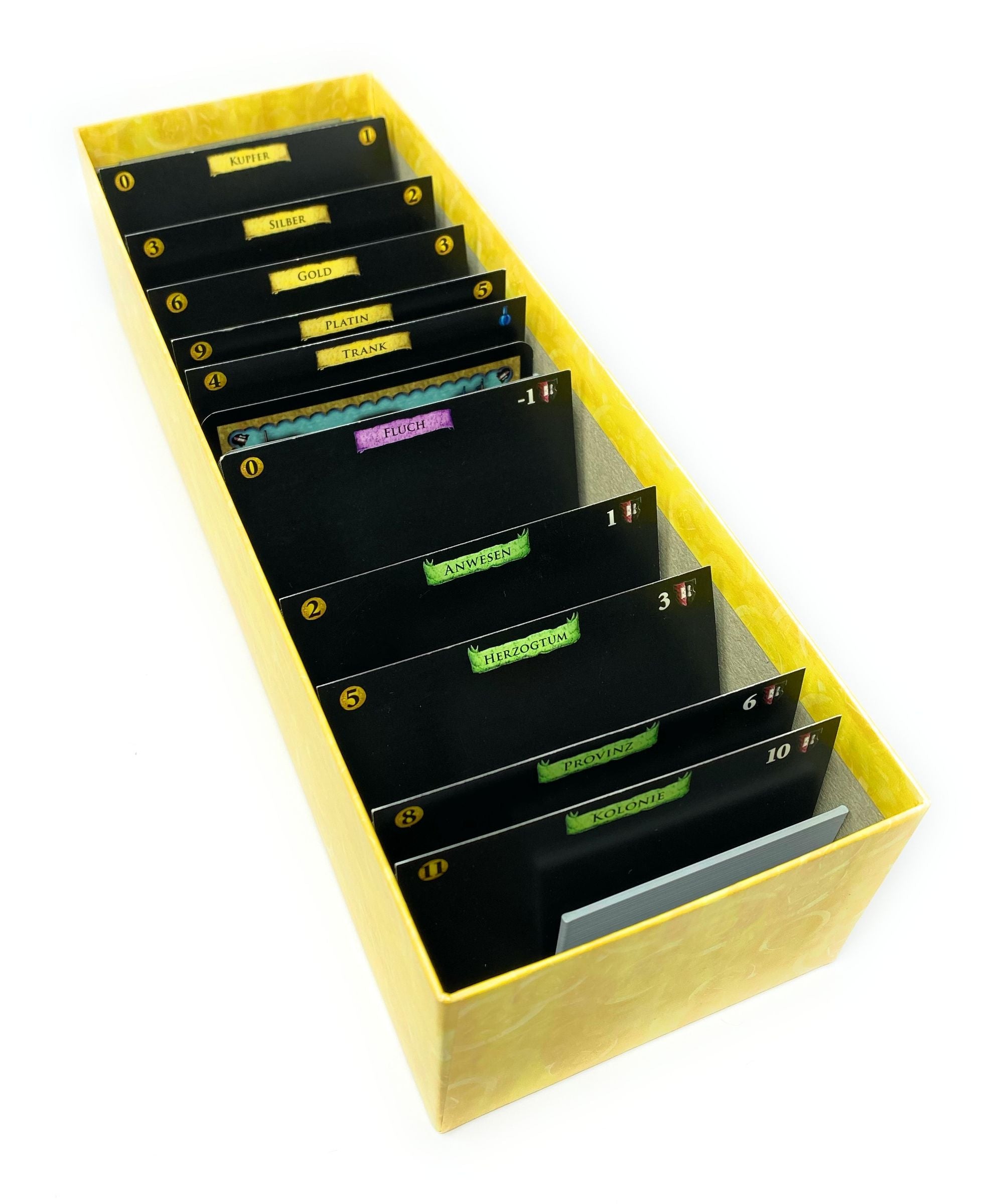 Two plastic card holders fit into the original Dominion base cards box and help you sort your base cards.