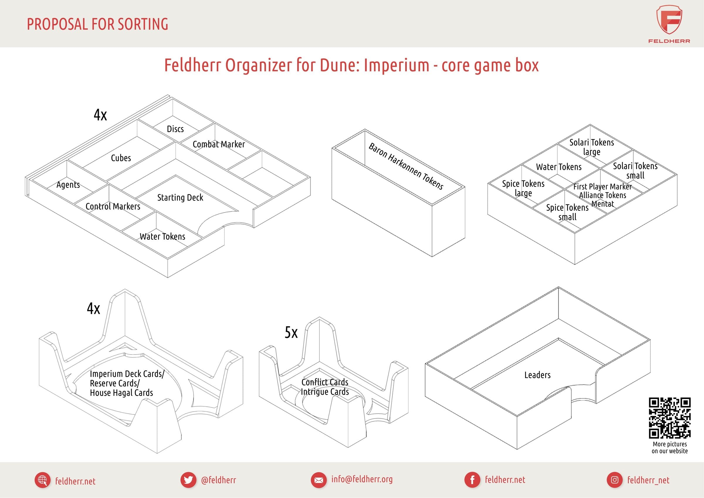 Various houses fight and scheme for supremacy on Dune. To strengthen your claim and support your house, the mentats of our design department have long racked their brains. The result is this plastic Feldherr Organizer, which keeps your core game box and the tabletop neat and tidy. Thus you have your tokens and cards always in view and the dagger in the back of your rival.