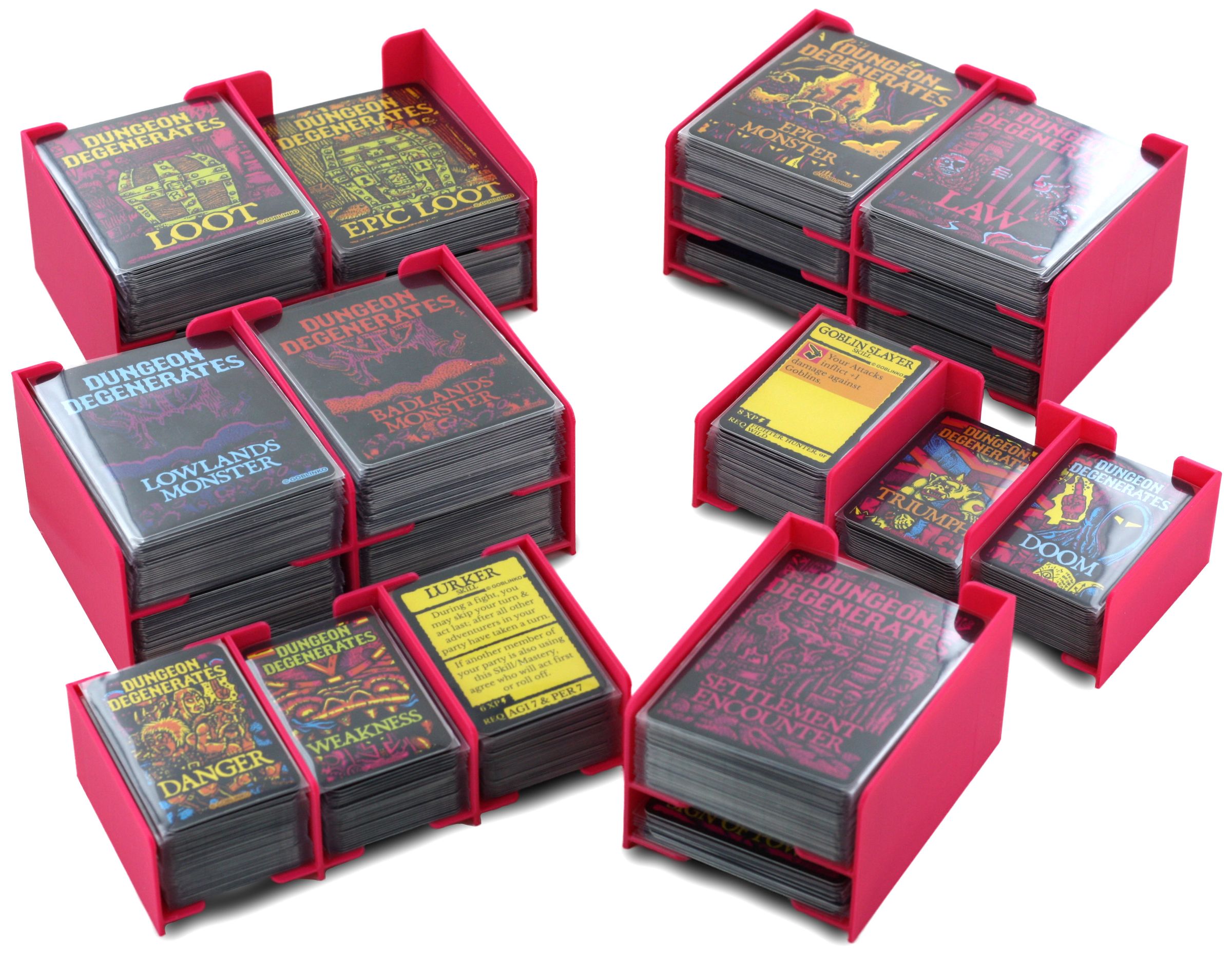 The multi-level card holders reduce the space required on the tabletop in the process. In addition, the slanted card trays are less prone to cards falling out.