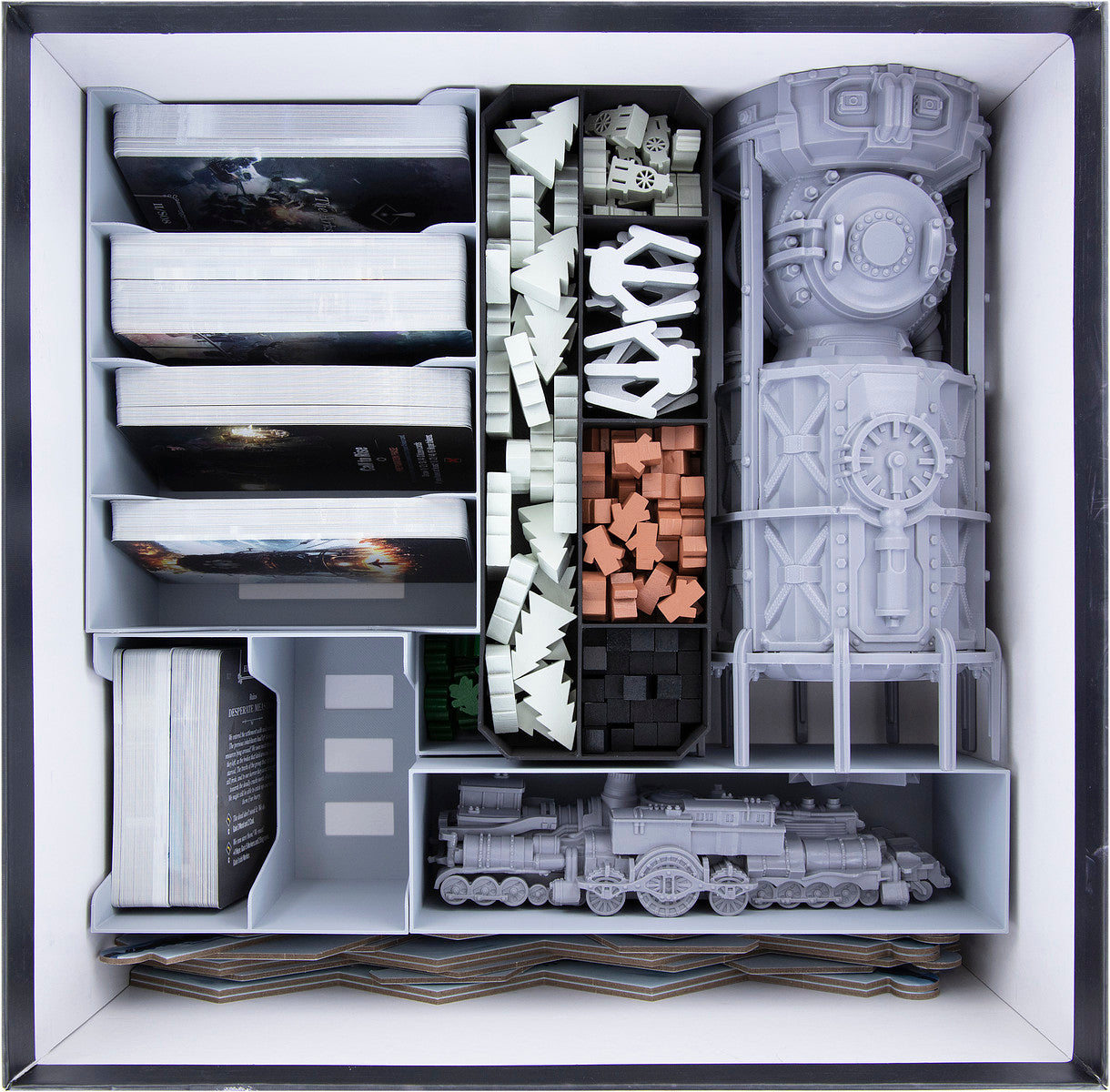 • 1 plastic token tray with five compartments for small game material such as markers (coal, wood, steam cores, automaton meeples, trees)