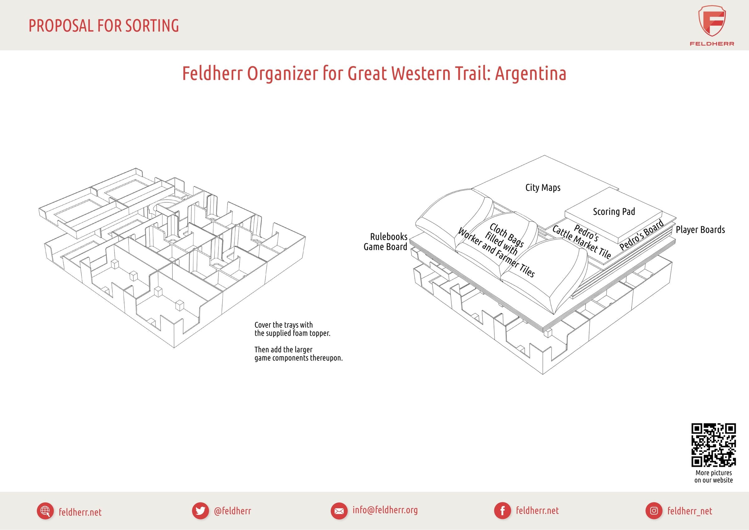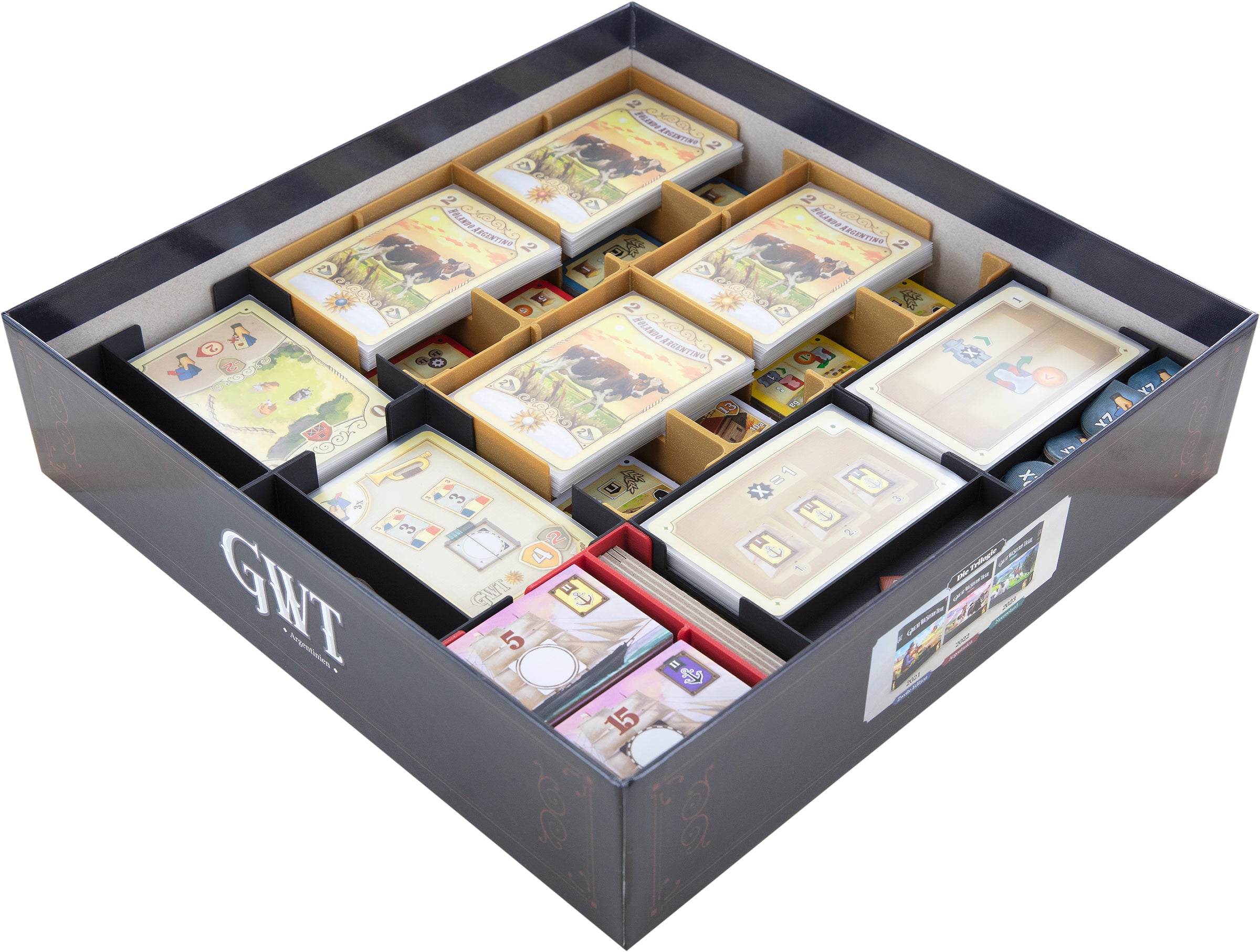 • The Organizer provides storage space for all game components from the “Great Western Trail (Second Edition)” core game, plus expansion, or for all contents of the “Great Western Trail: Argentinien” core game.