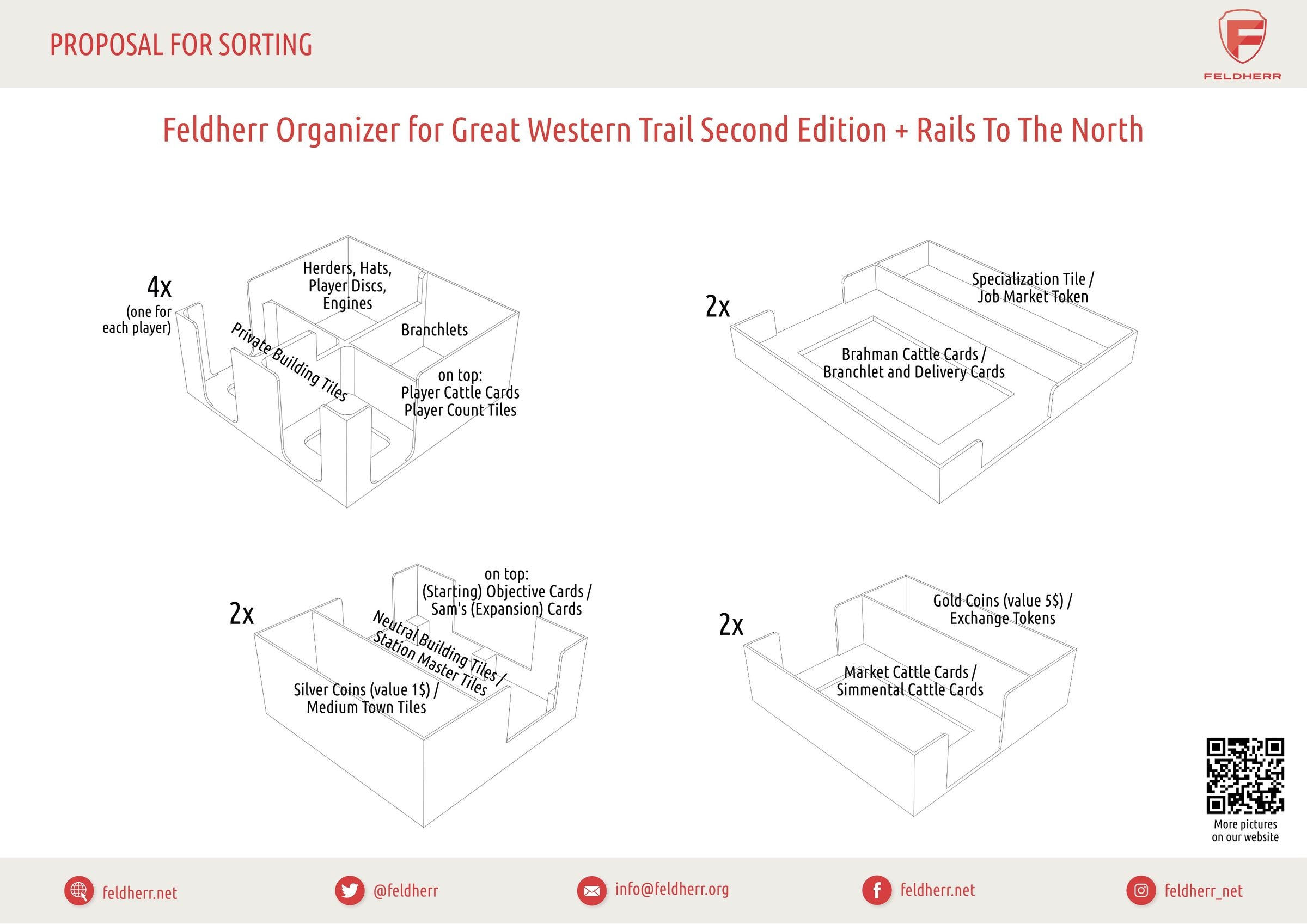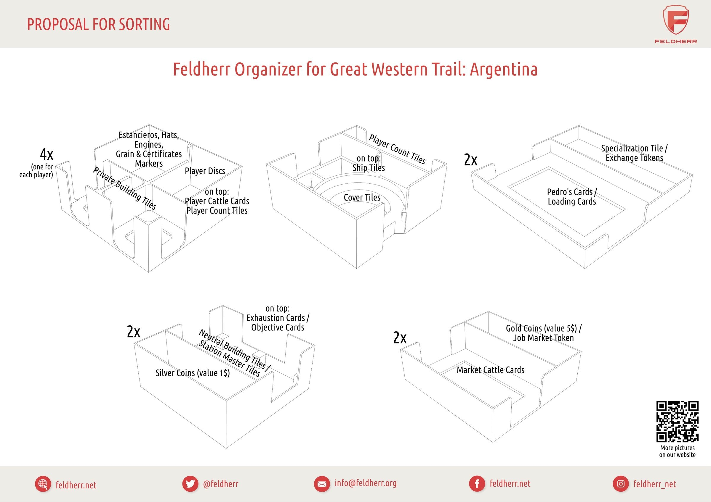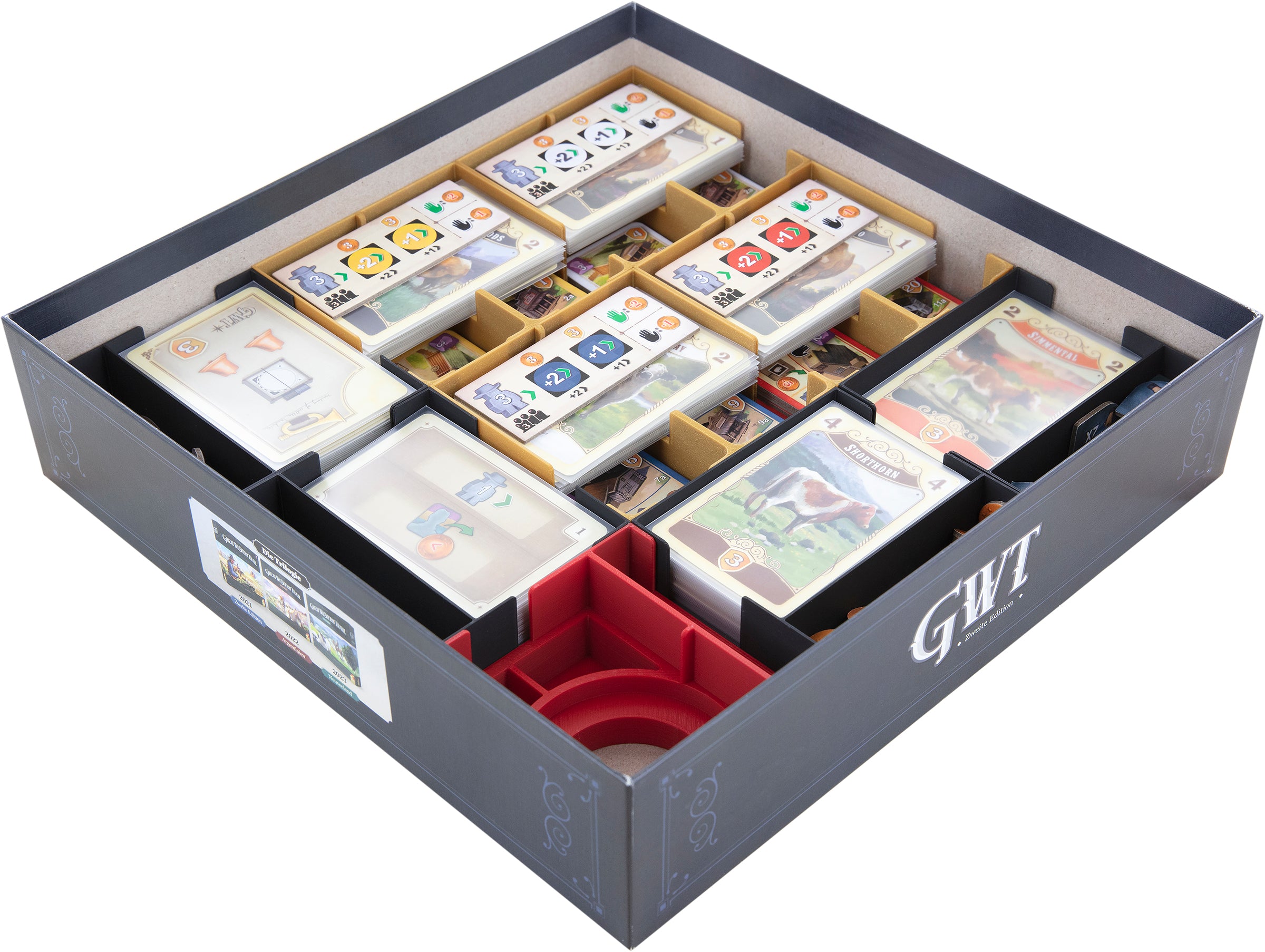 Whether you are playing the 2nd Edition of “Great Western Trail” with or without the “Rails to the North” expansion or engaging in cattle farming in “Great Western Trail: Argentinien” – with this Organizer, you not only create order within the board game box but also on the tabletop. Unleash the cowboy/gaucho within you and dominate the world of cattle ranching with this Organizer.