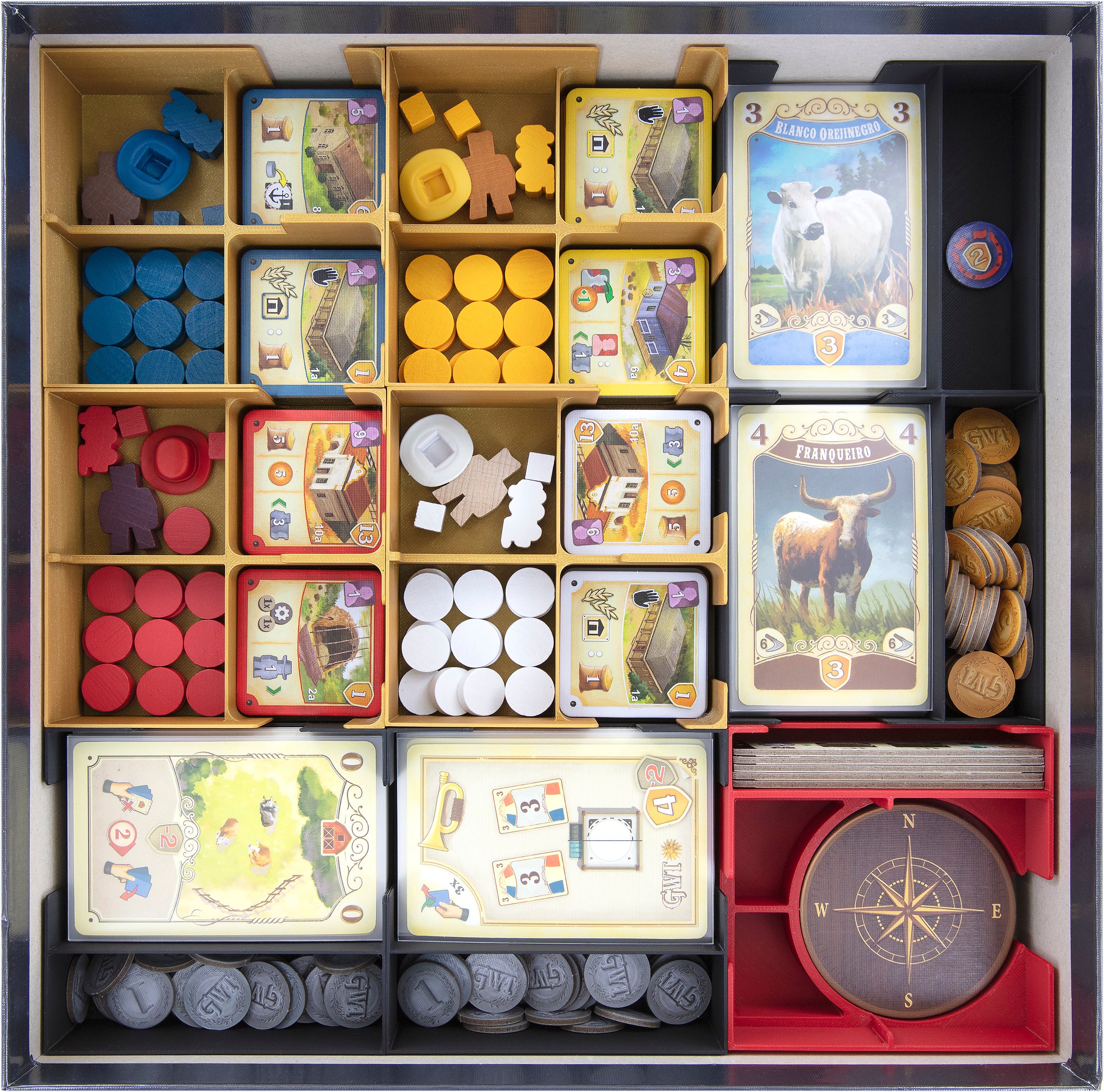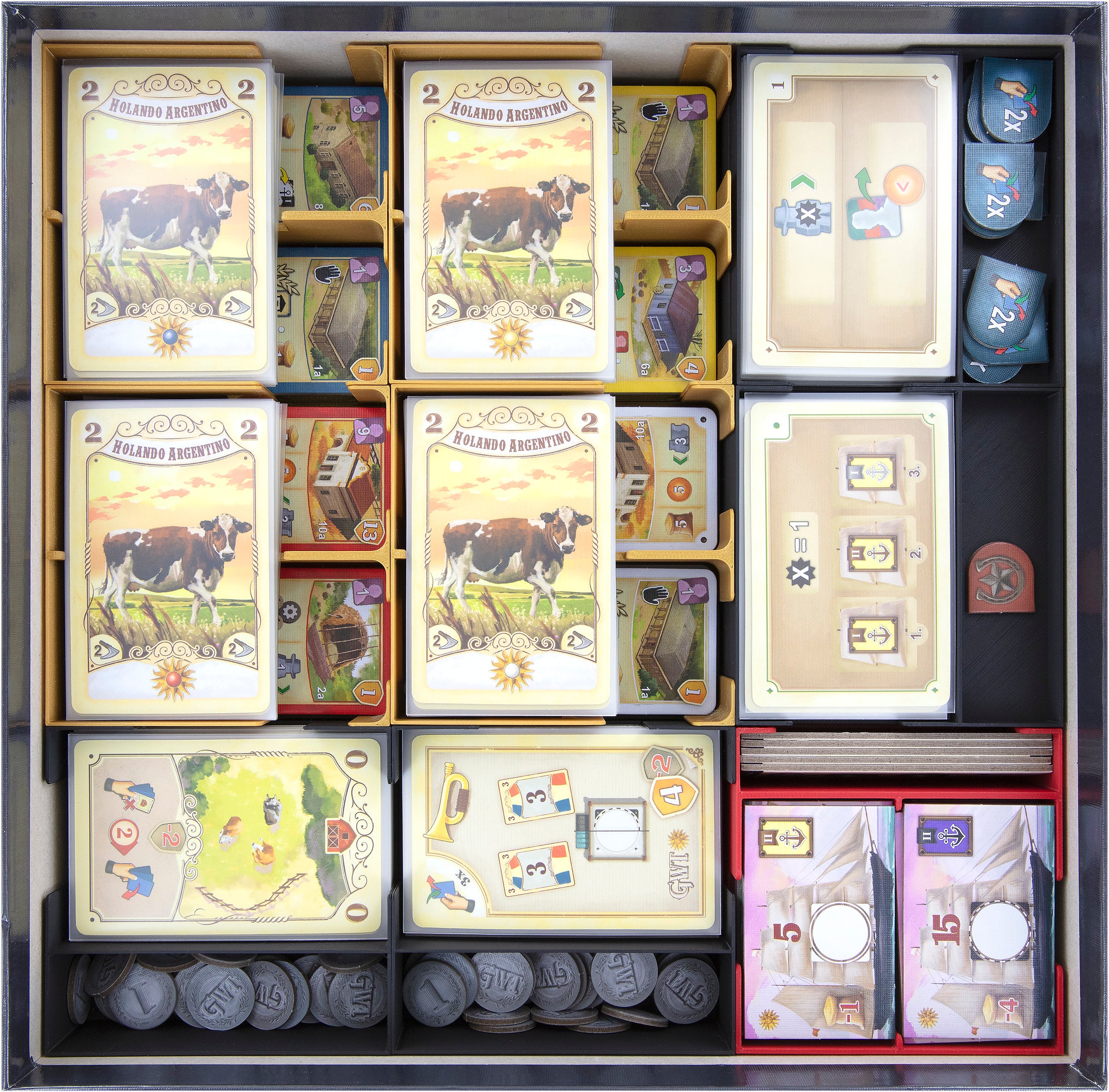 • 2 tall plastic card holders, each with 2 compartments for cattle cards and small-sized game components like coins, markers, and indicators