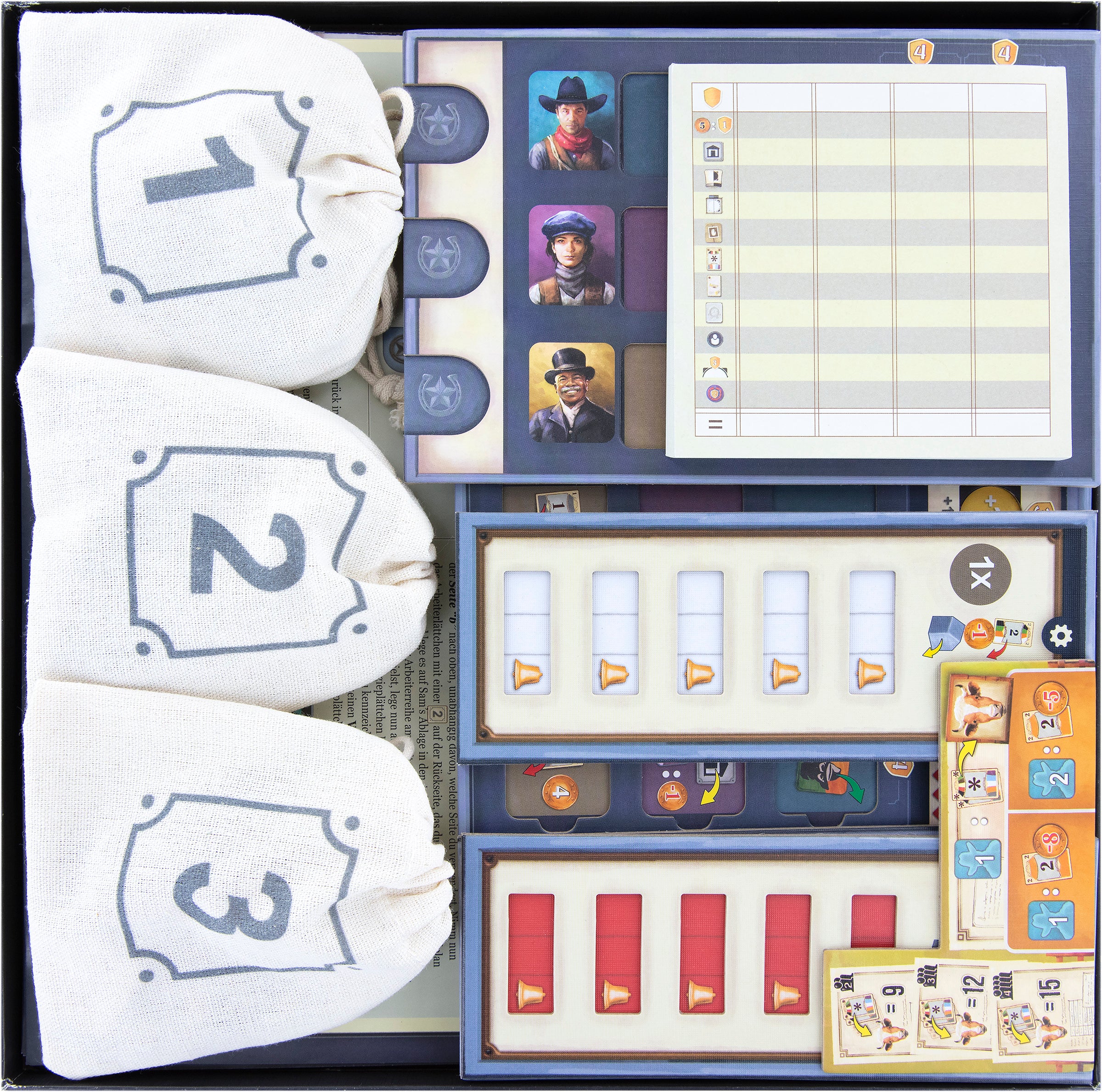• 4 plastic player trays, each with four compartments for hats, wooden markers, building tiles, and player cattle cards, color-coded according to player color