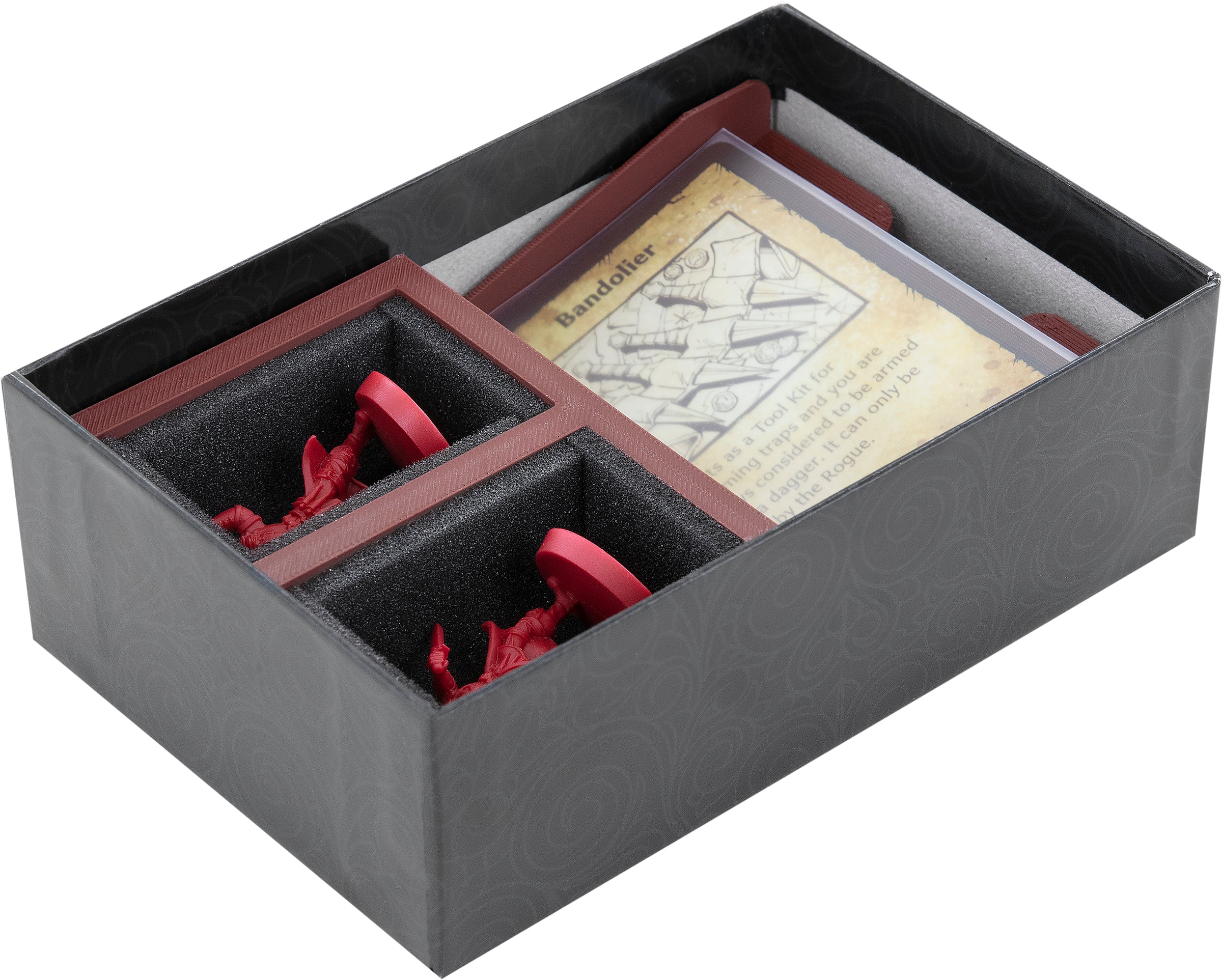 • Besides a card compartment, the tray provides two compartments for your miniatures. They are lined with foam mats.