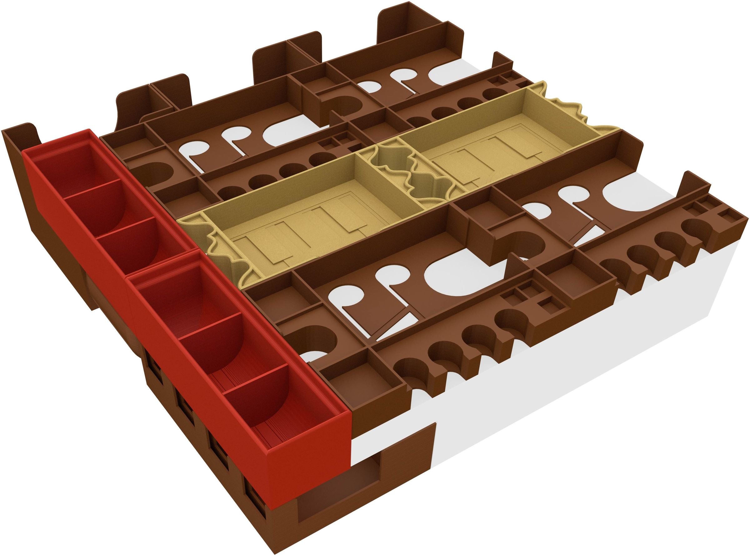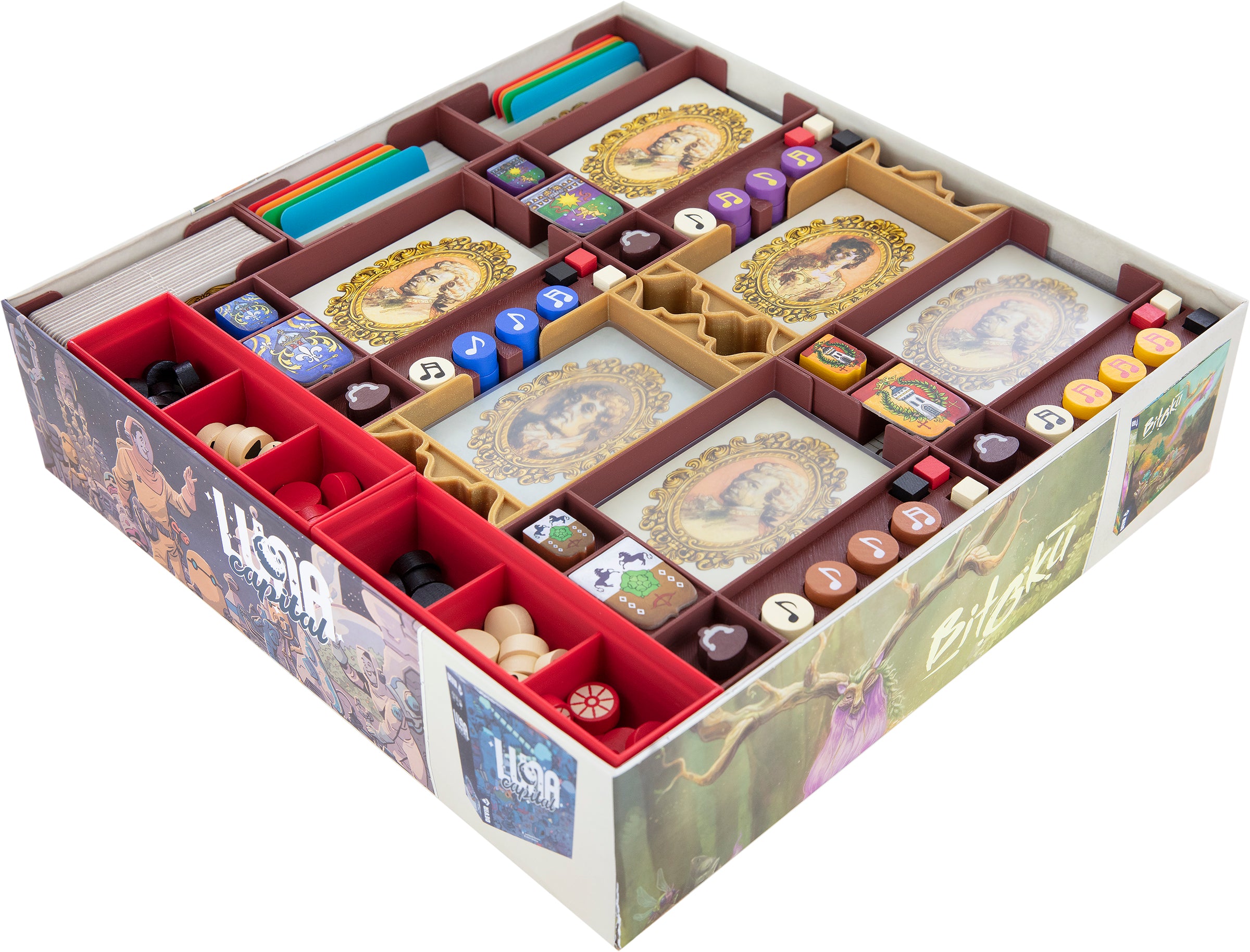 Various plastic inserts arrange your game material like a conductor leading his orchestra through the ups and downs of the partition. Each game element receives a suitable place, and your board game box is given a harmonious structure and order.