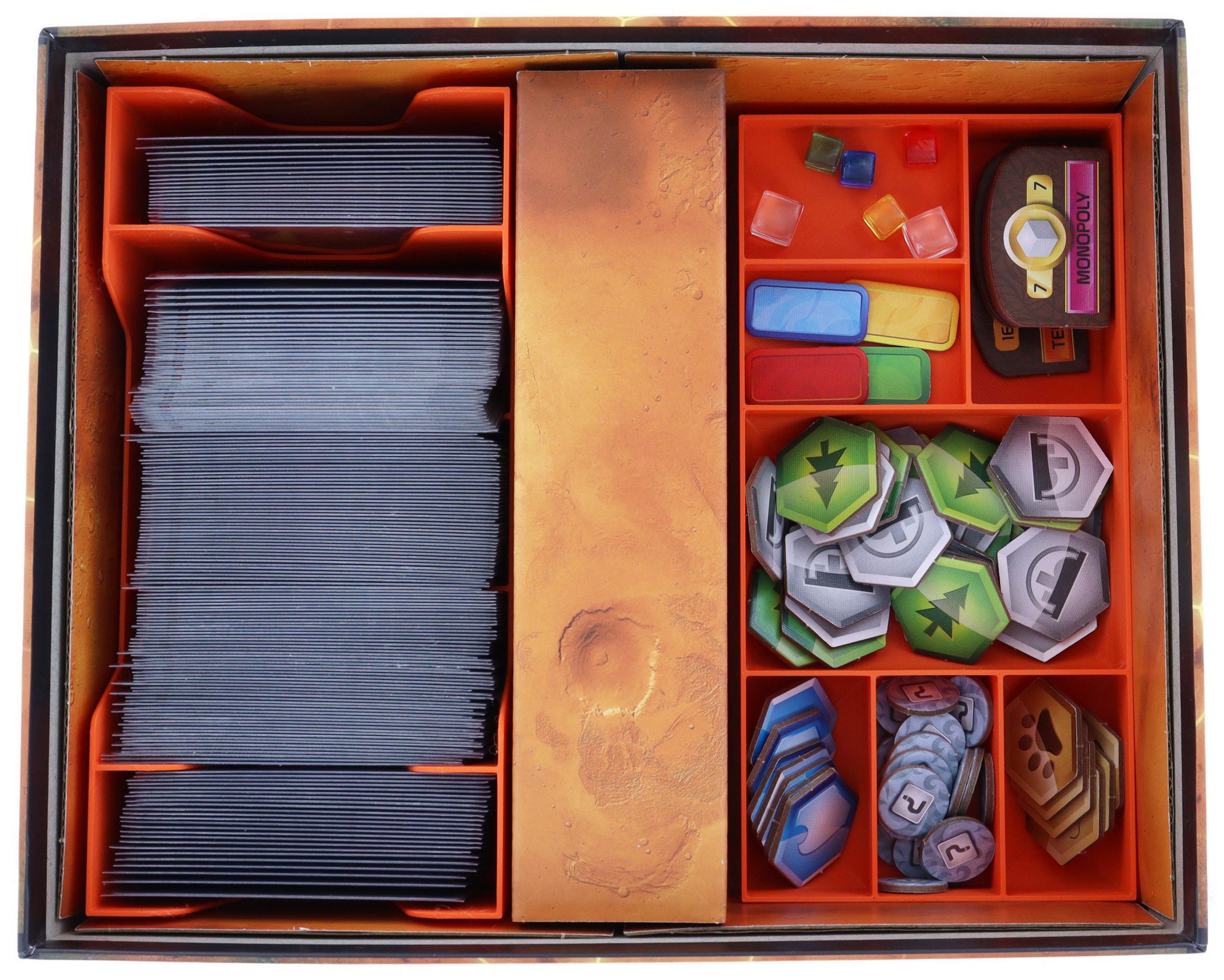 While you are exploring and terraforming Mars, we take care of the order in your board game box. A card holder, token tray, and dice tray perfectly complement your board game box. This gives structure to the contents without spending your valuable game time on lengthy sorting. The inserts also help you keep an overview on the tabletop. Take the trays out of the box and distribute them on the tabletop. This way, you can quickly access all game materials, and the game can start immediately. After the game, return the filled inserts to the box, and you are prepared for the next time.
