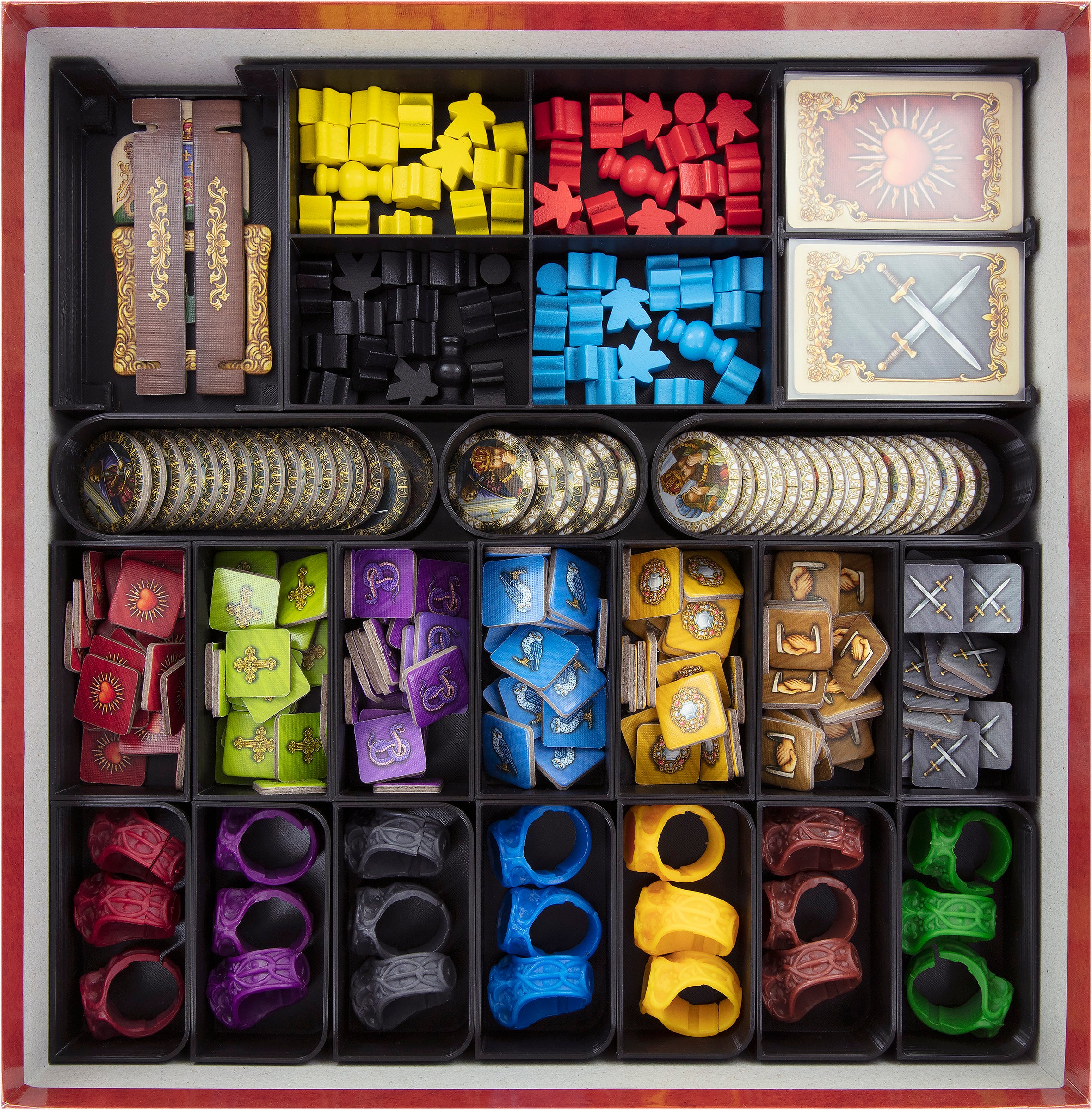 You pursue your ambitions at court; we pursue ours in your board game box. Two plastic card and 18 plastic token holders provide neatly sorted game material. Each card and token finds a suitable place. Wooden figures, Court Tokens, and Privilege Rings can be sorted by color. Thanks to this clear structure, you can avoid time-consuming pre-sorting. Use the time you saved to get rid of annoying rivals.