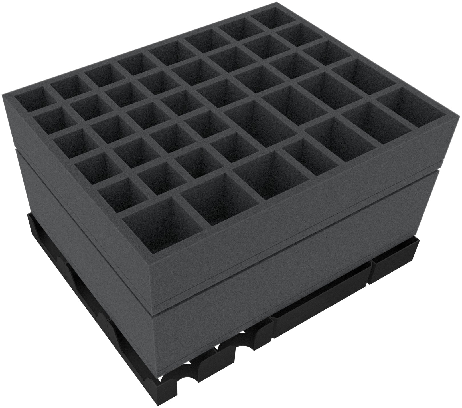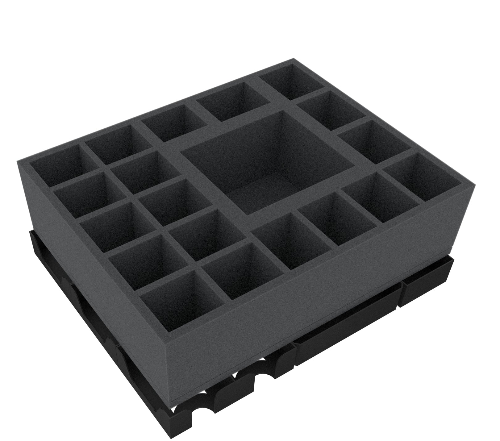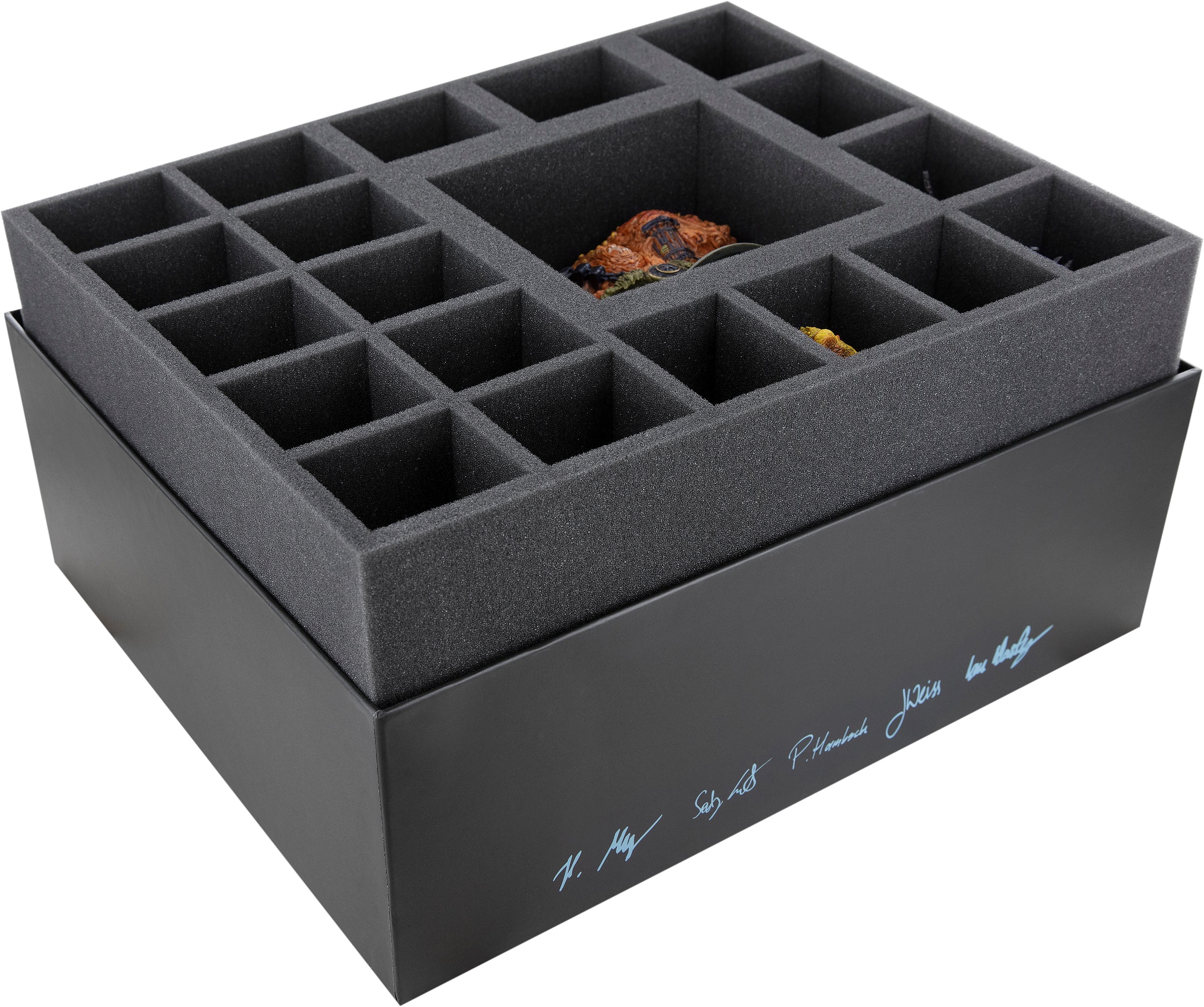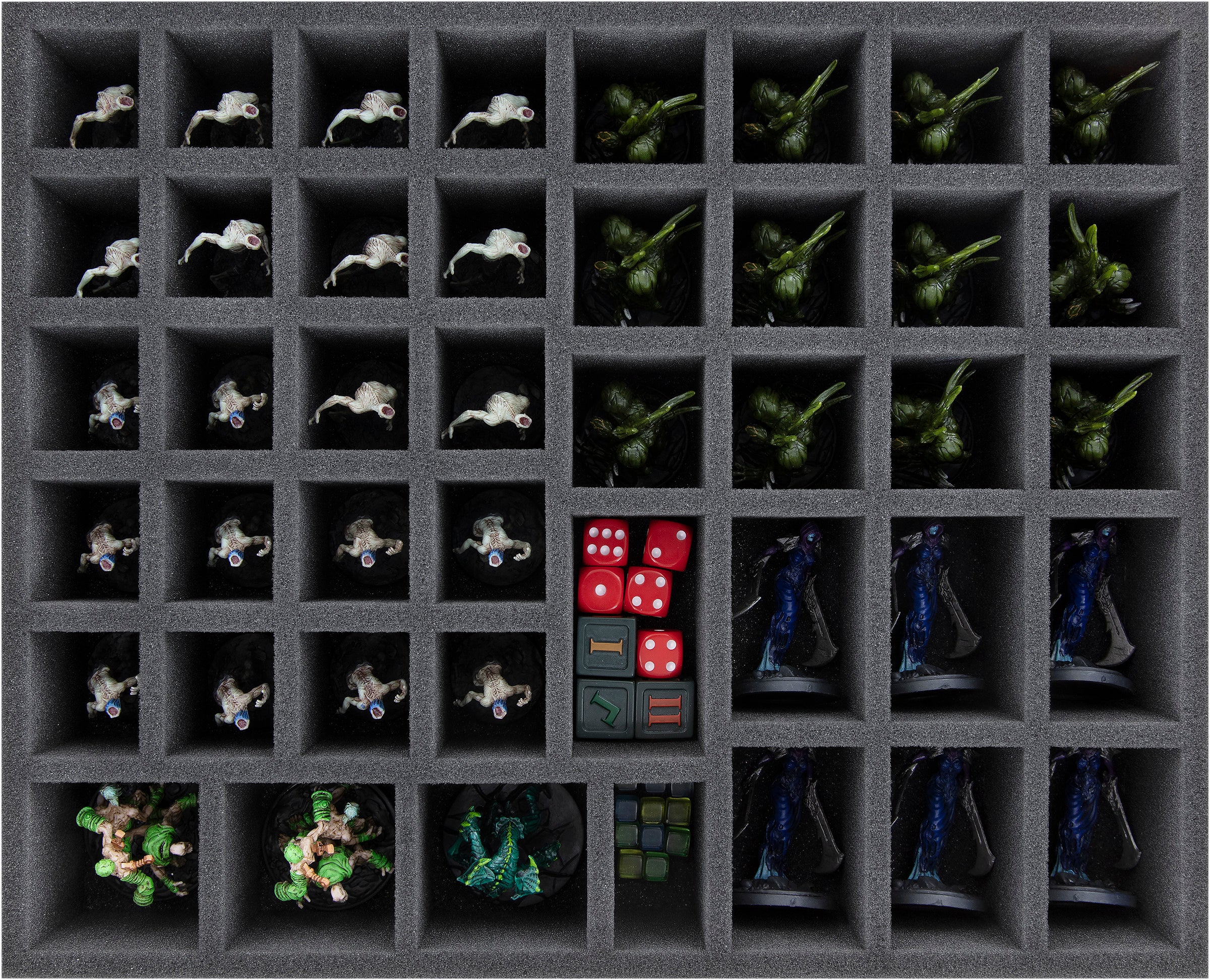 • 1 foam tray with 43 compartments for small and regular sized miniatures + game materials like dice and tokens.