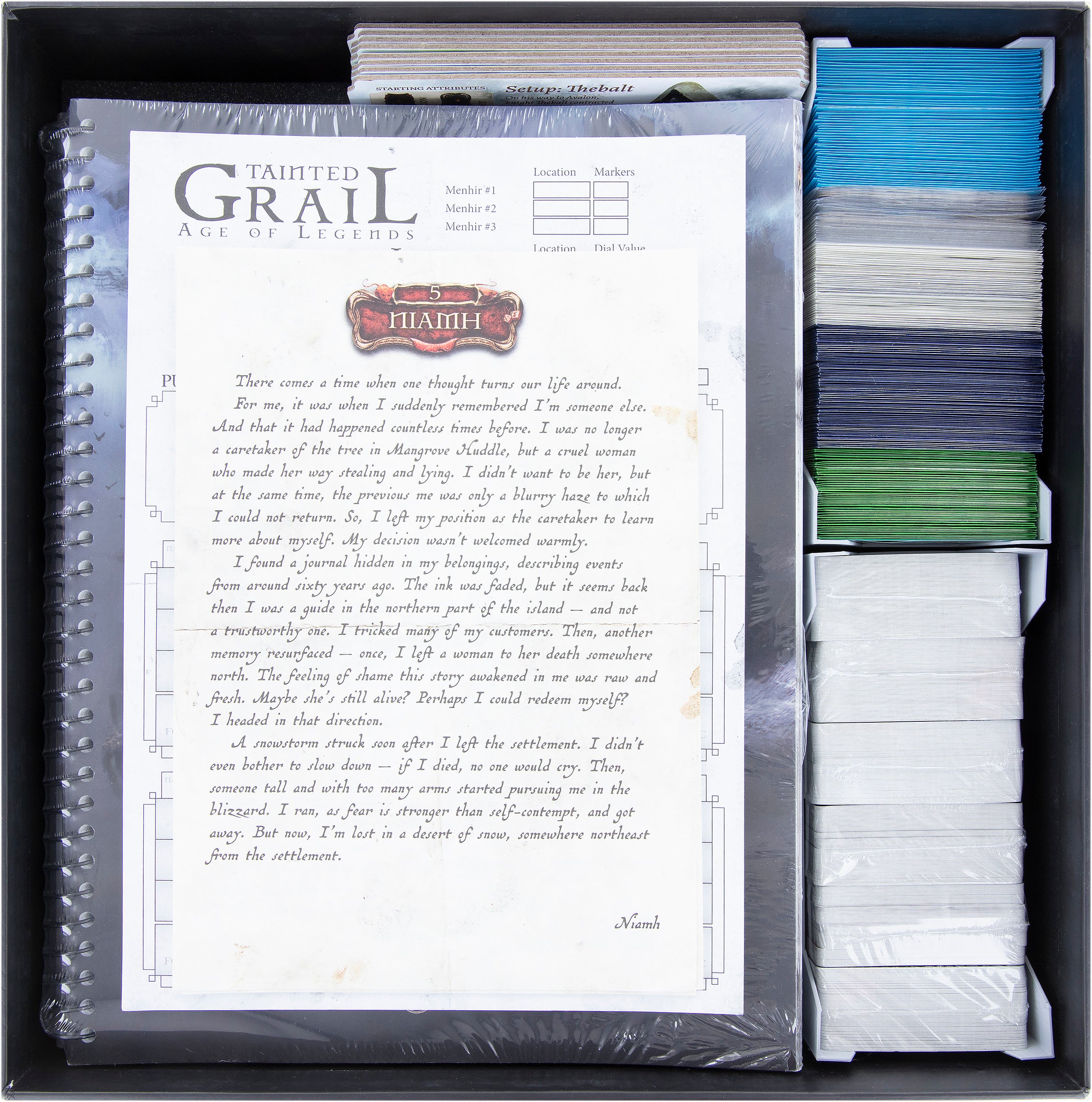 Store the character tiles in the free space next to the card holders. Starting letters, Save sheets and the Exploration journals are placed on the inserts.
