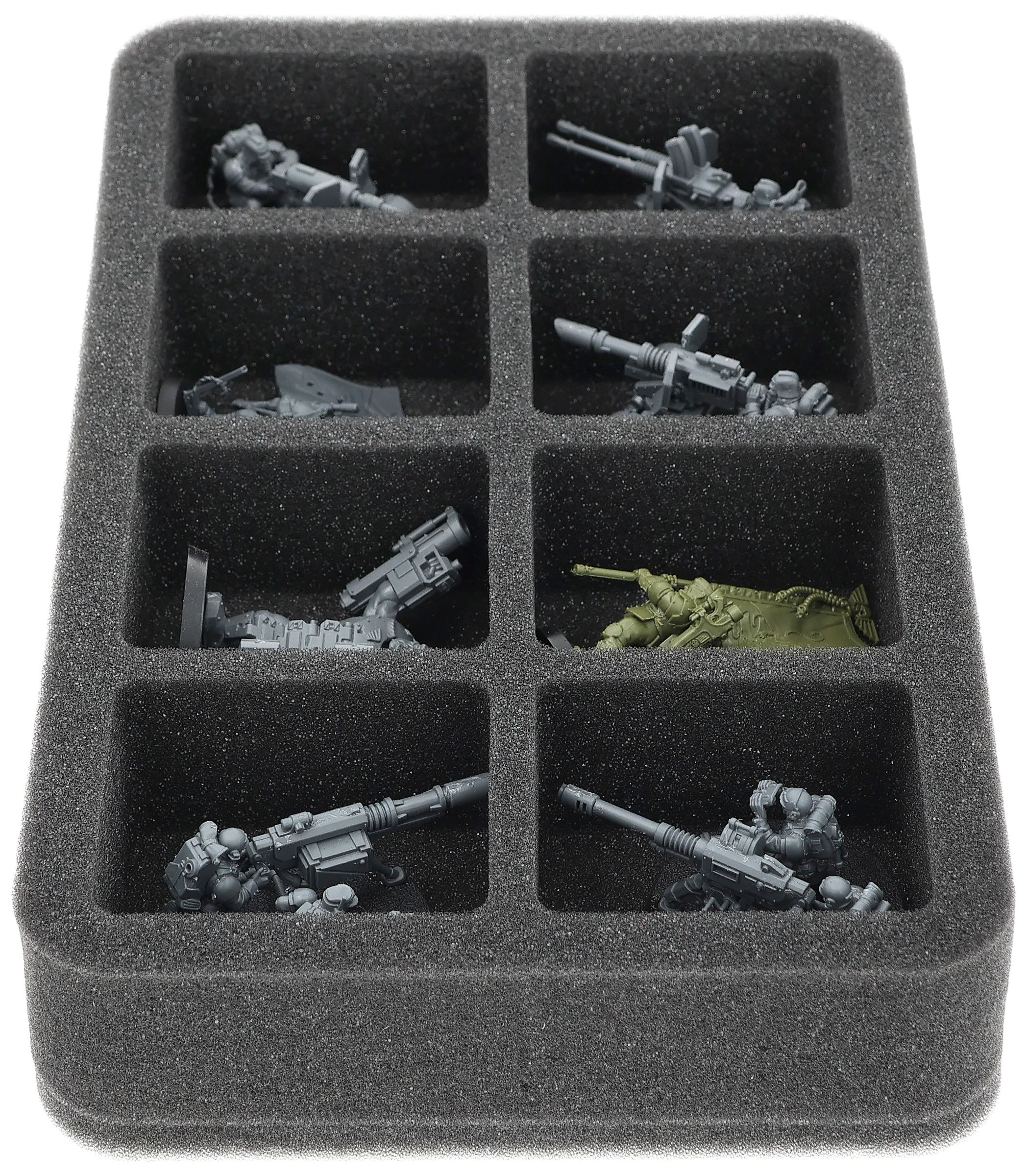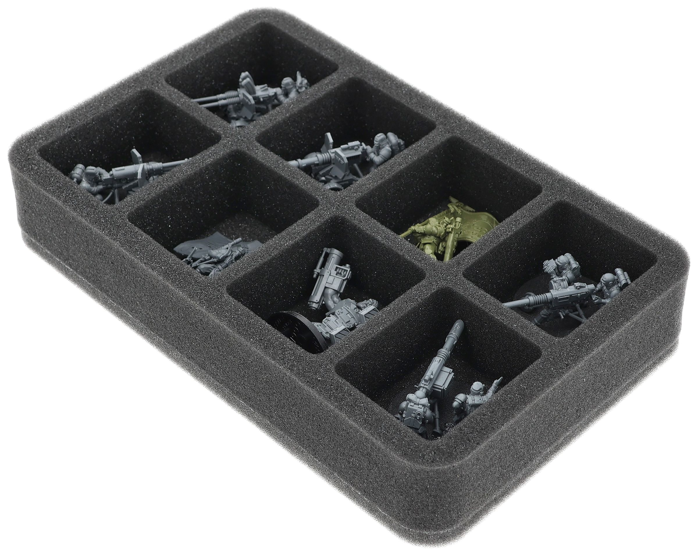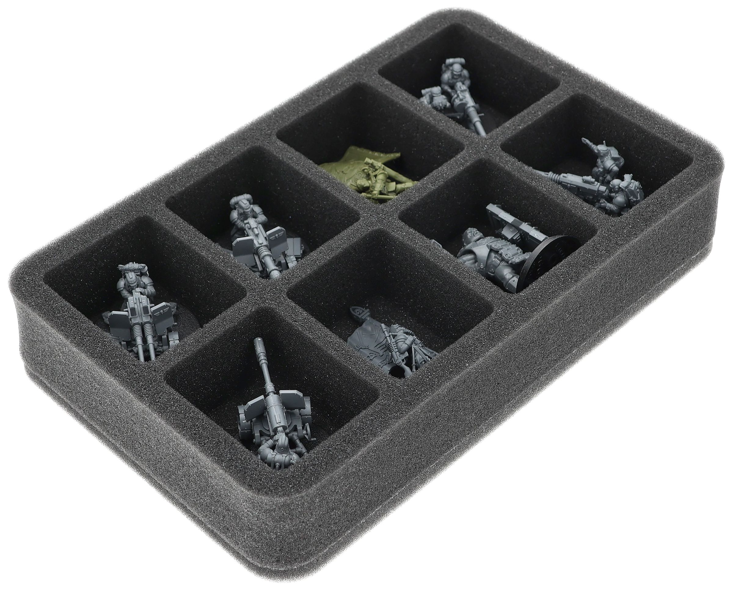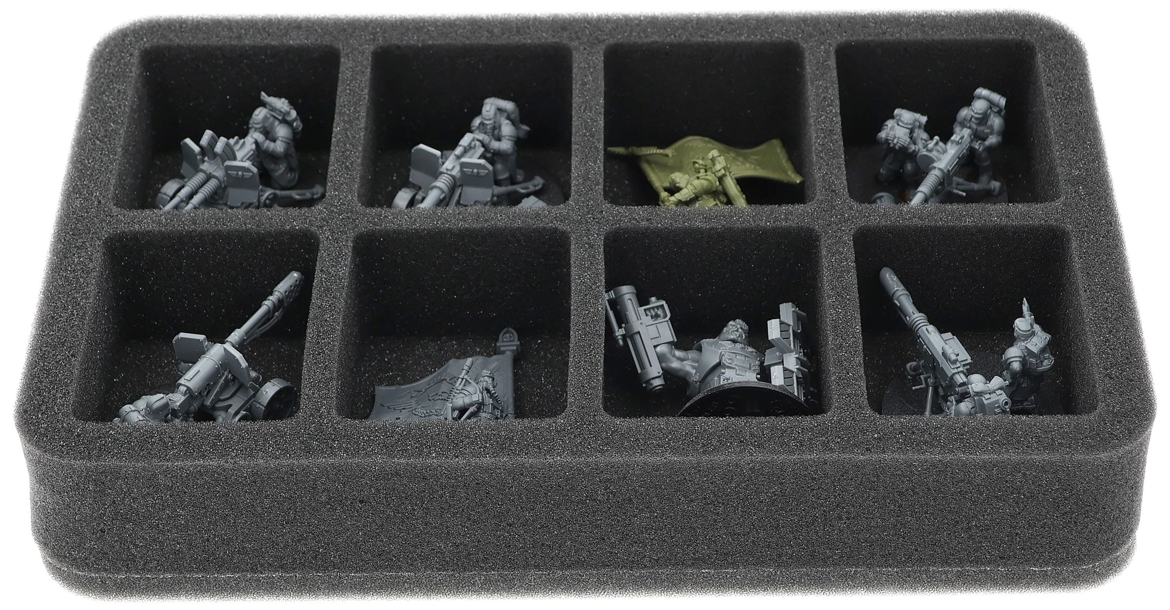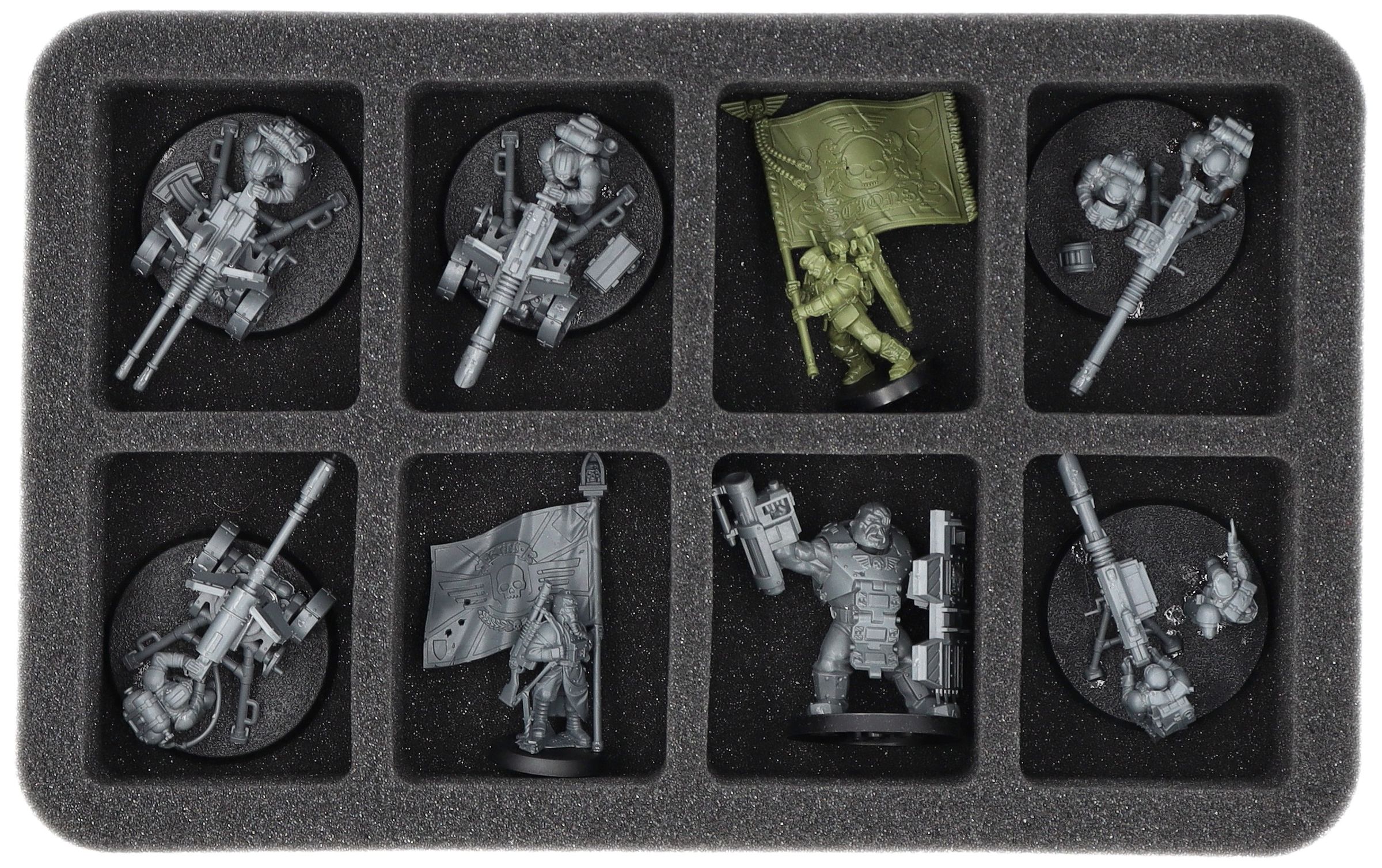 On this Feldherr foam tray you have space for up to 8 miniatures of your army. The insert is especially suitable for storing the Krieg Heavy Weapons Squad, Bullgryns and similar sized models.