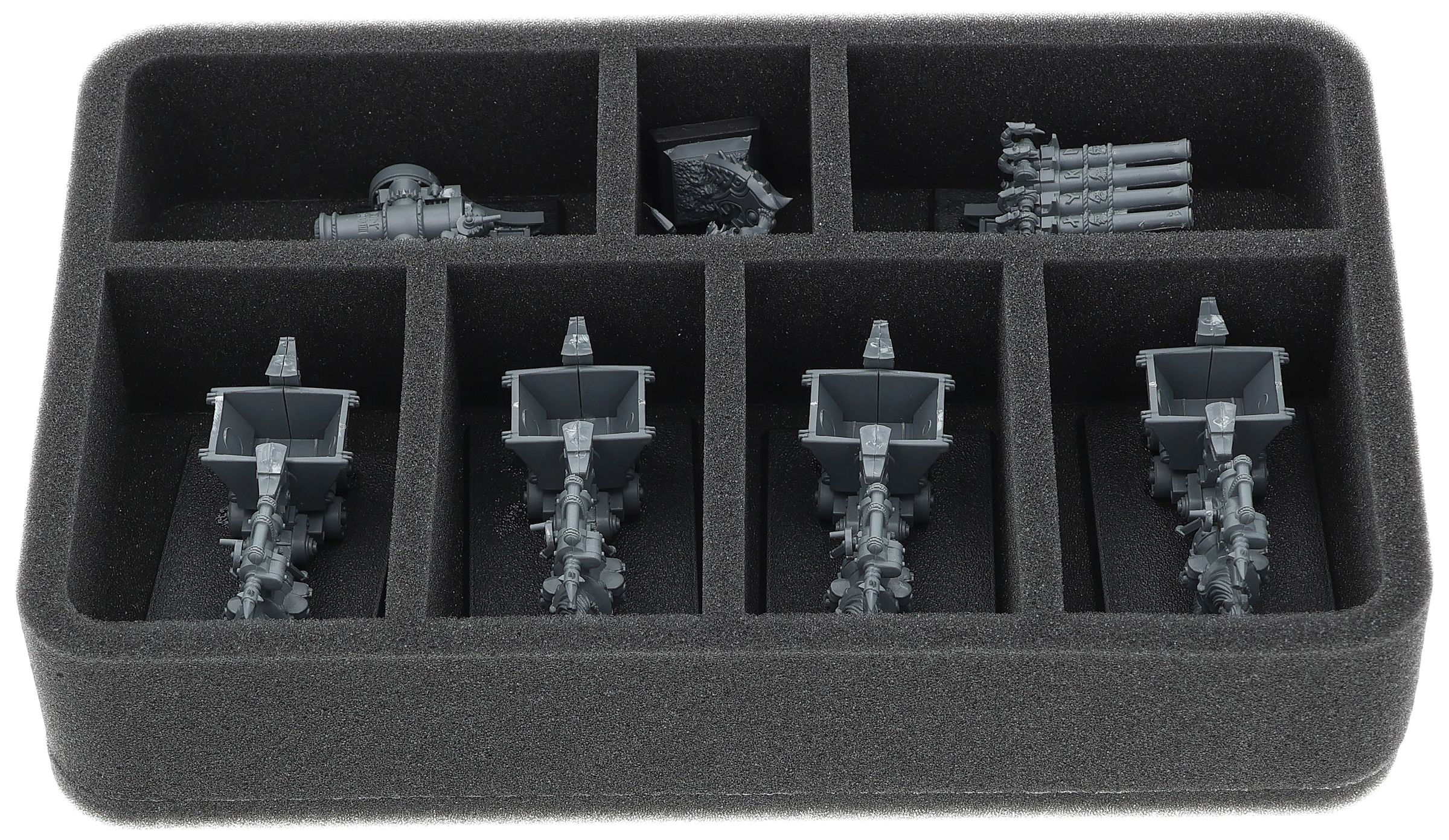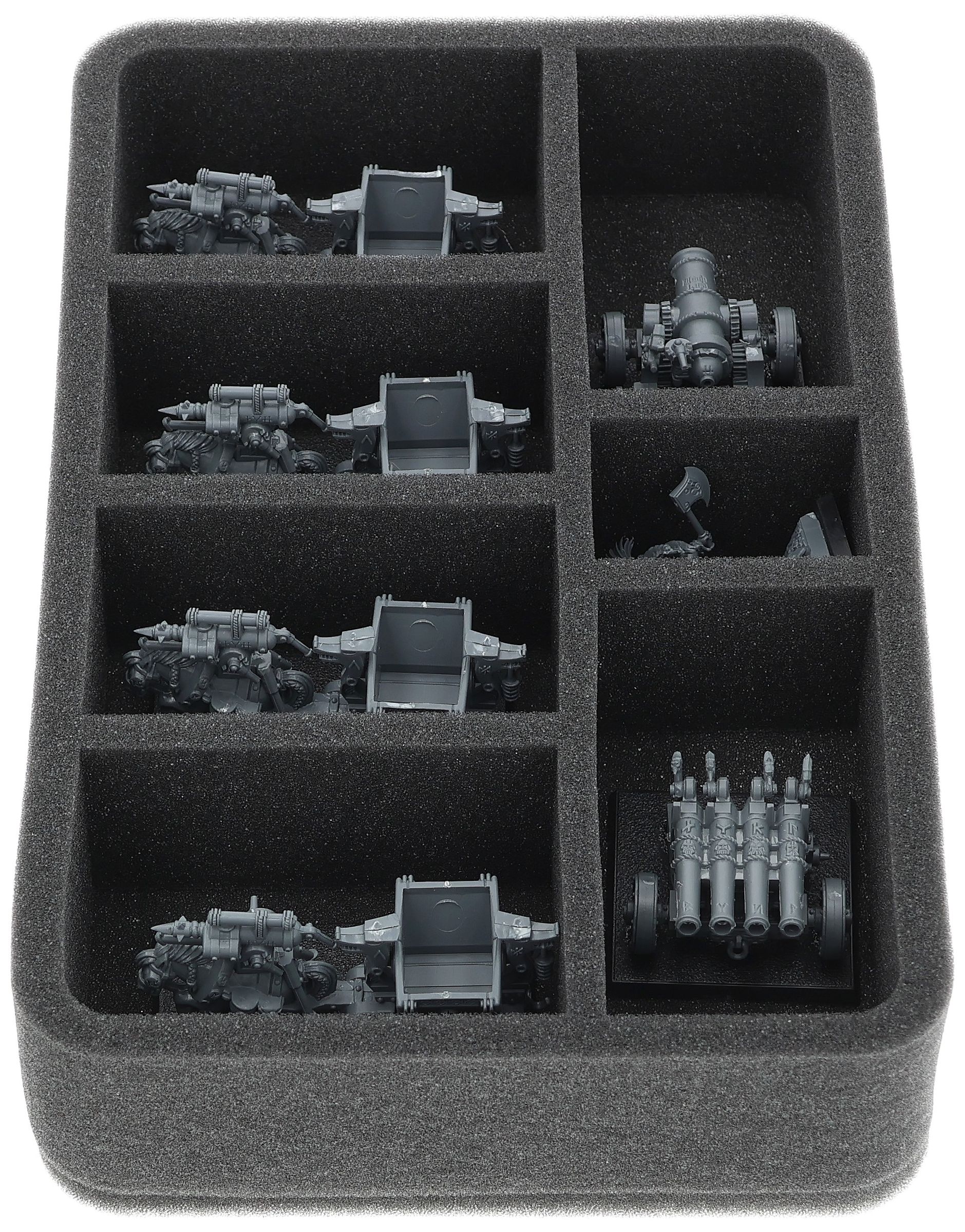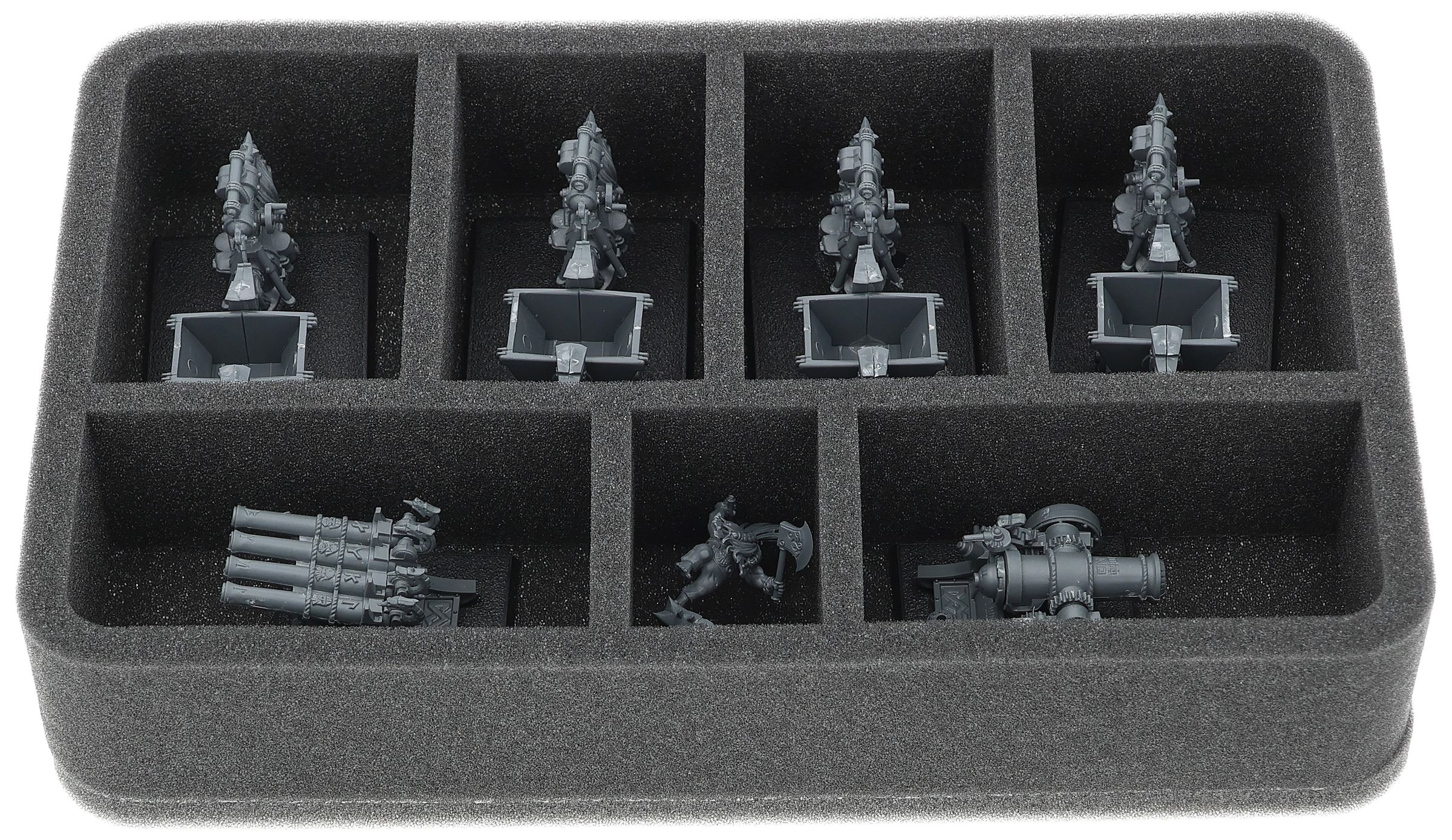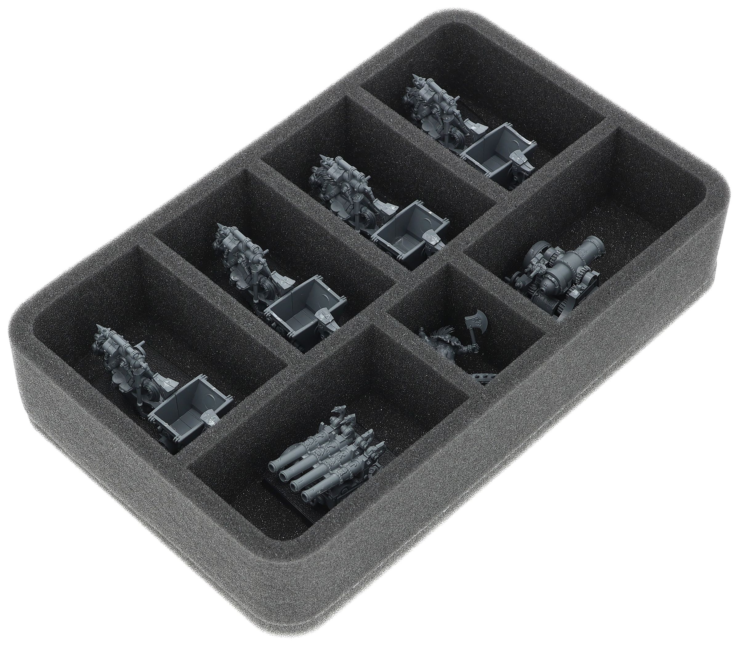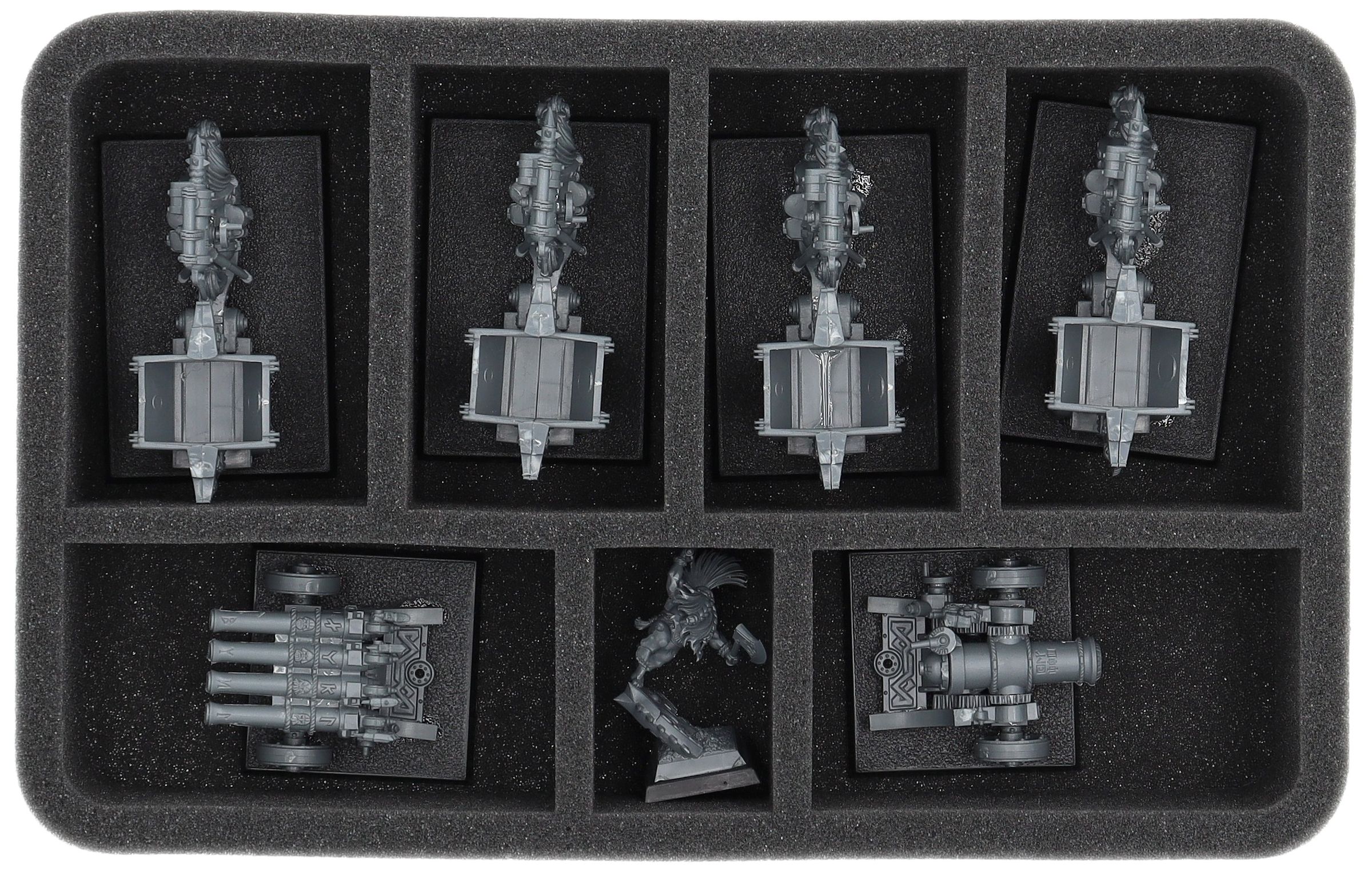 On this Feldherr foam tray you have space for up to 7 miniatures of your army. The insert is especially suitable for storing the Dwarf Miners and similar sized models.