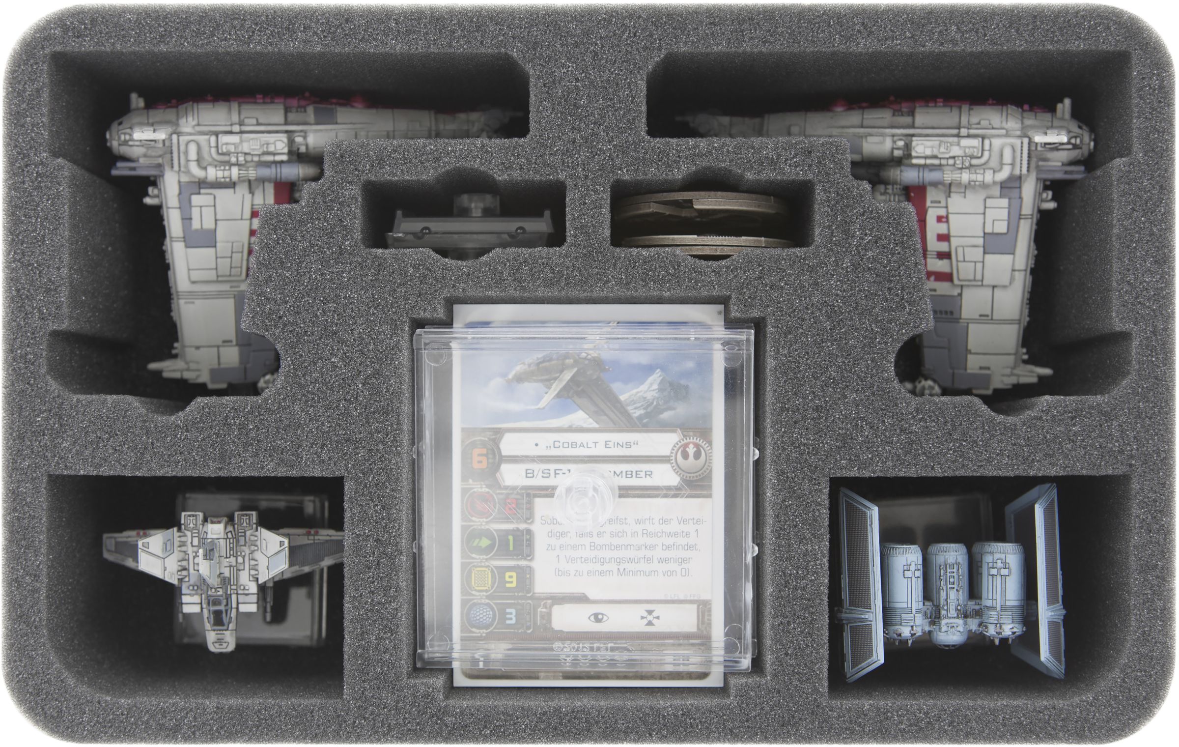 Special designed foam for two B/SF-17 Resistance Bomber and 2 ships on base. The mat also includes a slot for cards and large bases and two slots for Dials.