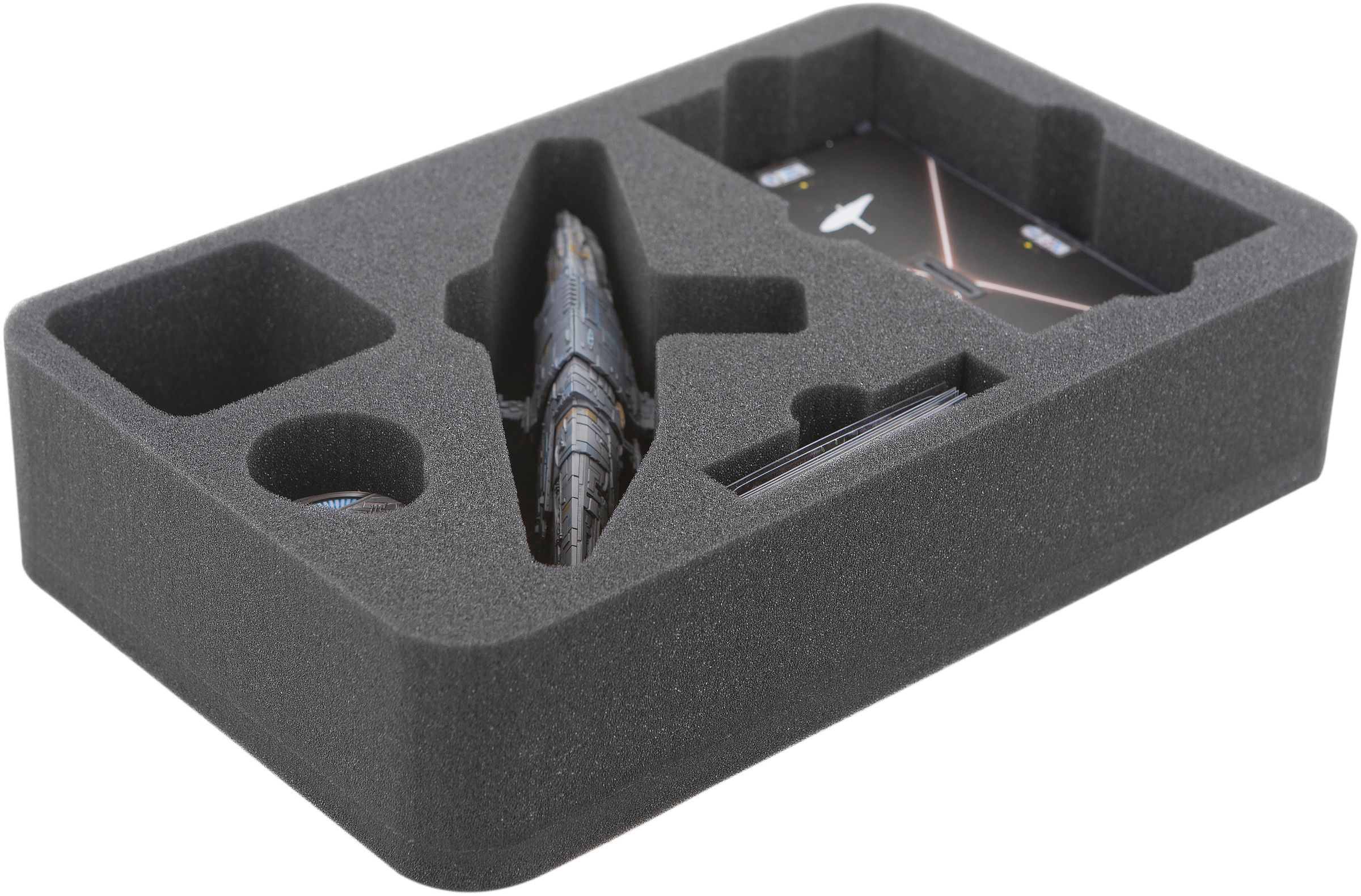 Protect you Star Wars: Armada Profundity. In this Half-Size inlay the MC75 Profundity is perfecty protected. In the four furhter compartments you have space for the base, tokens, cards, Command and Speed Dials. The foam tray is specially developed for MC75 Profundity. The entire game material and the cruiser are perfectly protected by the indiviually designed compartments.