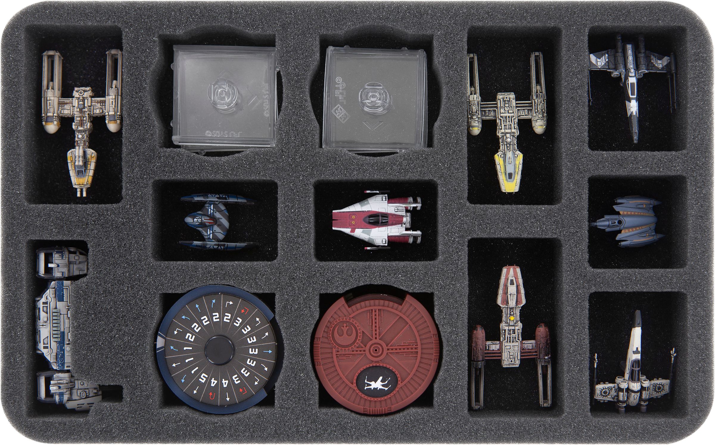 8 additional compartments can be equipped with models of your choice. The three oblong compartments can be used either for more Resistance Transport models or for other ship miniatures, such as Y-Wing. The smaller compartments are suitable for A-Wing Interceptors, T-70 X-Wing or Z-95 Headhunters / Clone Z-95 Headhunters, for example.