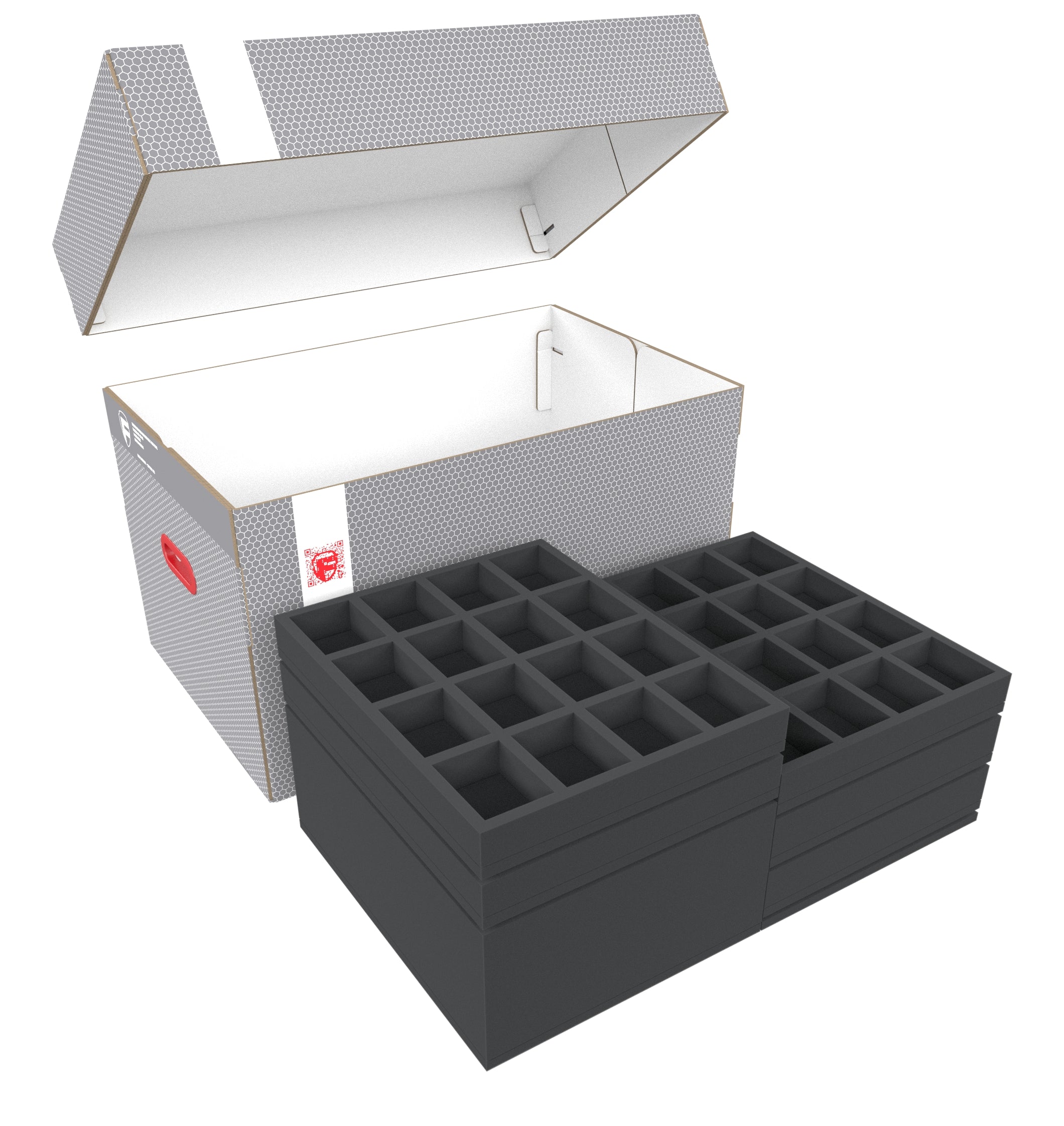 The Storage Box DSLB310 is made of coated, corrugated cardboard. This makes it not only pleasantly light but also very tear-resistant and stable. The attachable lid reliably protects the contents from dust and other external influences. With the appropriate foam trays, miniatures, game material, and all other goods can be stored safely — and conveniently transported with the two plastic-reinforced carrying handles on the sides.