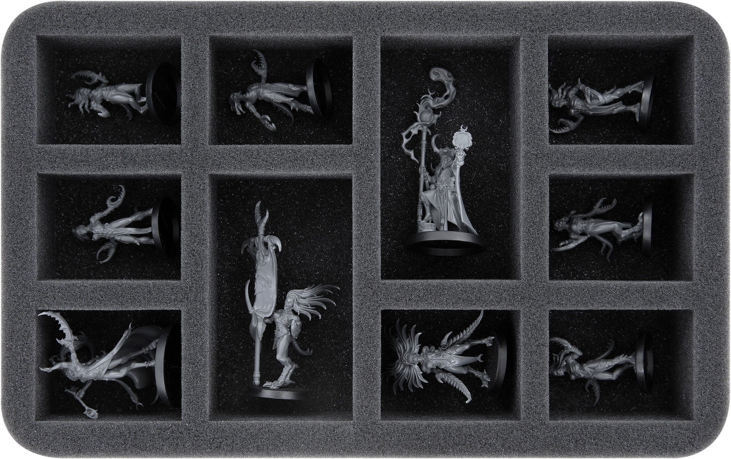Each miniature in your collection gets its own custom-fit compartment here. This ensures that your models remain safely in place during transport. The soft foam protects the sensitive parts of your figures and the colors of painted miniatures are just as safe from abrasion and scratches.