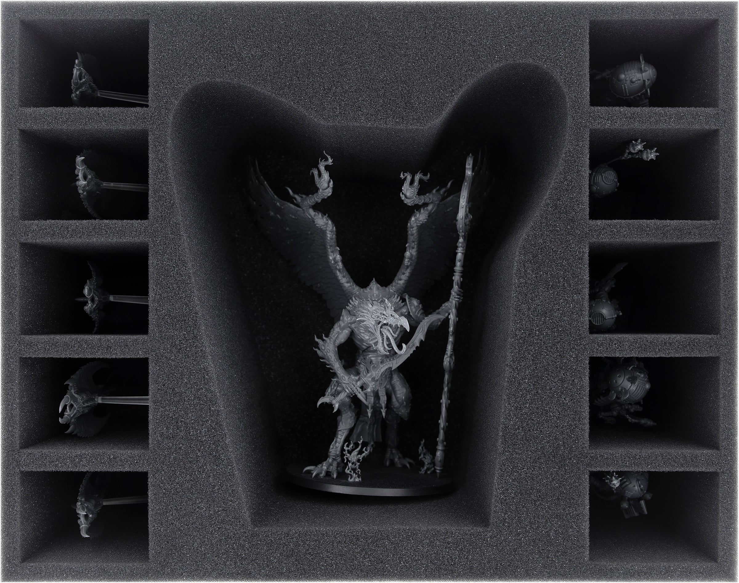 • 1 foam tray with a miniature-precisely cut compartment for Lord of Change/Kairos Fateweaver + 10 compartments for Pink Horrors and similar sized models (FSMEUS140BO)