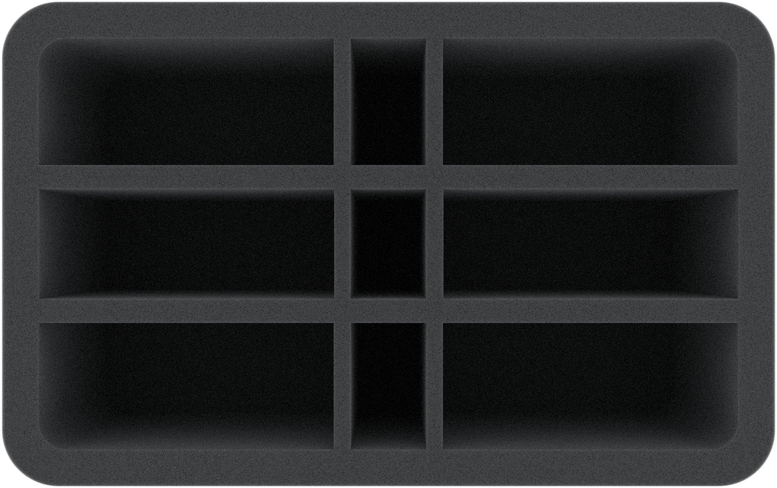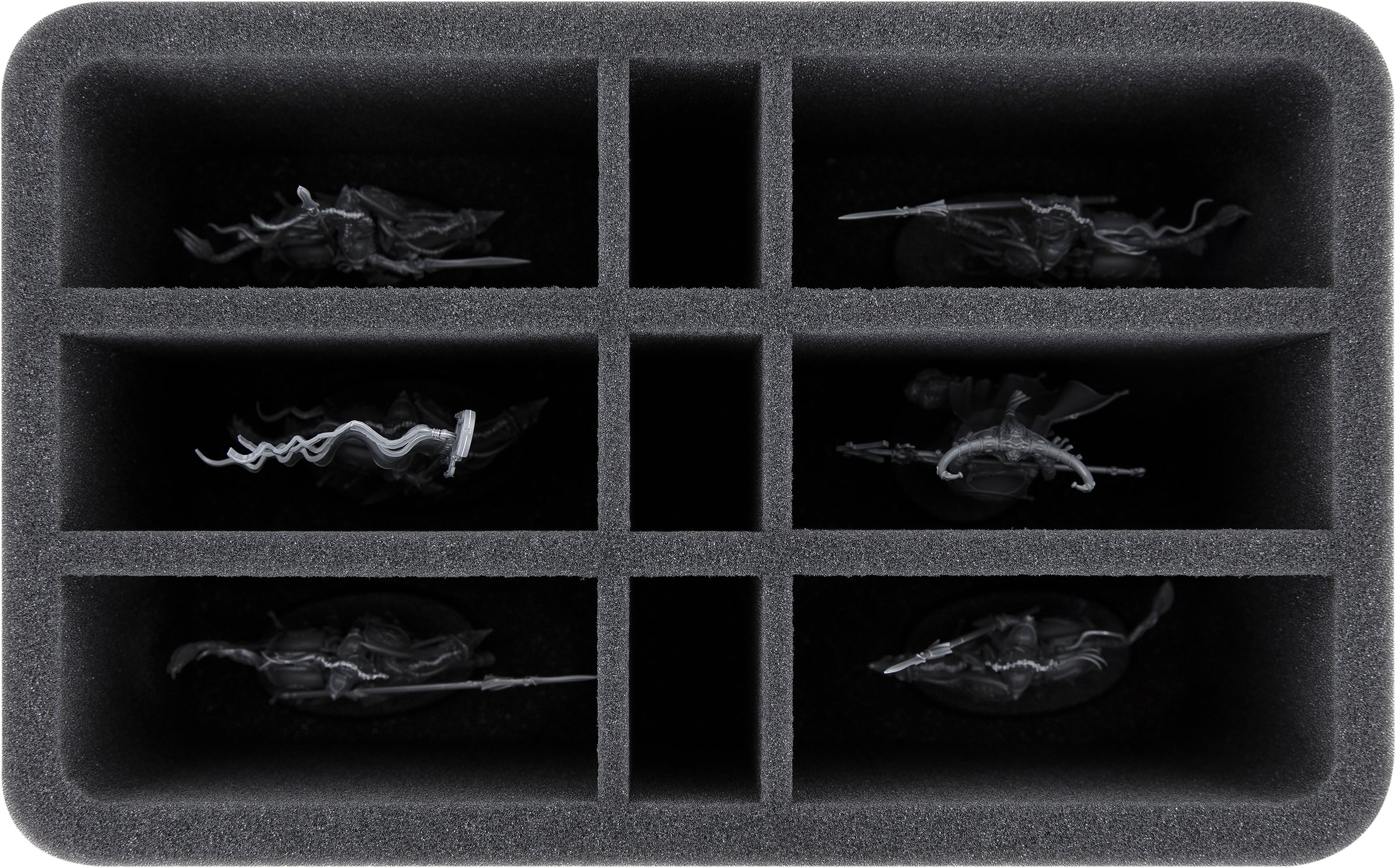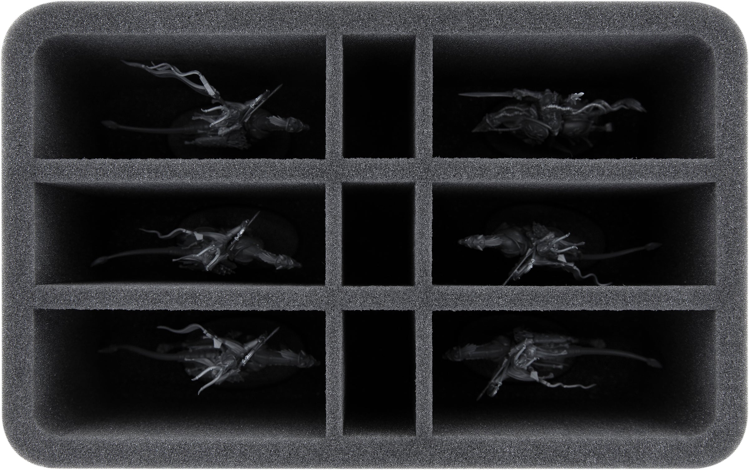 A total of 9 compartments on this Feldherr Half-Size foam insert offer you space for your Lumineth Realm-lords miniatures. The six large compartments are perfect for safe storage and transportation of the Vanari Dawnriders, Alarith Stonemage, Hurakan Windchargers, or similar sized models.