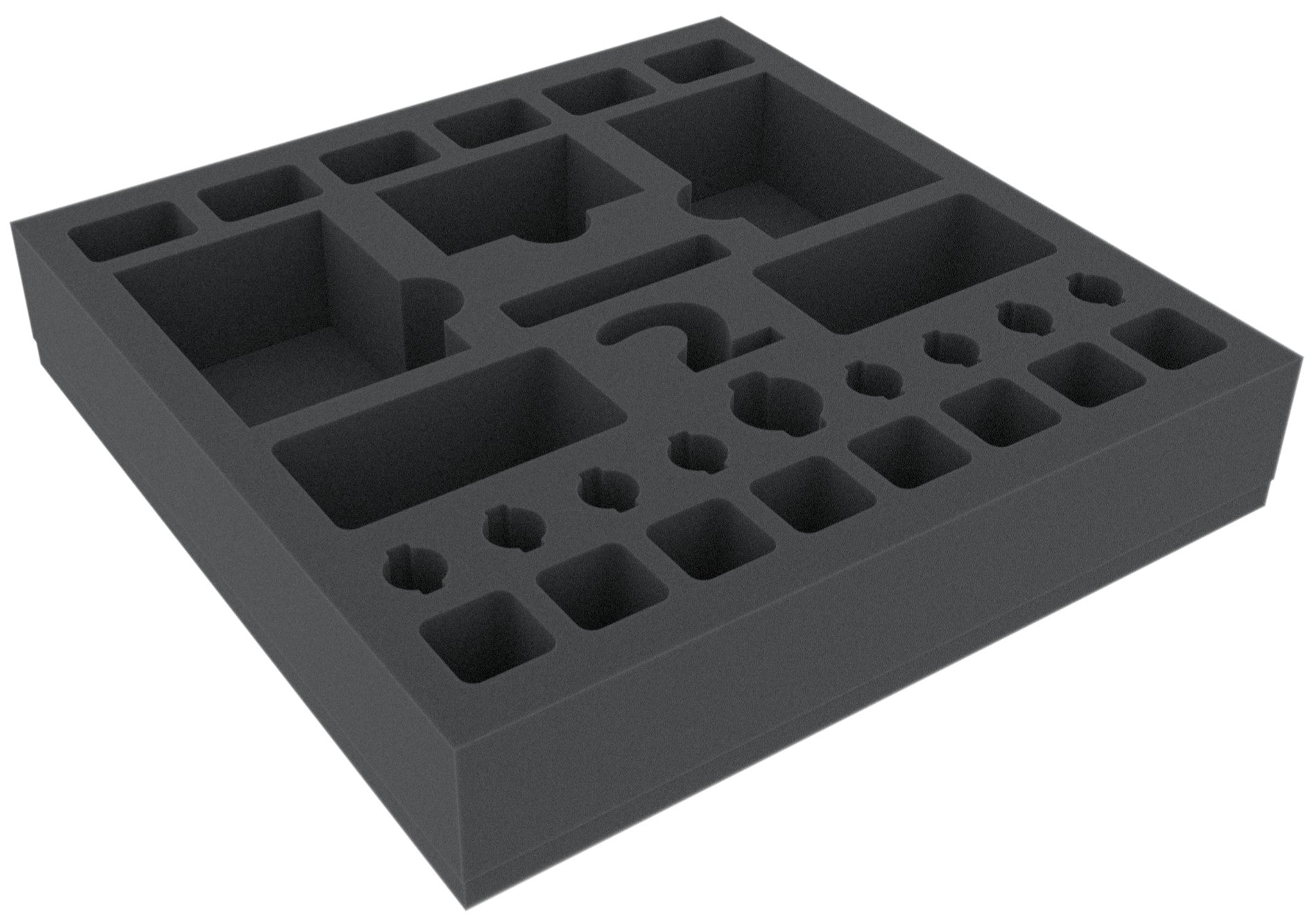 This foam tray is especially designed for Mice and Mystics. In the foam you can not only protect and transport your material of the original game box but also the equipment of the Heart of Glorm expansion. In the 30 compartments you can stow your mouse and enemy figures, the different cards in sleeves, tokens and dice in shaped cut outs. The mat fits in the original game box. Along with the Rule Book, Story Book, Story Control Board and Room Tiles the foam extends slightly over the edge of the board game box.