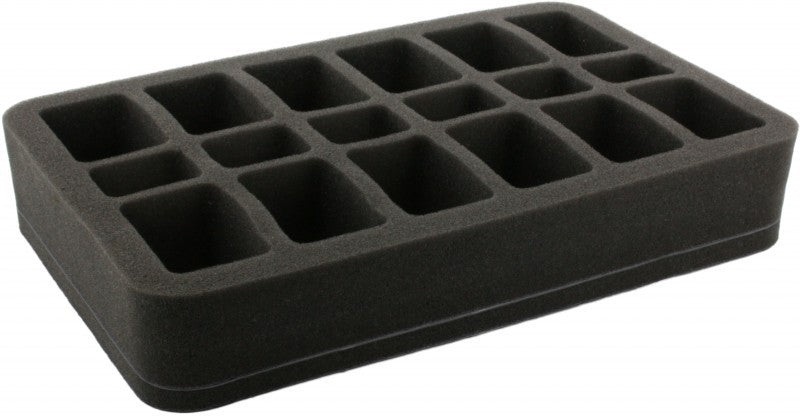Taca z pianki składa się z 12 średnich przedziałów o wymiarach 54 x 35 mm i 6 przedziałów pośrodku dla mniejszych brył o wymiarach 27 x 35 mm. Liczby nie powinny być wyższe niż 40 mm. To zazwyczaj wystarczy, aby pomieścić bohaterów i potwory w pozycji pionowej. Dzięki podłożu z pianki o grubości 10 mm taca osiąga całkowitą wysokość 50 mm.