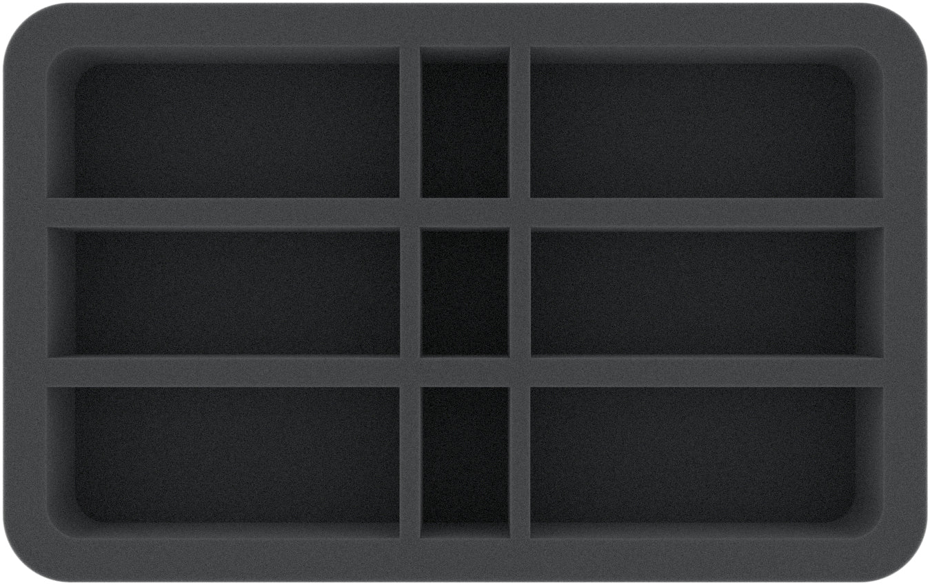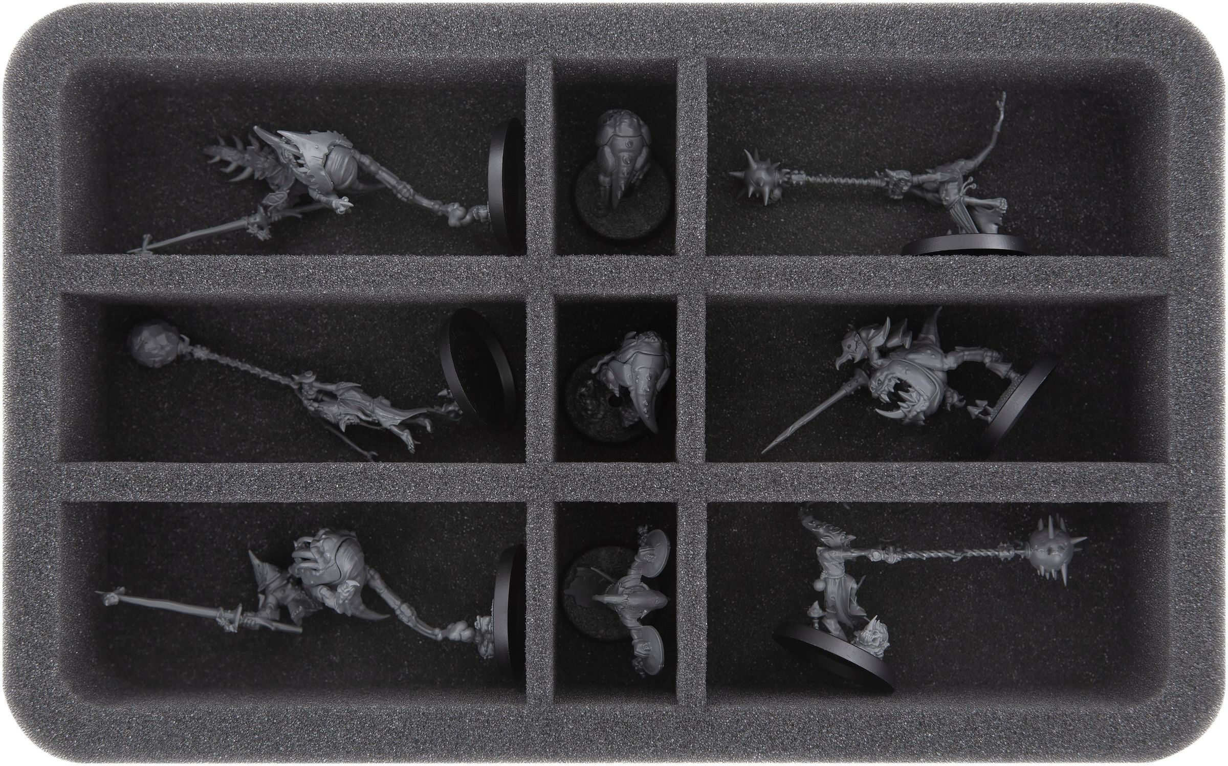This Half-Size foam insert is divided into 9 compartments with 3 different sizes. It is ideal to clearly and safely store elongated models of the Gloomspite Gitz.