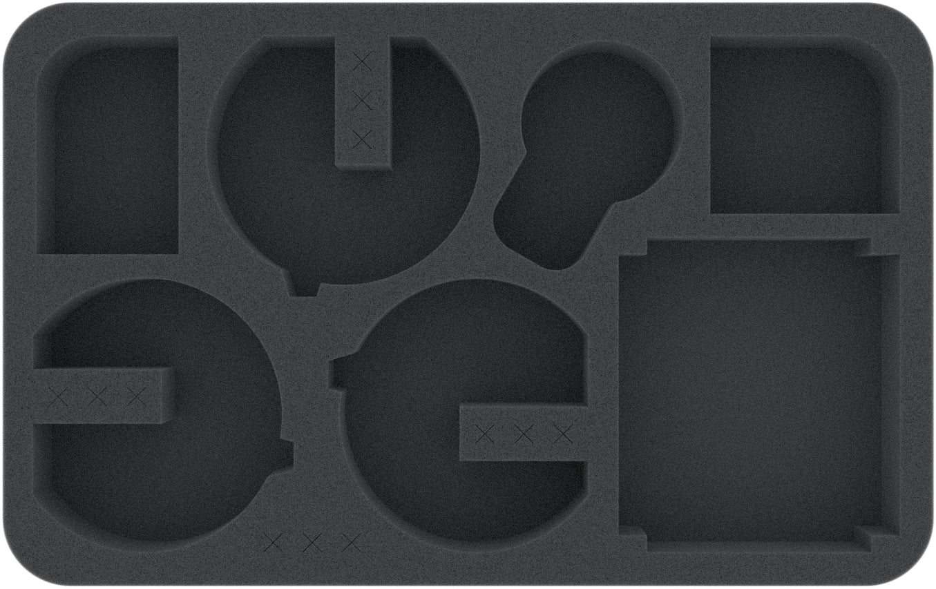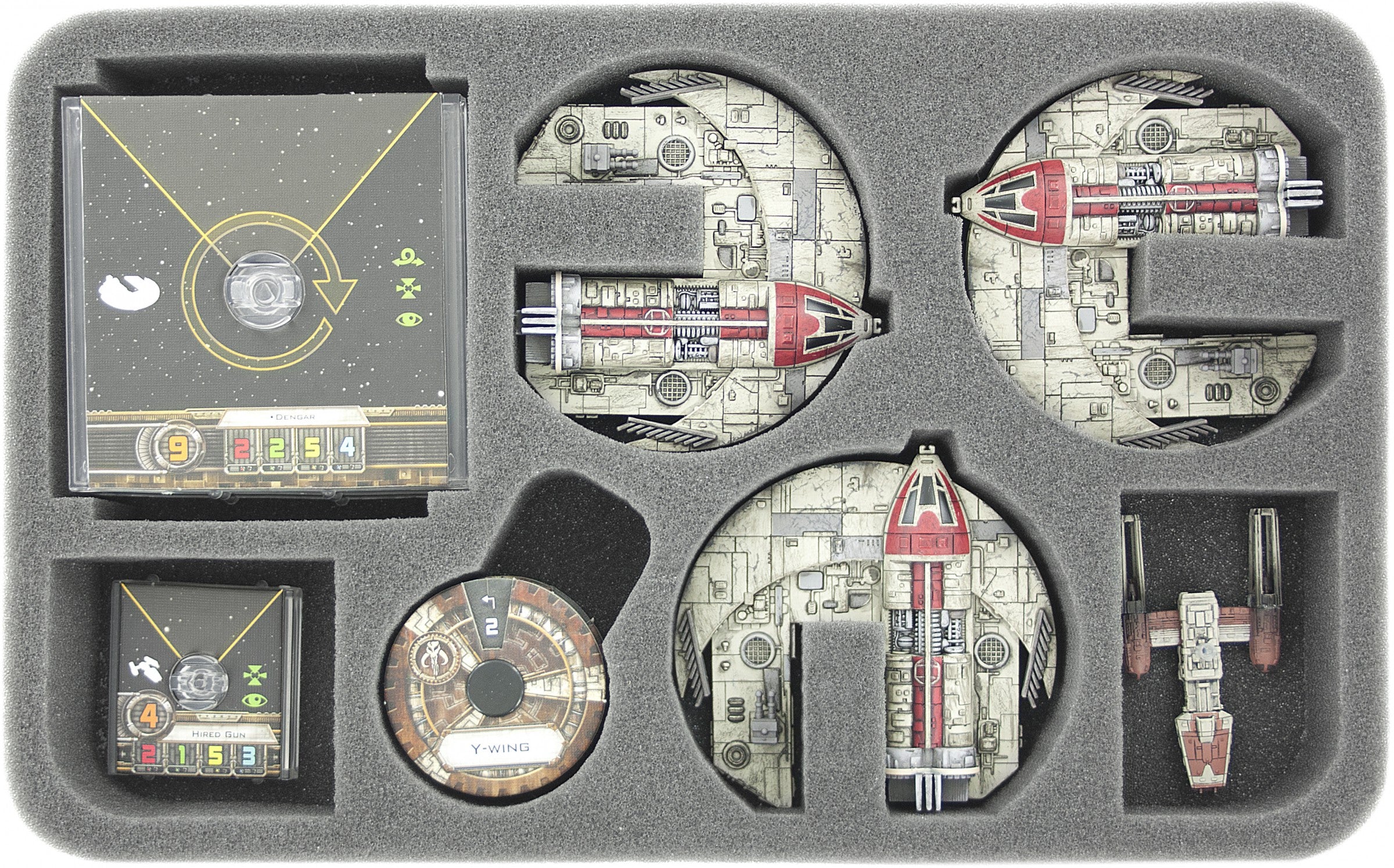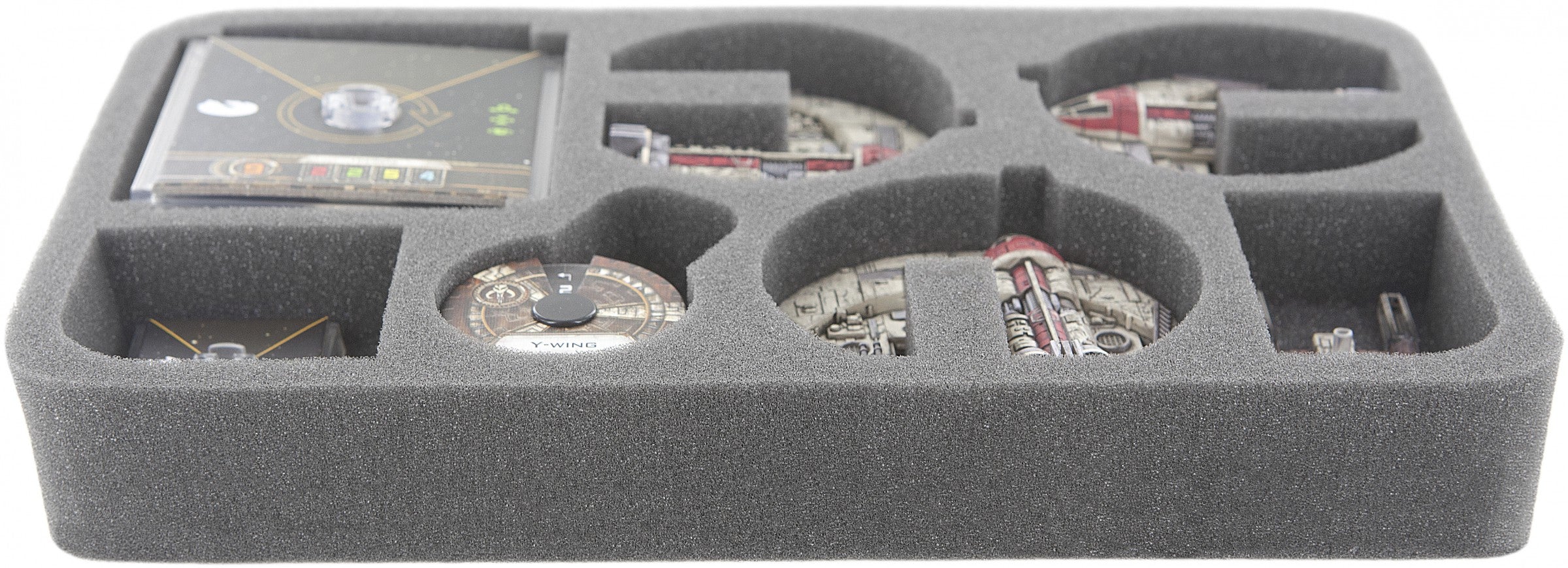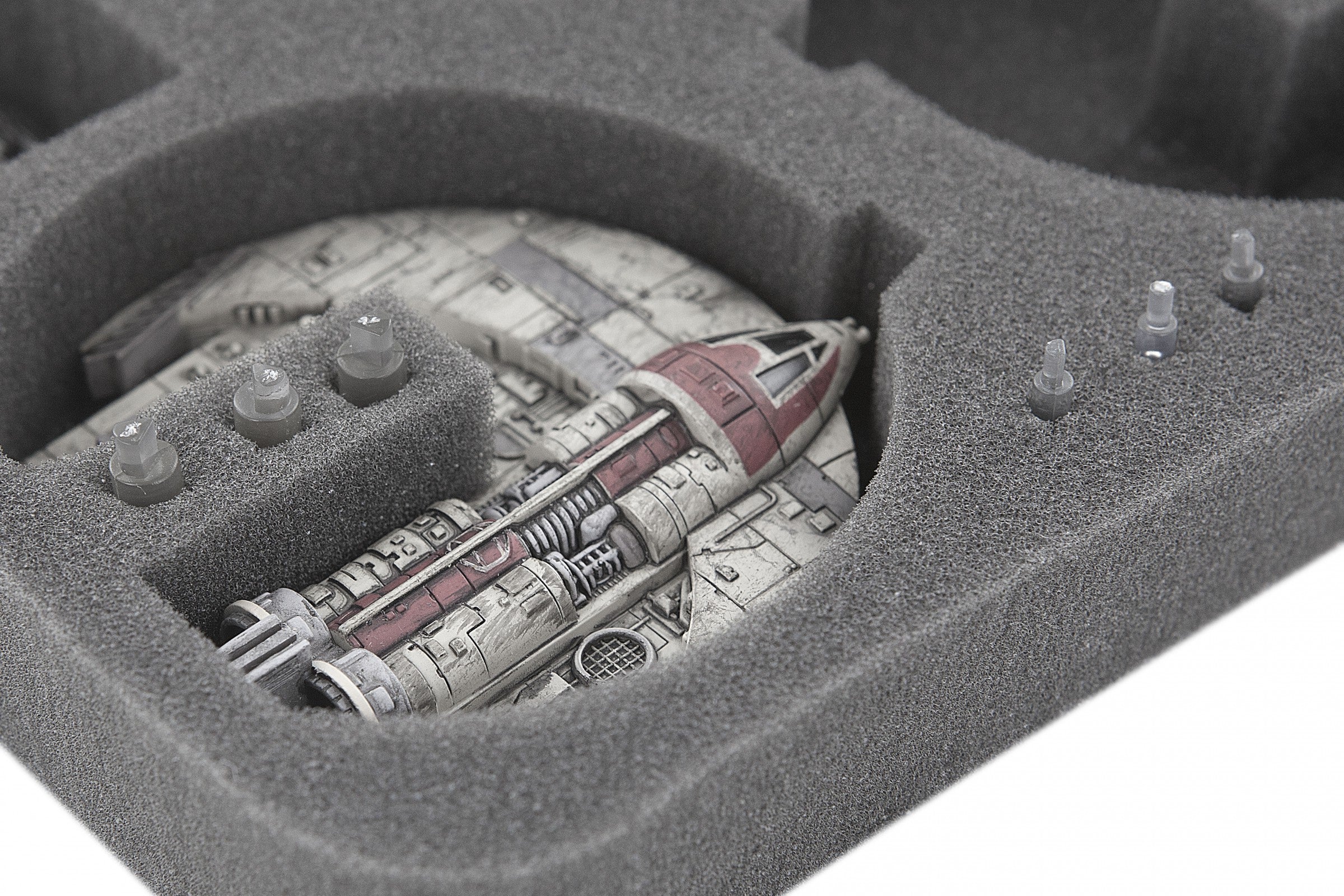 Specjalnie na Gwiezdne Wojny X-Wing Punishing One - taca z pianki. W tej intarsji znajdź trzy bezpieczne miejsce dla JumpMastera 5000. Dodatkowo nadal zmieści się do dwóch myśliwców w tacy z pianki. Oczywiście, taca z pianki oferuje nawet miejsce na akcesoria. Podstawę można zatopić w wyznaczonych szczelinach poprzecznych.