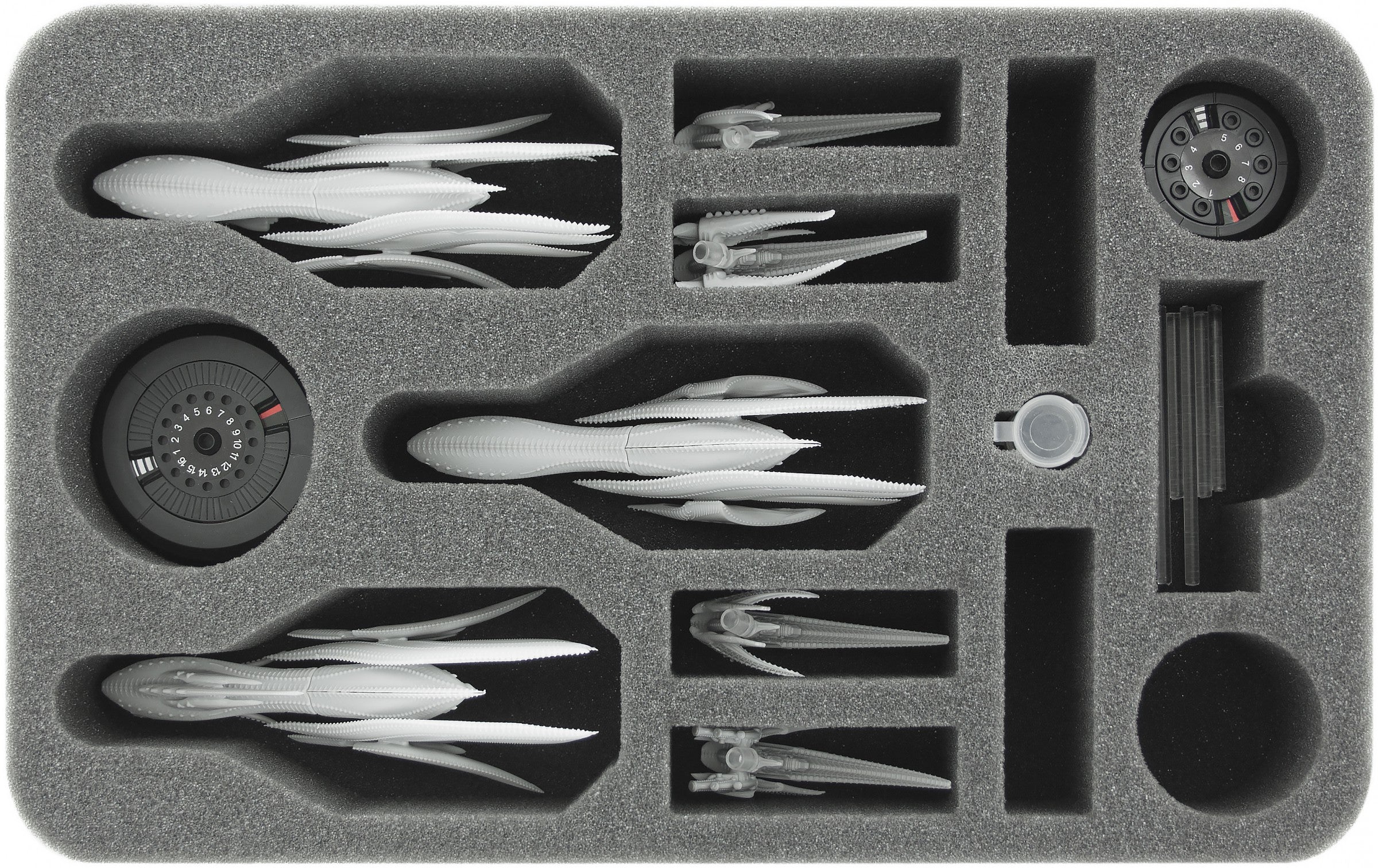 The foam tray provides space for 3 Cruisers and 6 Frigates. On the tray there are 5 additional compartments for playing material. In addition a FREE capsule for the damage pegs included!