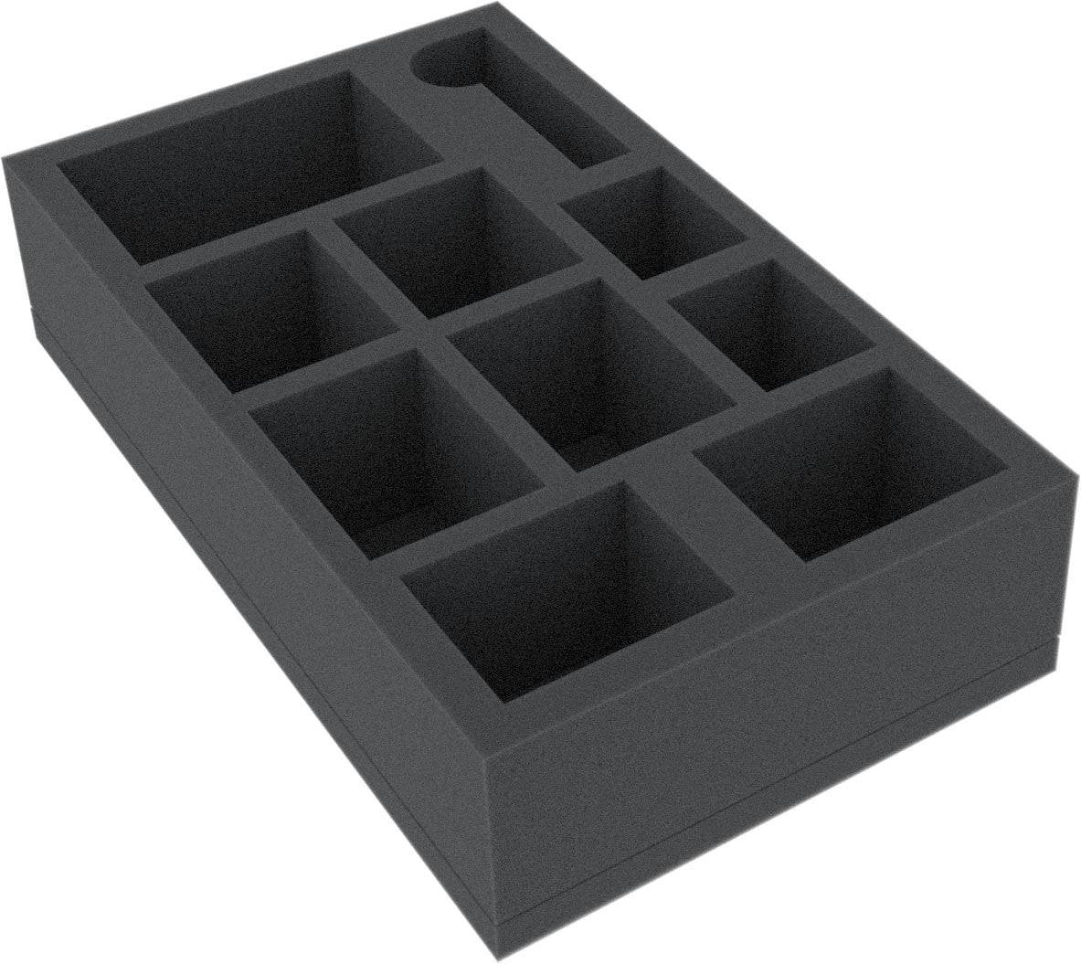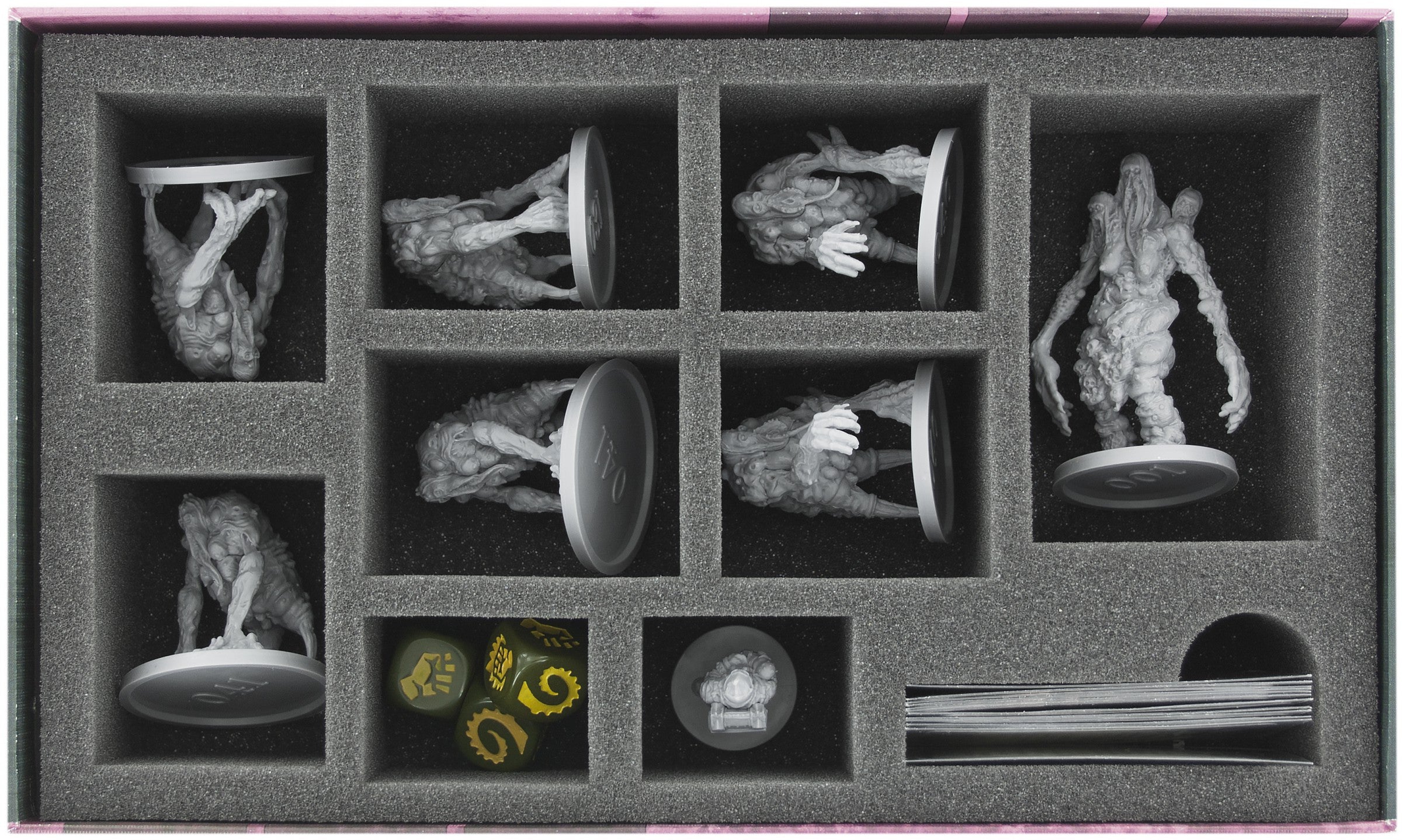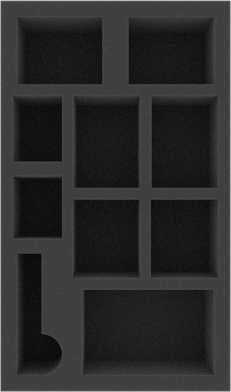 Foam insert for the small Sin box. The insert is 238 mm x 140 mm x 55 mm and comes with a matching topper. There is enough space for 6 Abominations, 1 Avatar and 1 Comtroller, as well as the cards (with or without sleeves) and accessories.