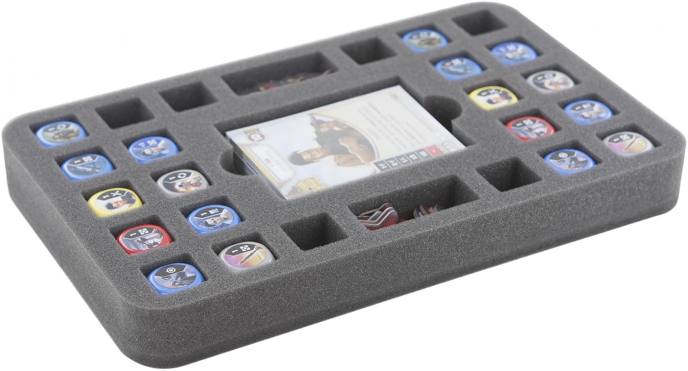 - 12 x 30 mm foam tray for 24 dice, 35 cards in sleeves and tokens