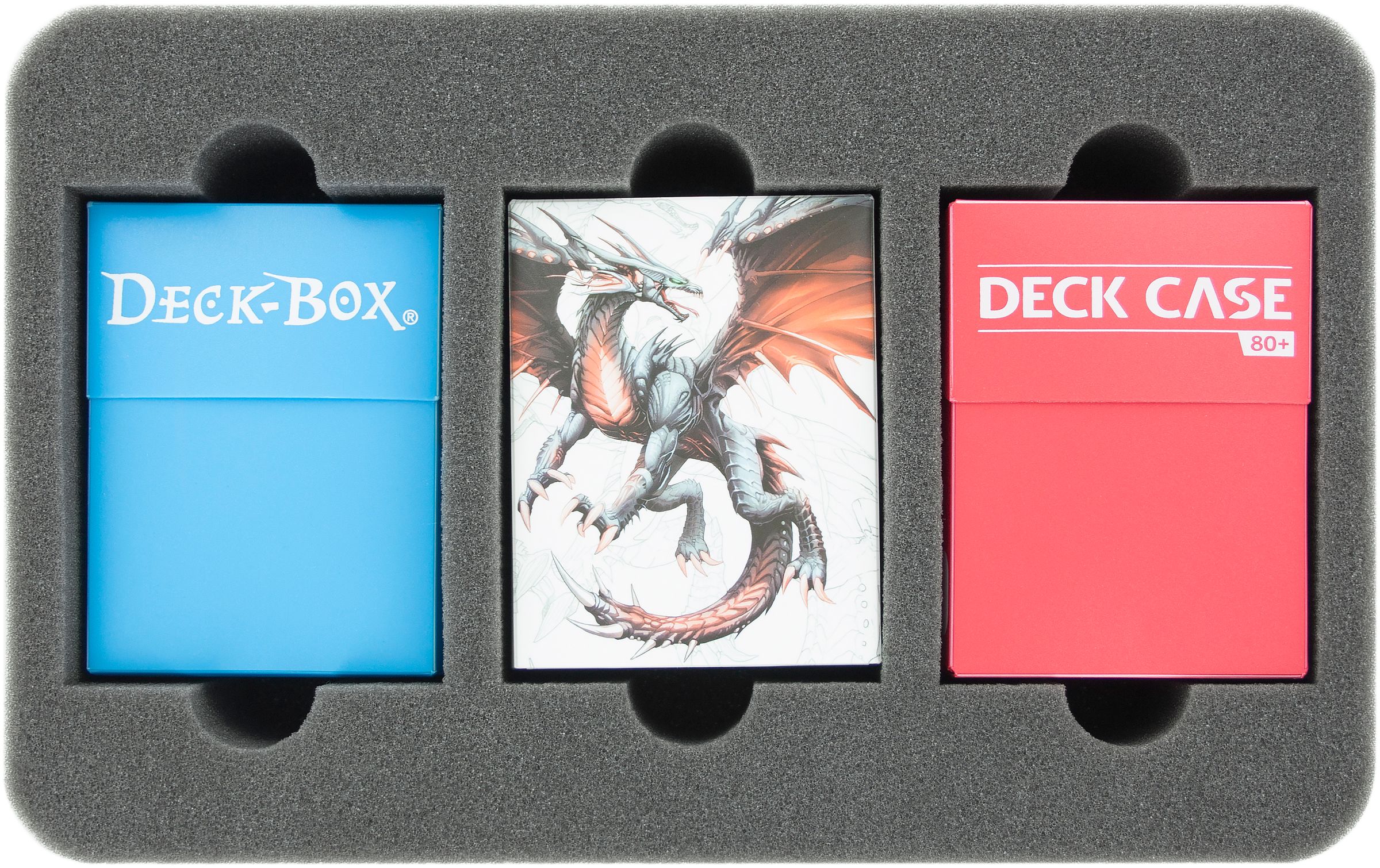 The insert for the deck boxes is divided into 3 compartments. In each compartment fits one standard deck box (e.g. from Ultra Pro, Ultimate Guard). If you want to store the cards directly without the box in the tray, you have space for about 100 cards with sleeve and about 200 cards unsleeved.