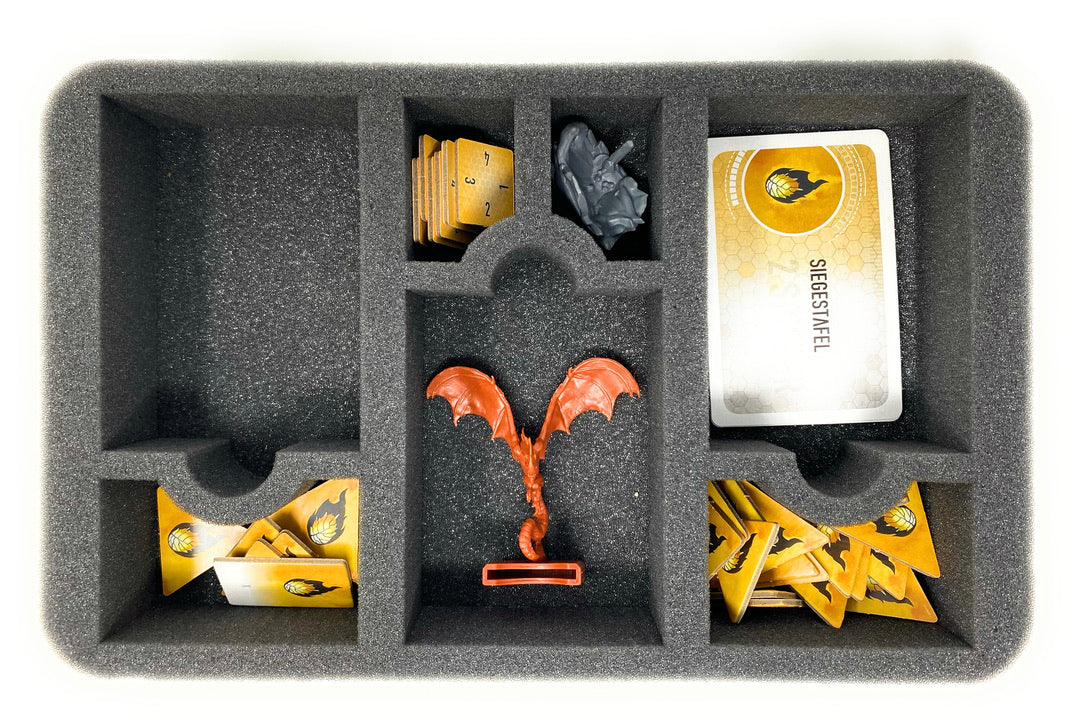 Further, game material such as plastic tokens can be accommodated in the remaining compartments of the trays and with the included Pre-cubed foam. Here, you can customize the compartments to suit your needs by simply removing the pre-cut foam pins and attaching the insert to the matching foam base. This way, even bulky game material like the hexagonal Area Tiles can be neatly stored. Of course, game cards, overview cards and tokens also fit inside.