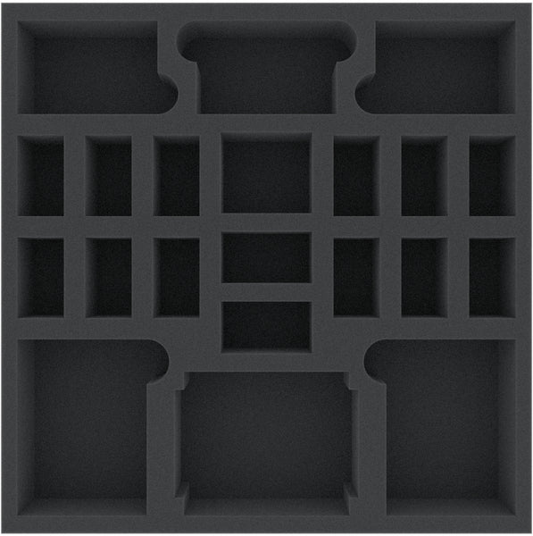 This 50 mm mm high foam tray is divided into 21 compartments. It is particularly suitable for the safe storage of tabletop and board game miniatures, as well as other fragile models and small parts.