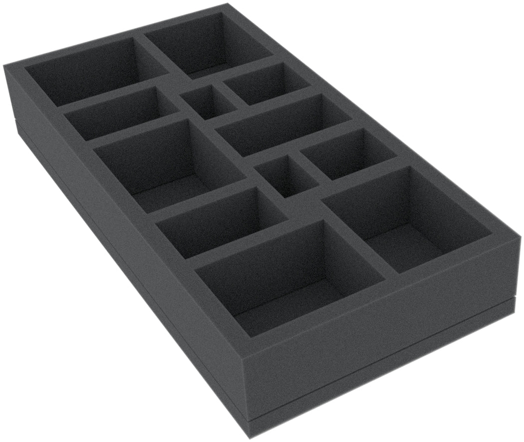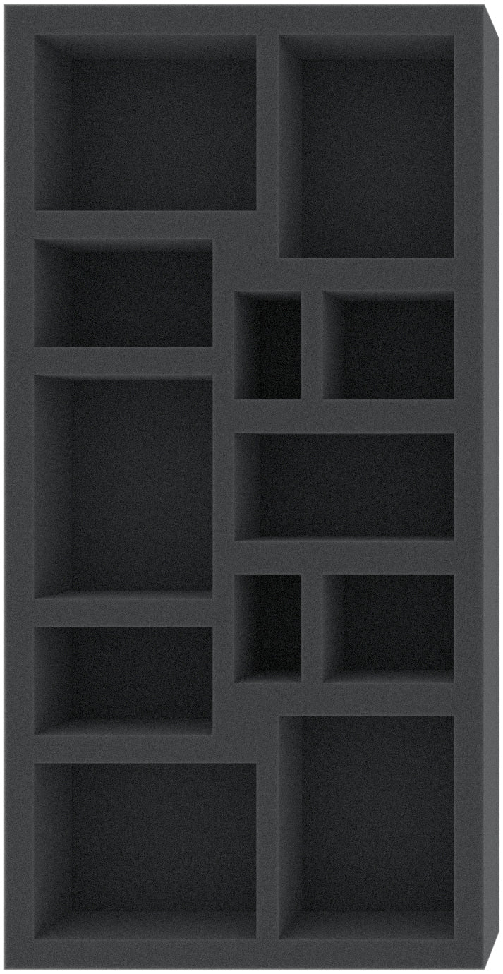 This 45 mm high foam tray is divided into 12 compartments. It is particularly suitable for the safe storage of tabletop and board game miniatures, as well as other fragile models and small parts.