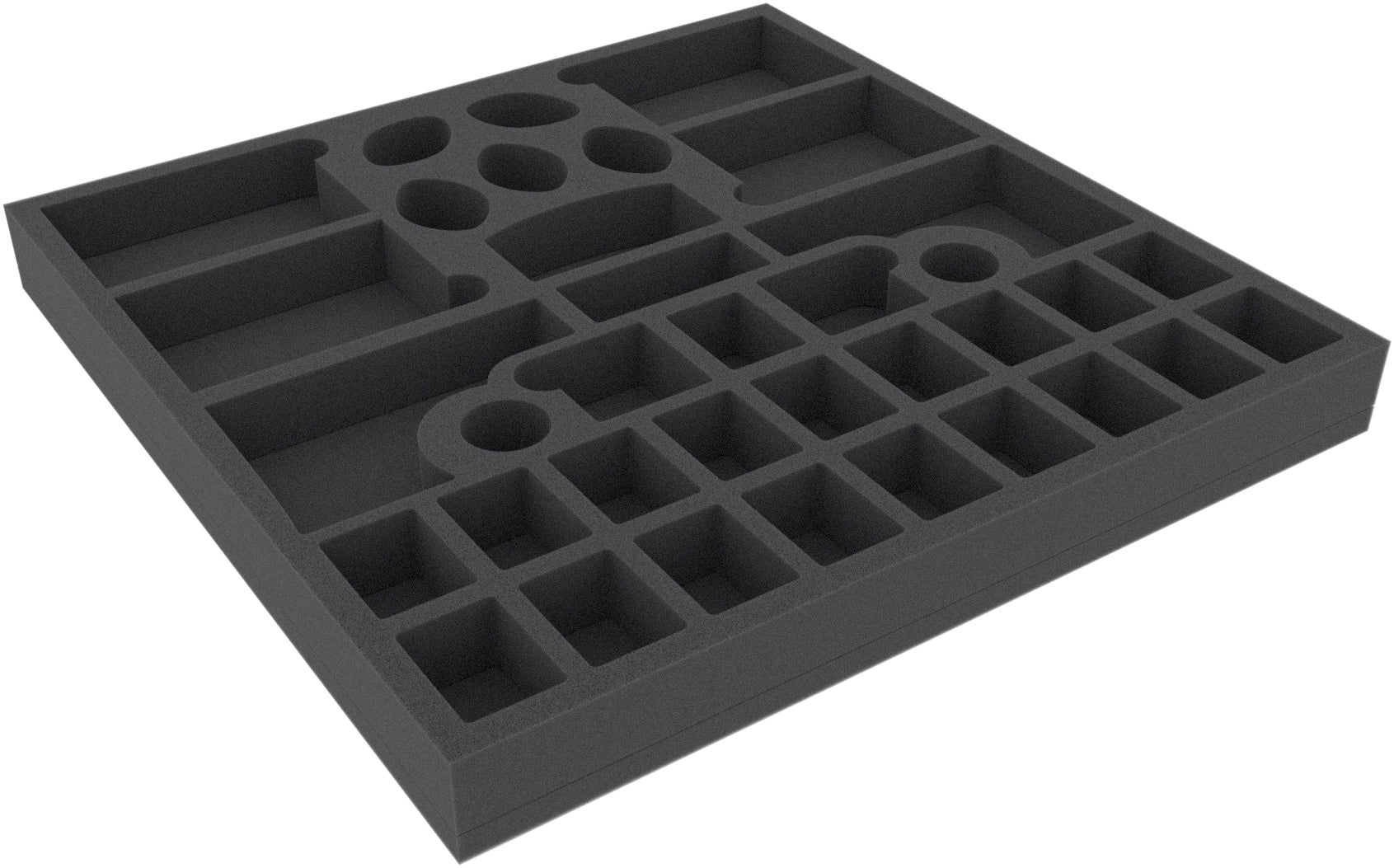 • The foam tray has the dimensions: 345 mm x 345 mm x 35 mm total height (25 mm usable height + 10 mm foam base)