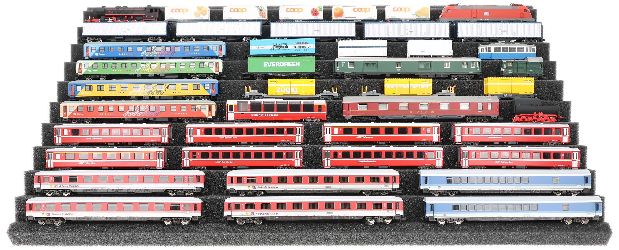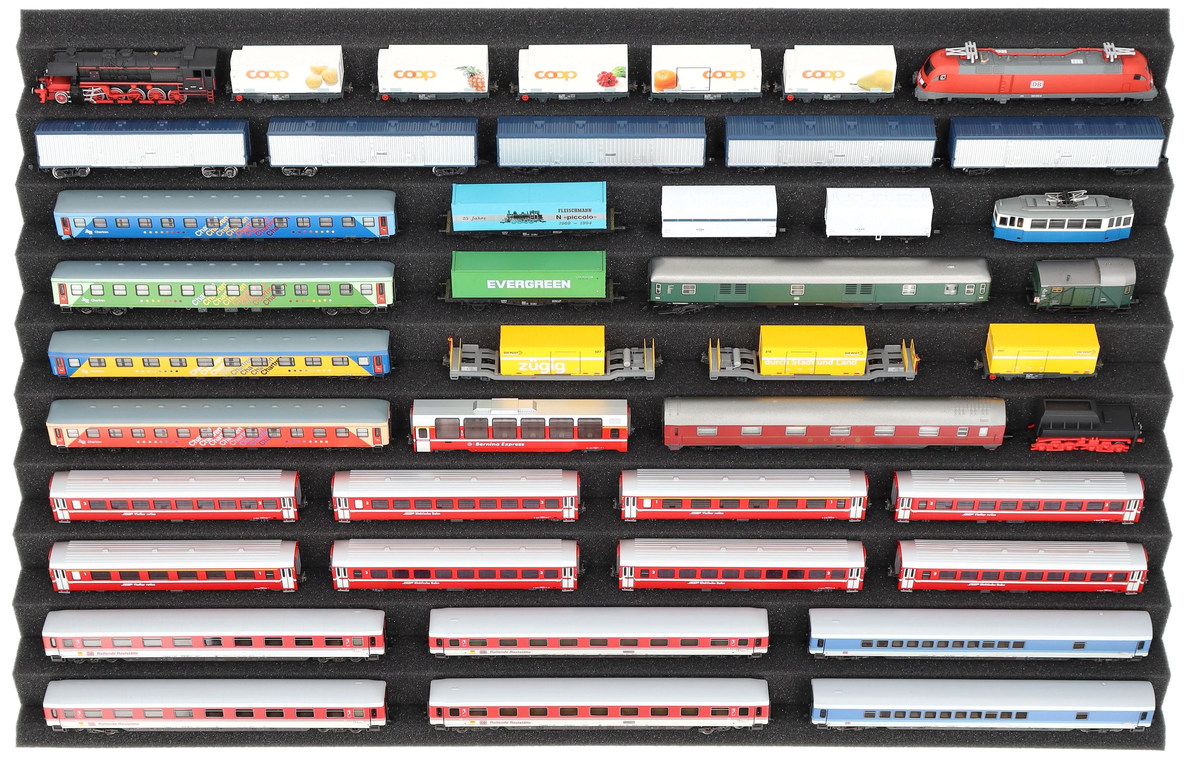 Ten compartments, tailor-made for model railways in gauge N, offer your locomotives and wagons reliable protection for storage and transport.