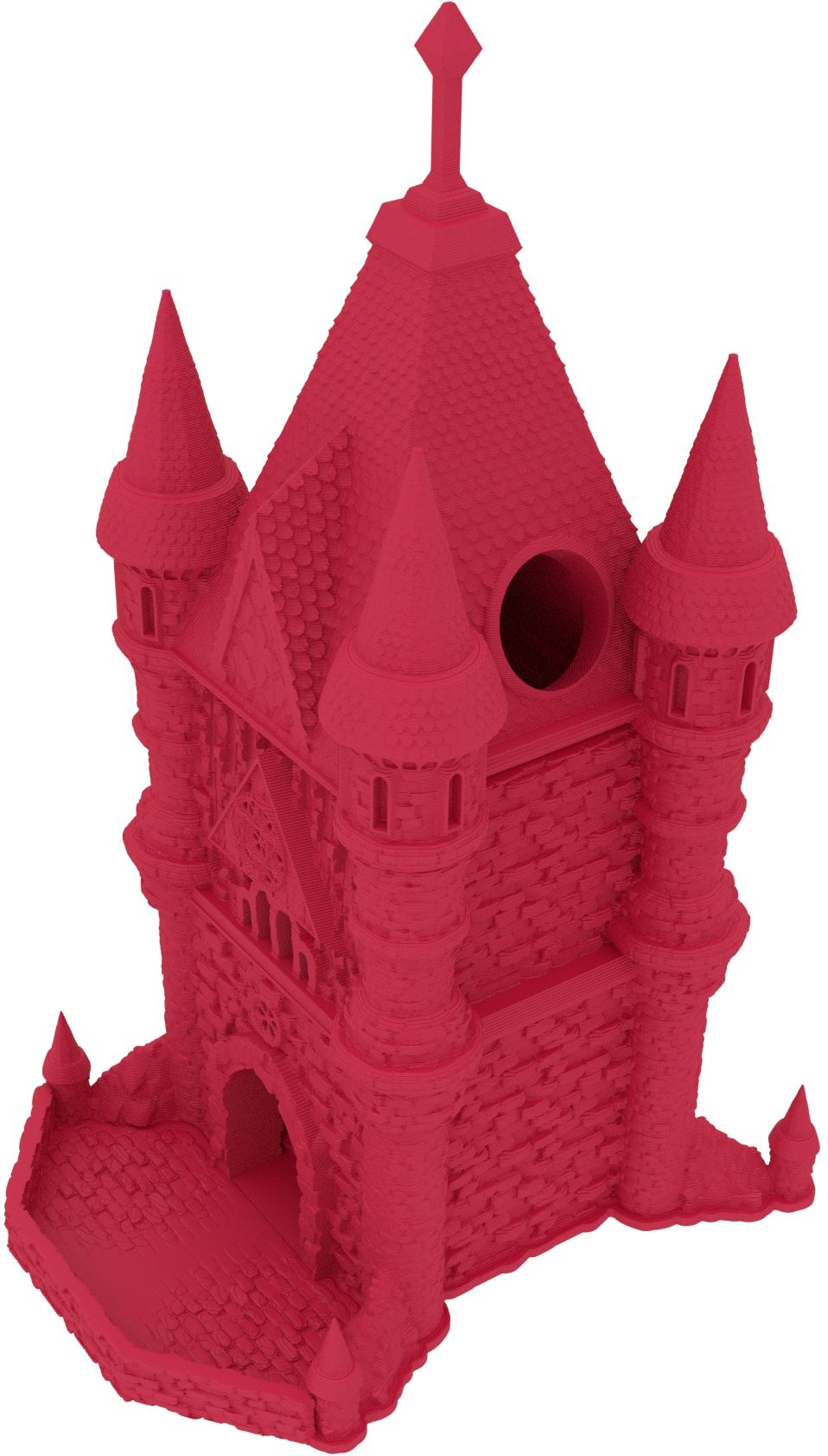 3D printed - detailed dice tower, with removable roof and exchangeable dice tray. The Dice Tower can also be used as a terrain part for your miniatures game or as a center piece for your next DnD session.