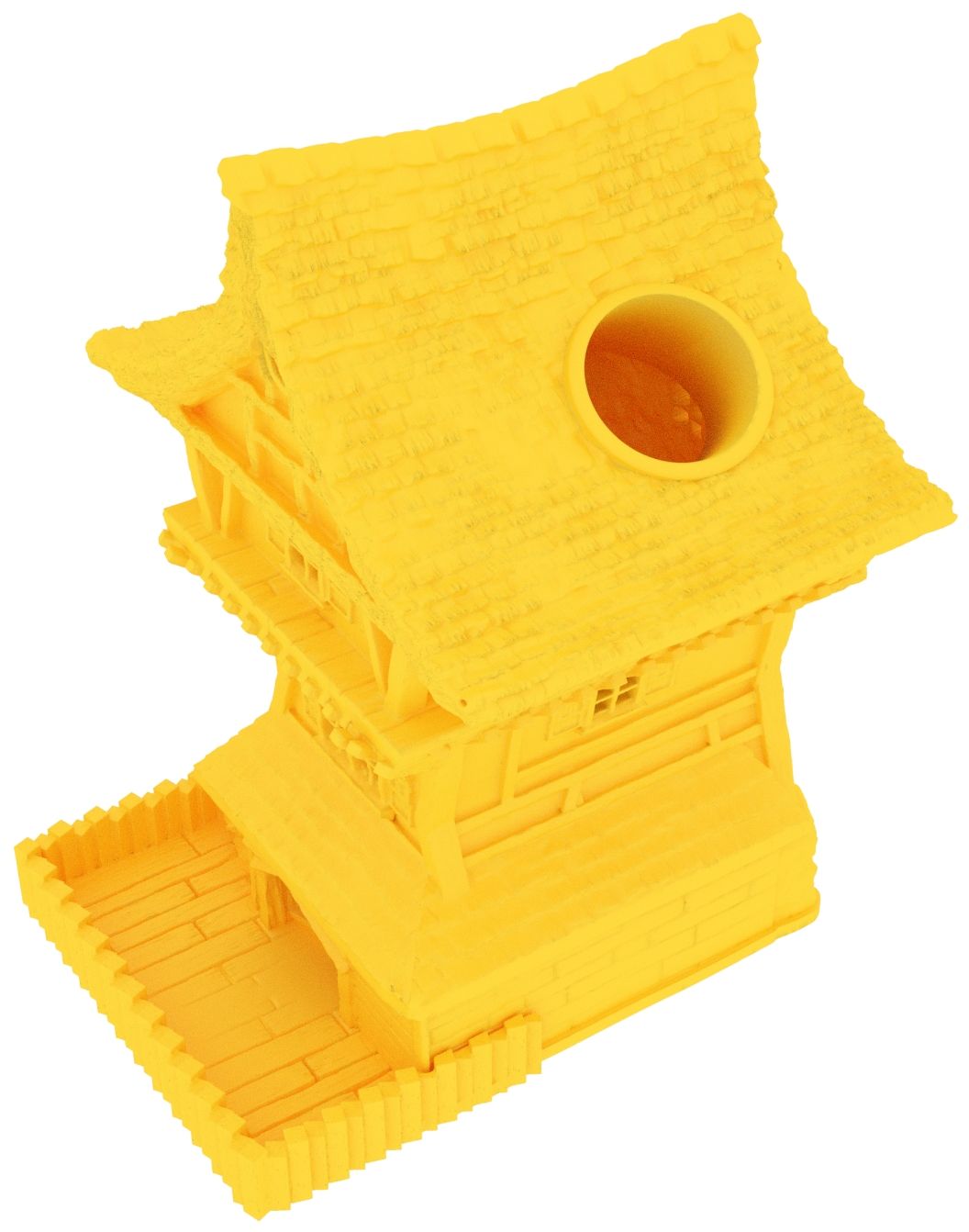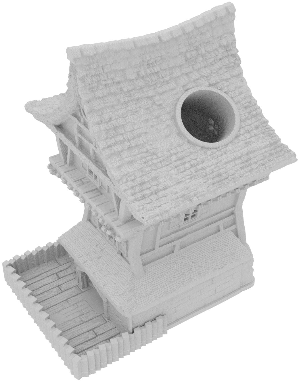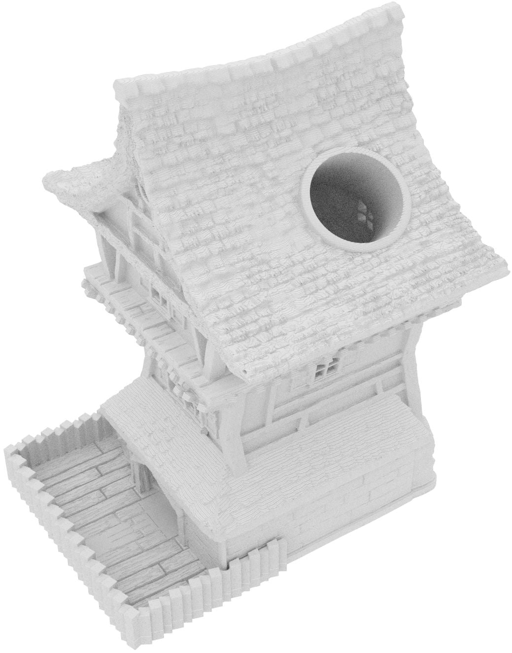 3D printed - detailed dice tower, with removable roof and exchangeable dice tray. The Dice Tower can also be used as a terrain part for your miniatures game or as a center piece for your next DnD session.