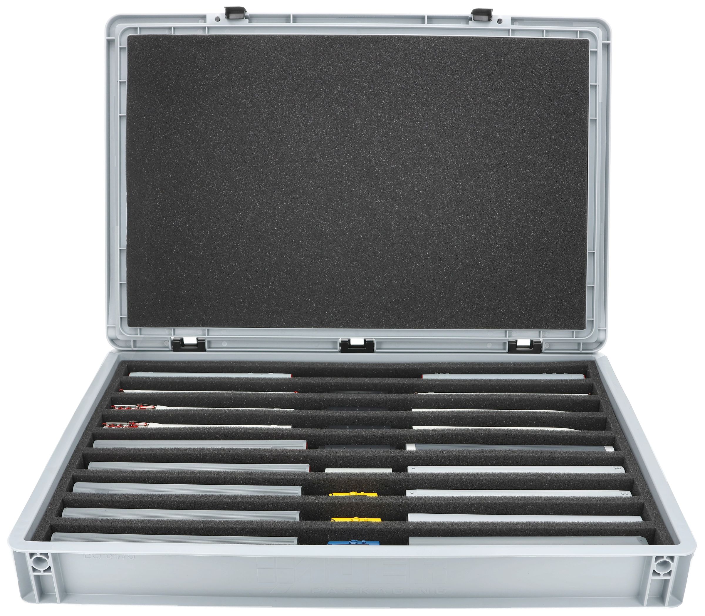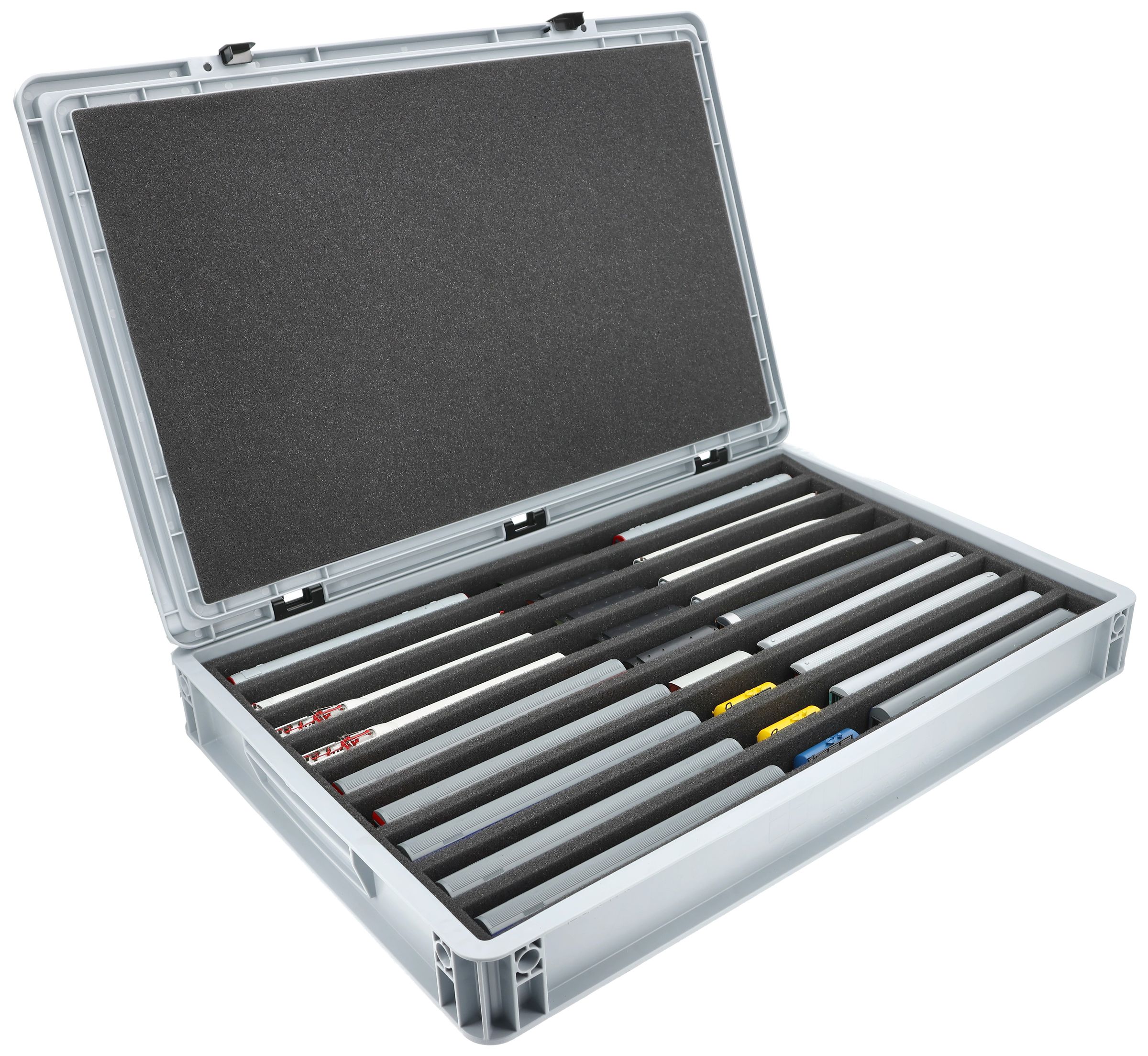 The 9 equal-sized compartments (each approx. 550 x 30 x 40 mm) are specially designed for TT scale models. Depending on their length, locomotives and wagons can be placed side by side. The exact fit ensures that the models are securely fixed and do not slip during transport.