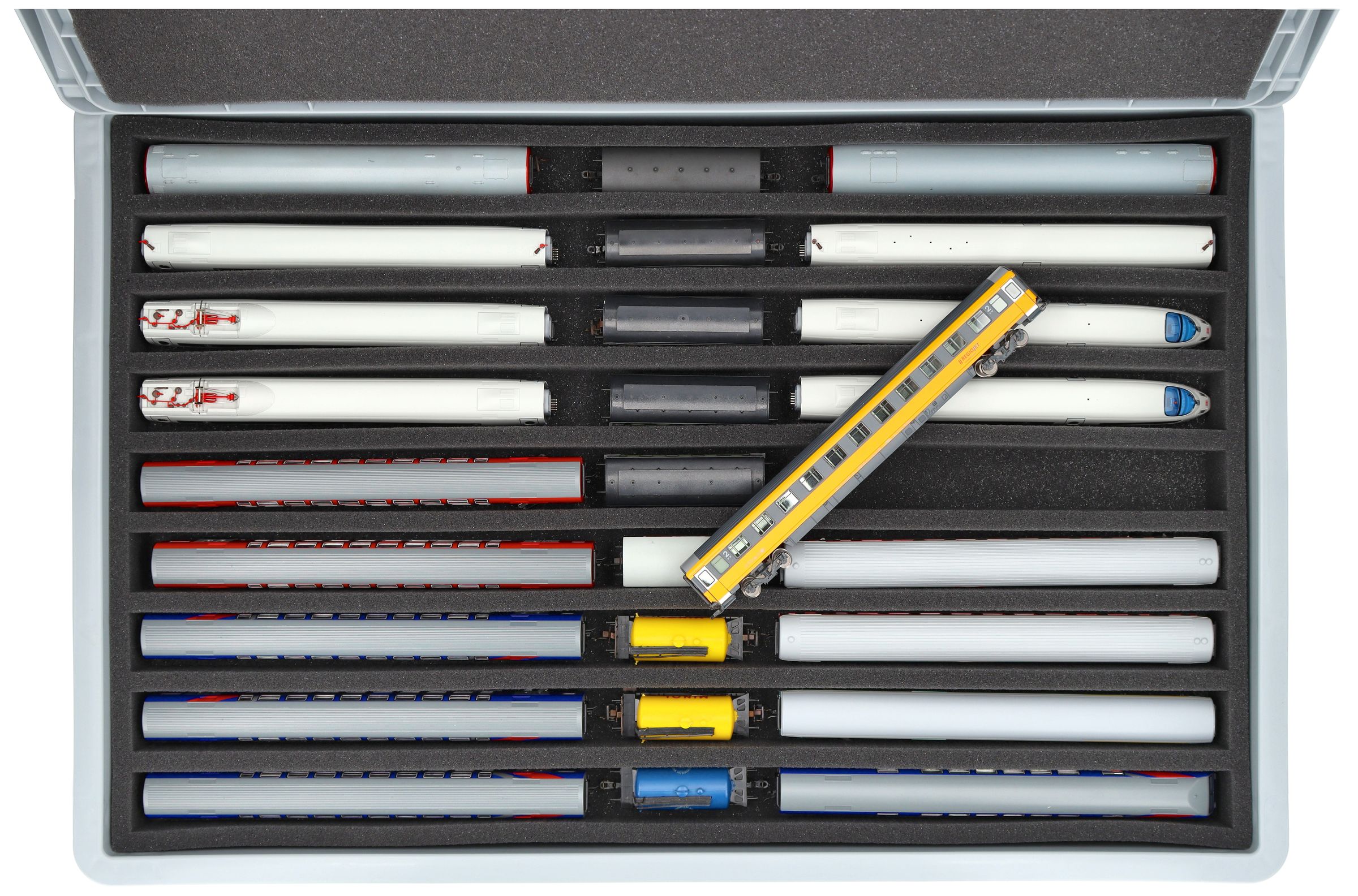 - 9 compartments - foam insert for upright storage of locomotives, wagons and vehicles