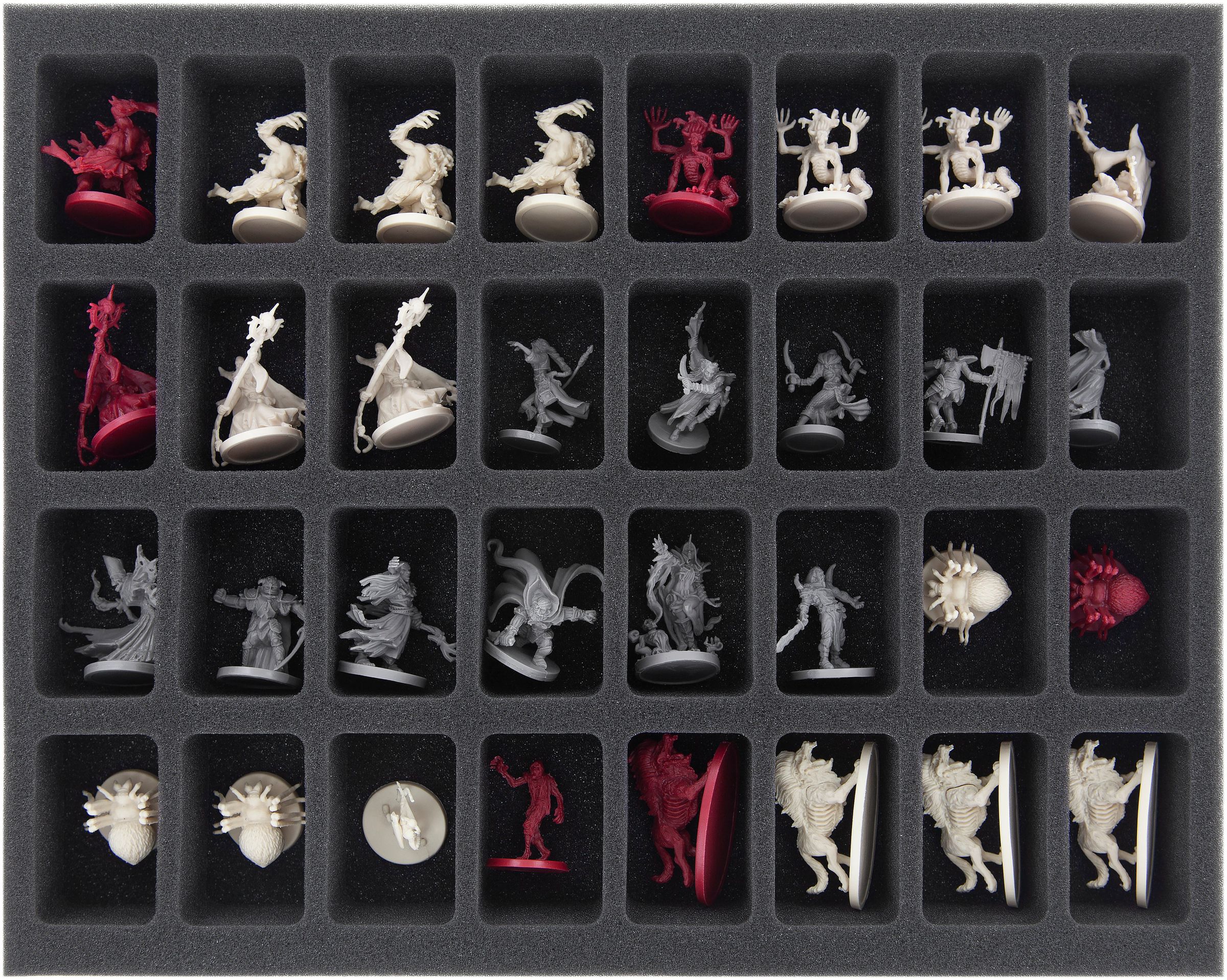 The foam tray has 32 compartments which will hold up to 32 miniatures of various board games and Tabletop systems. The fine-pored foam reliably protects your figures – fragile parts remain intact, the color of painted models remains unharmed.