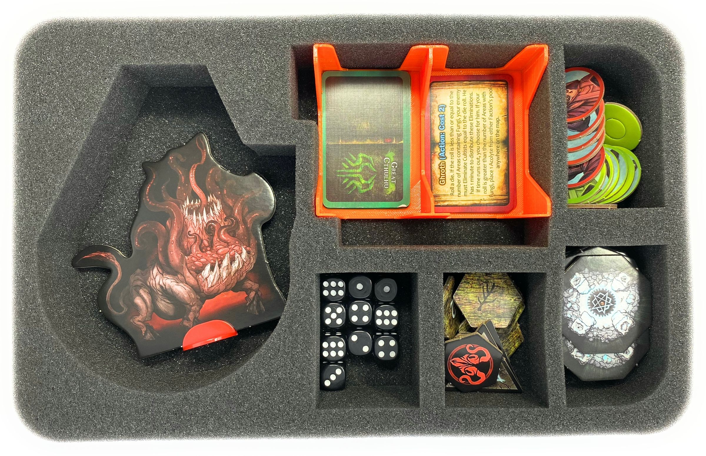 • 1 Half-Size foam tray with 6 compartments + 1 plastic card holder for faction cards, dice, tokens and 1 cardboard stand incl. plastic stand of Shub-Niggurath (HSBH050BO + 60432)